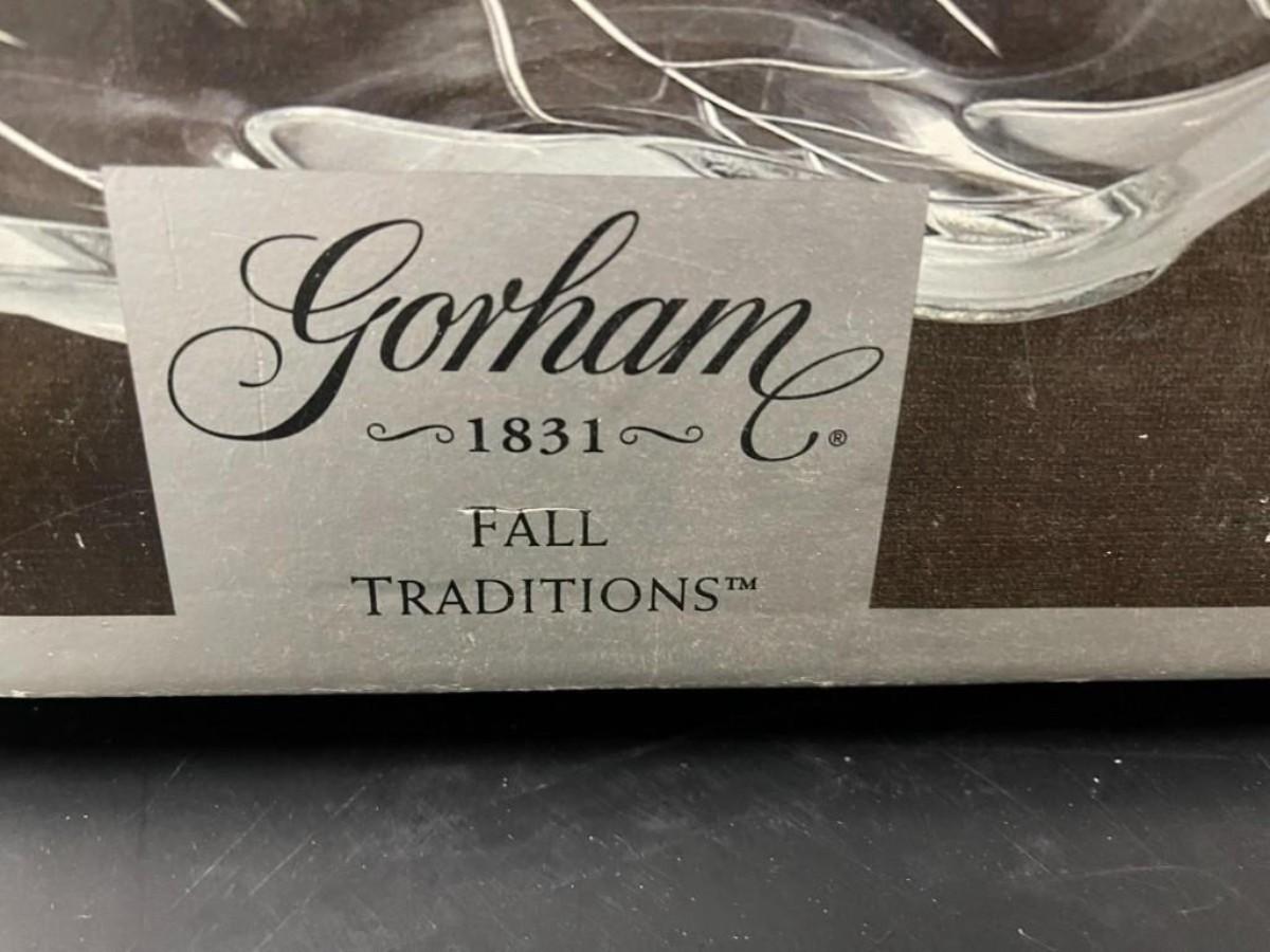 <strong>Gorham Fall Traditions Harvest Bounty Crystal Leaf Dish.</strong><br /> Dish is in new condition and comes in original box. Box is in rough<br /> Condition: Used<br /> Size: 13&#34; x 17&#34;