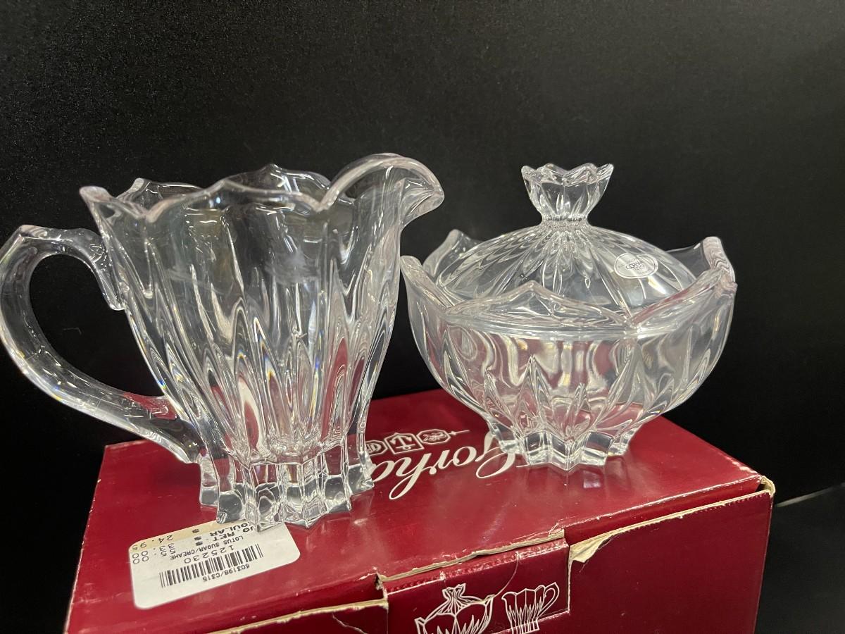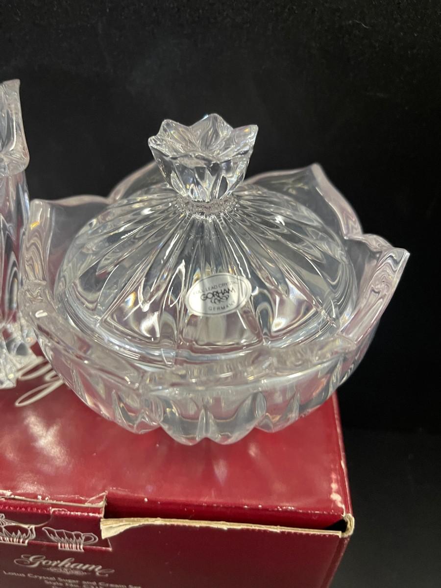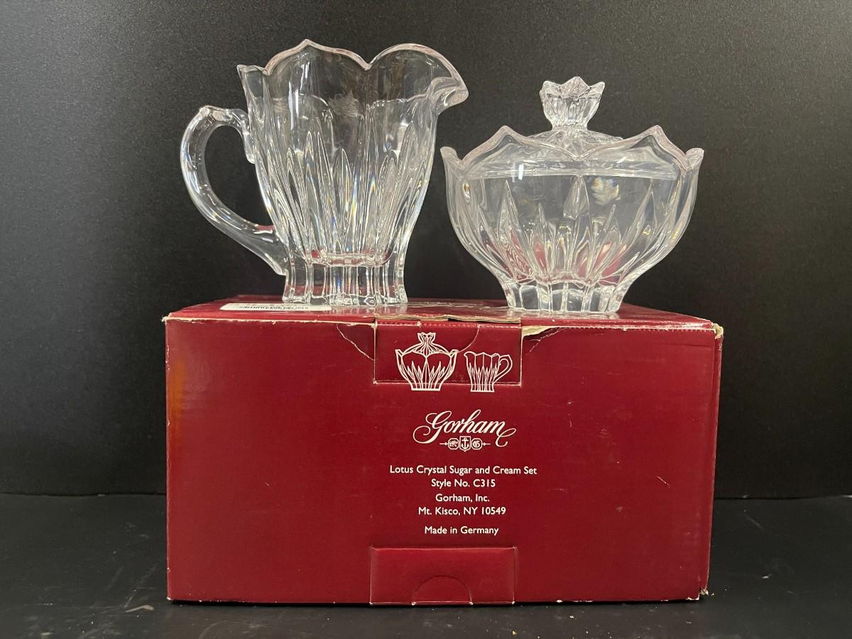 Gorham lead crystal sugar and cream set, Lotus pattern. Made in Germany. Excellent, like new condition. Comes in original box, but box shows wear. # 1176