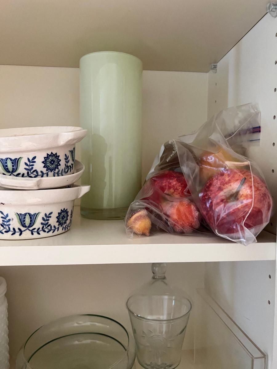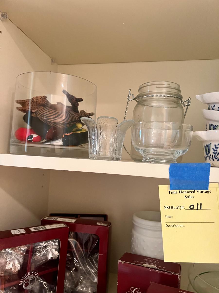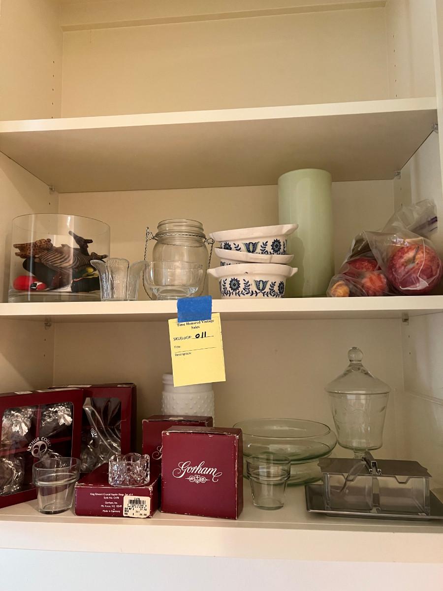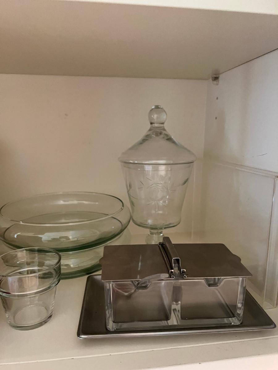 Vase, blue white baking dishes, covered clear candy dish, relish tray. Faux fruit.