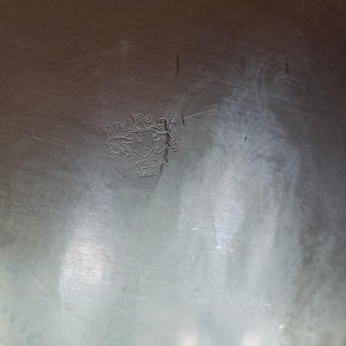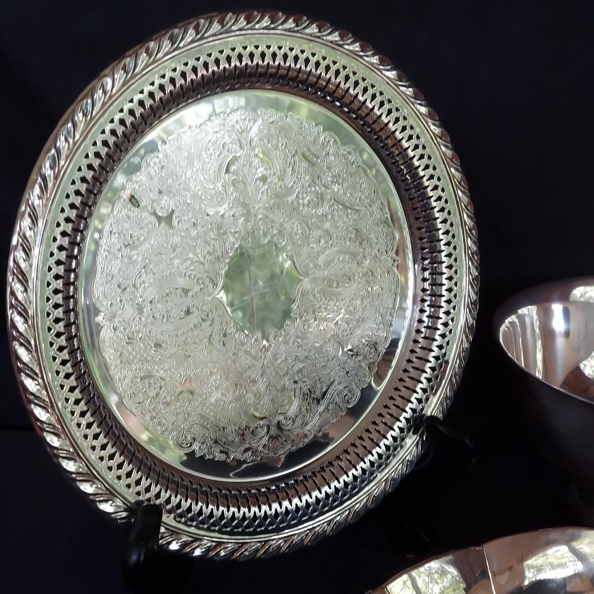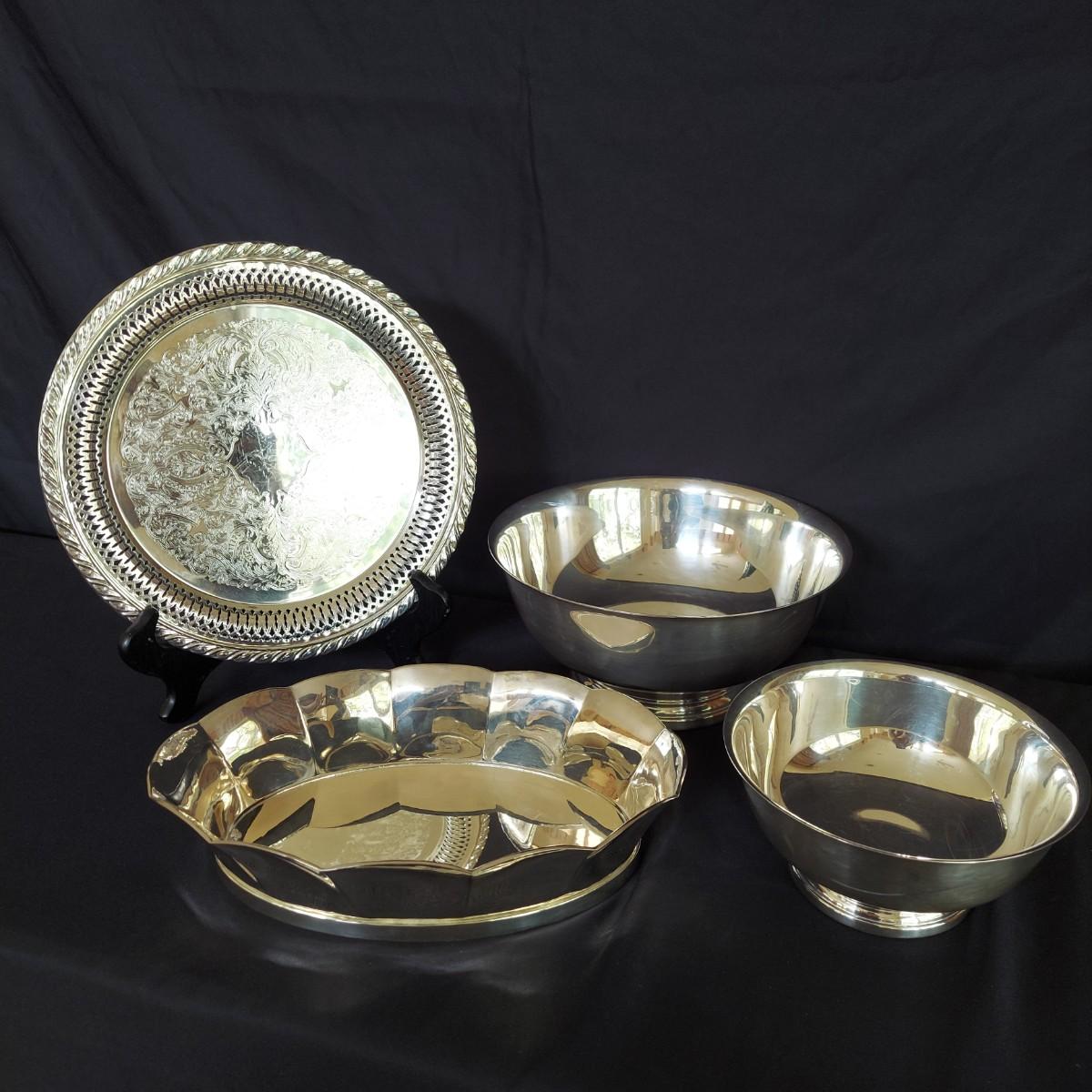 Four pieces of silver serving ware by Gorham, Oneida and Godinger. They appear to be silver plated. The large round platter measures 10.5" across. Shipping available