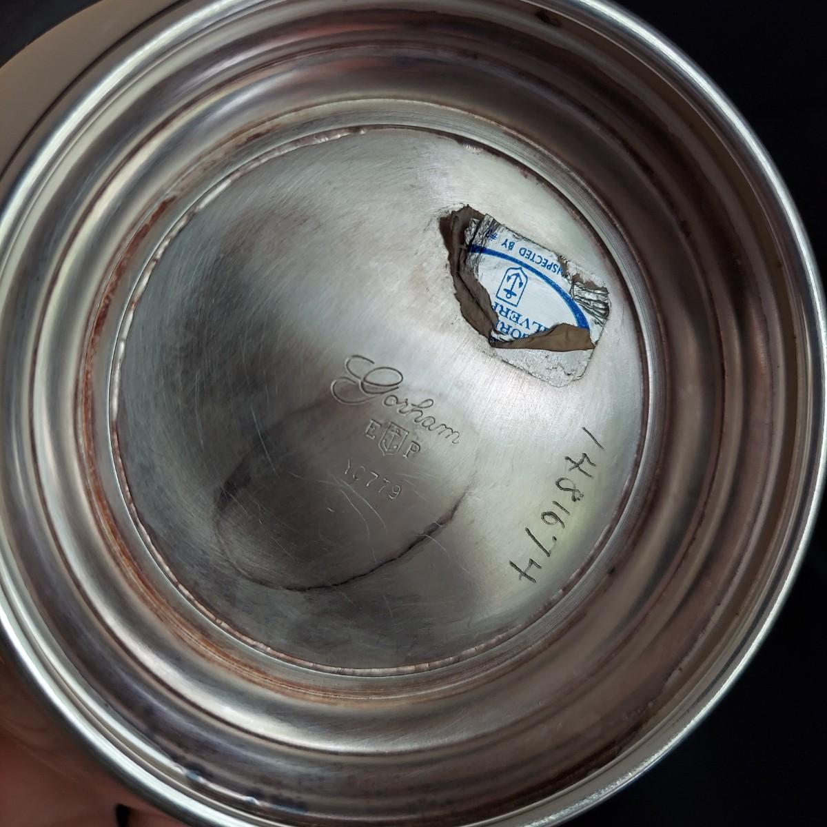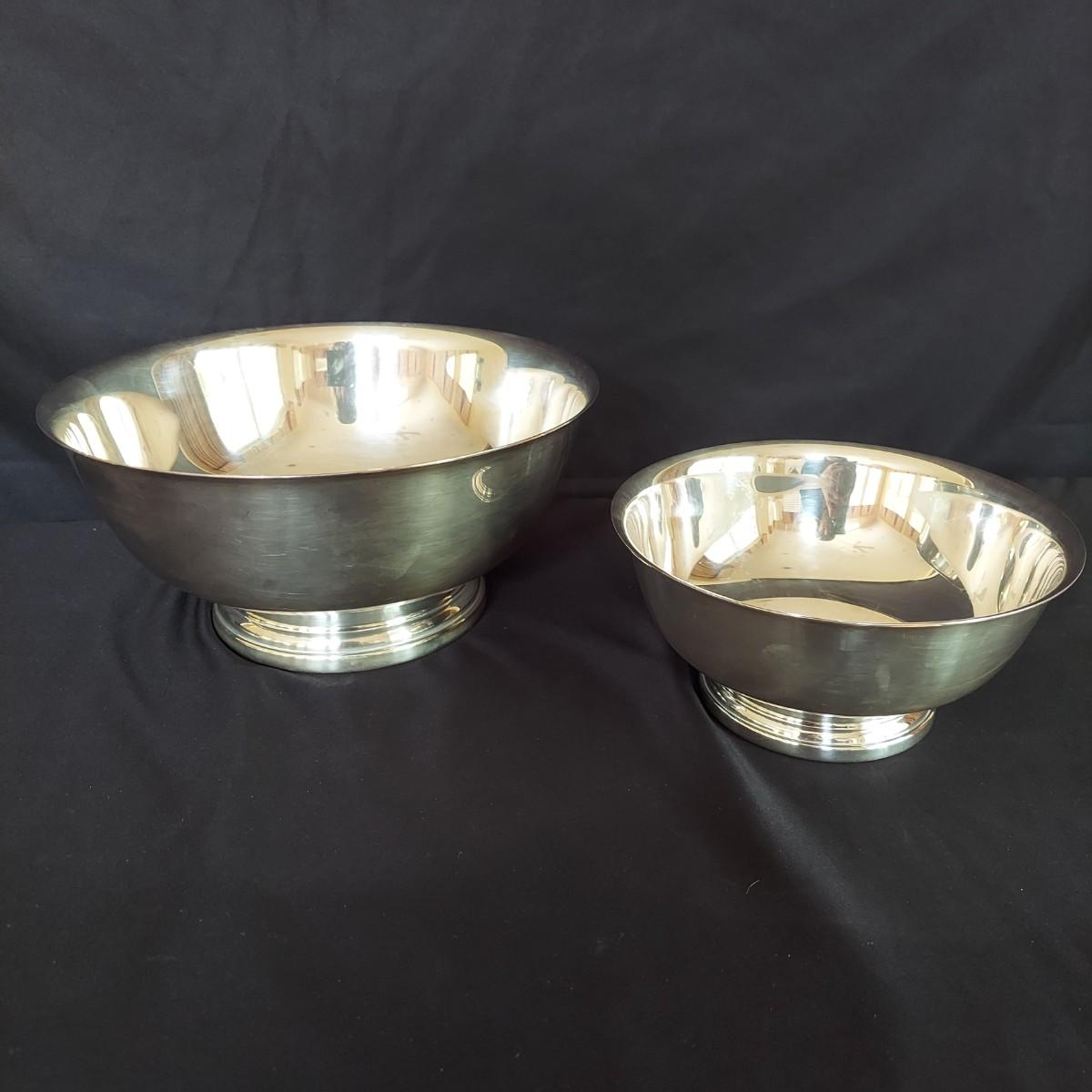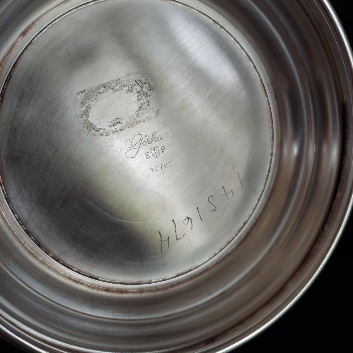 Four pieces of silver serving ware by Gorham, Oneida and Godinger. They appear to be silver plated. The large round platter measures 10.5" across. Shipping available