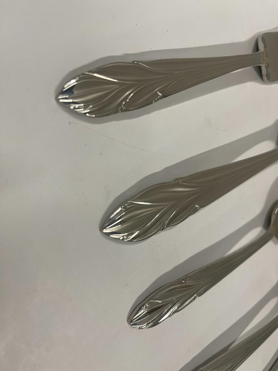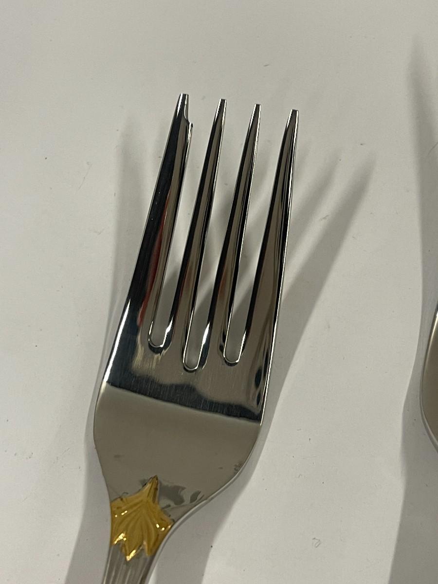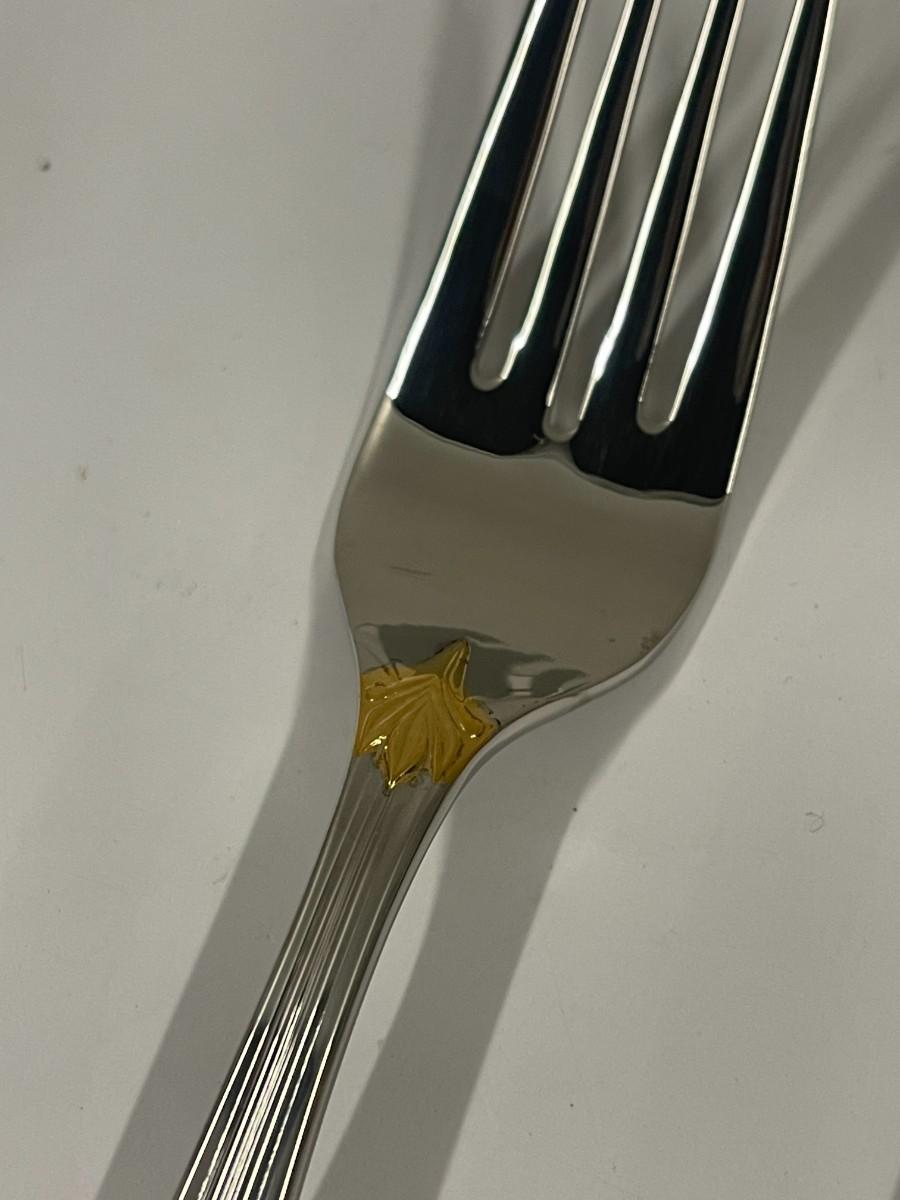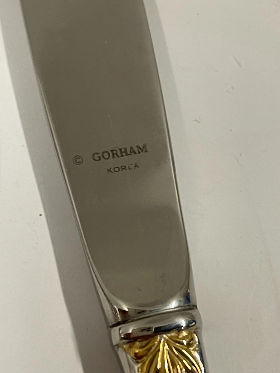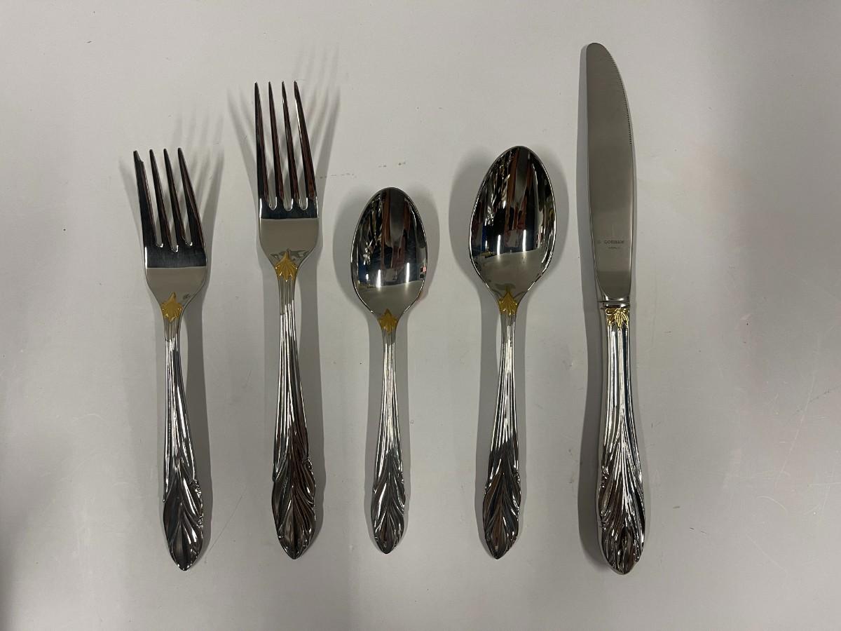 Gorham Open Stock Stainless Flatware Set Service For 12 - 60 Pieces. Set includes: 12 each of teaspoons, tablespoons, salad forks, dinner forks and butter knives. Each is stainless with a gold accent. All brand new and in original plastic (except for the 5 pieces removed from the bags for photographs). # 1481