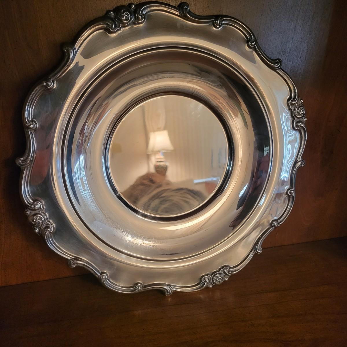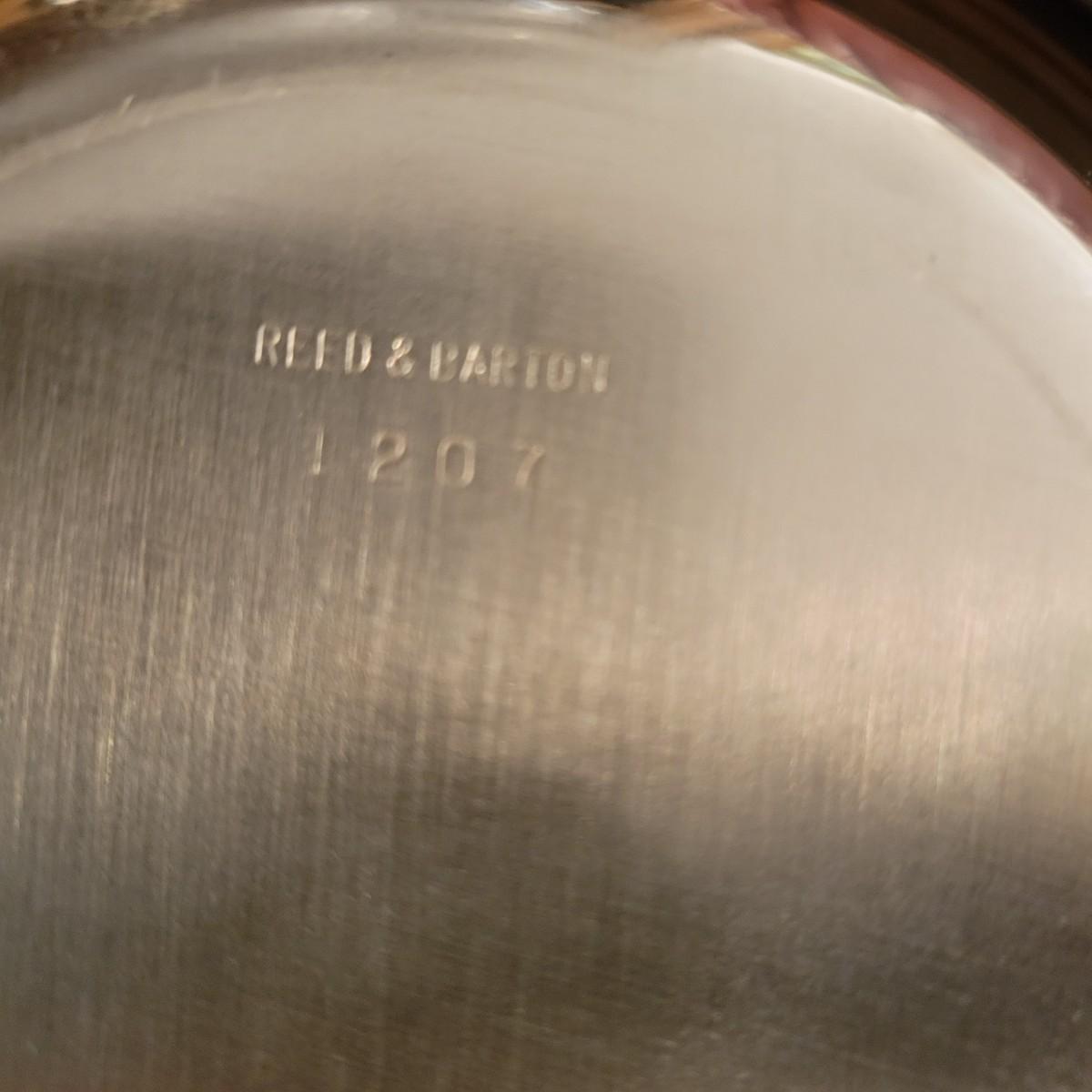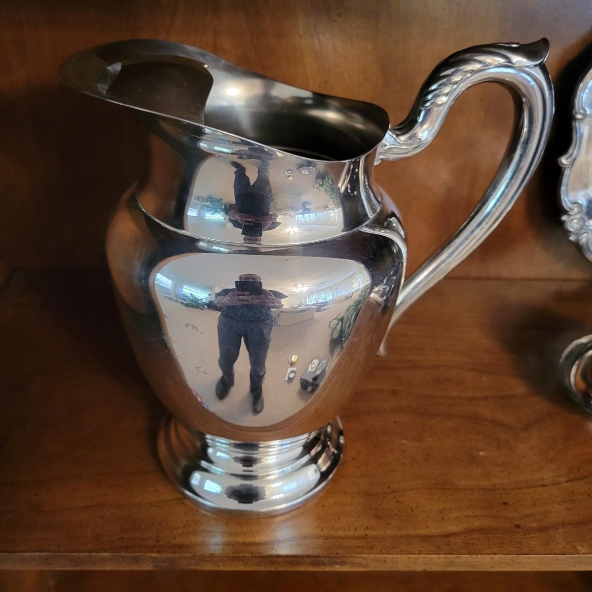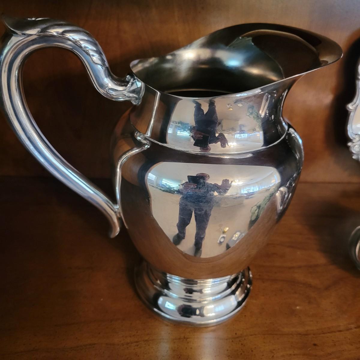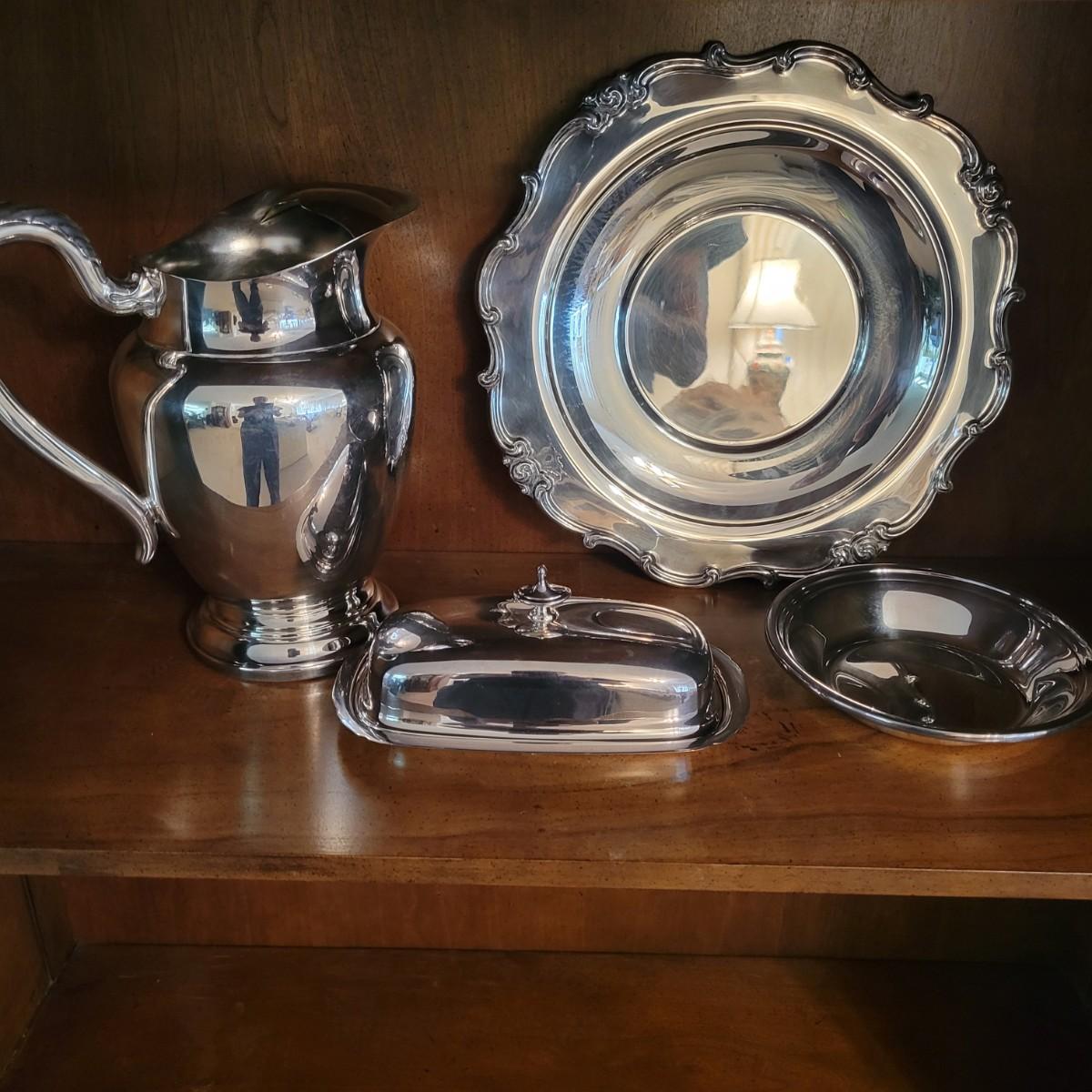 An assortment of plated silver pieces by Gorham, Reed and Barton, and WM A Rogers. The butter dish and smaller bowl are both manufactured by Reed and Barton. Larger plate with a decorative edge is manufactured by Gorham and measures approximately 11.5"D. The pitcher is manufactured by WM A Rogers and measures approximately 8.5" x 5" x 9"H. Shipping available. Shipping can be costly. We suggest contacting our preferred local shipping provider, Postage Express, with dimensions and getting an estimate before bidding: (828) 670-5501 or postageexpress@yahoo.com.