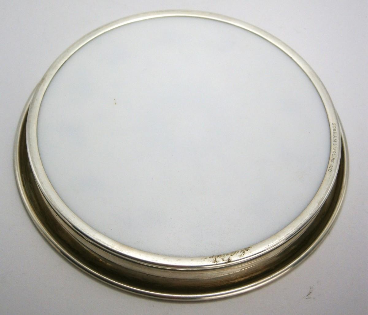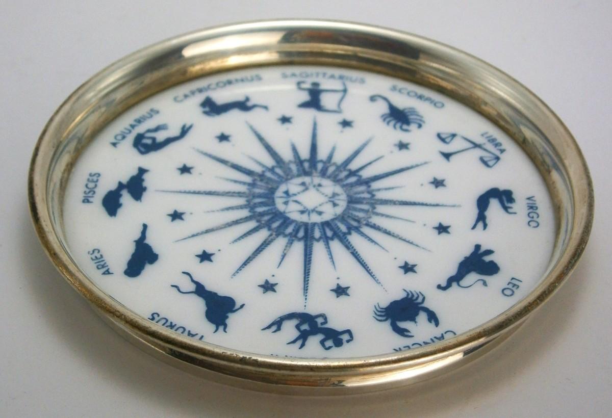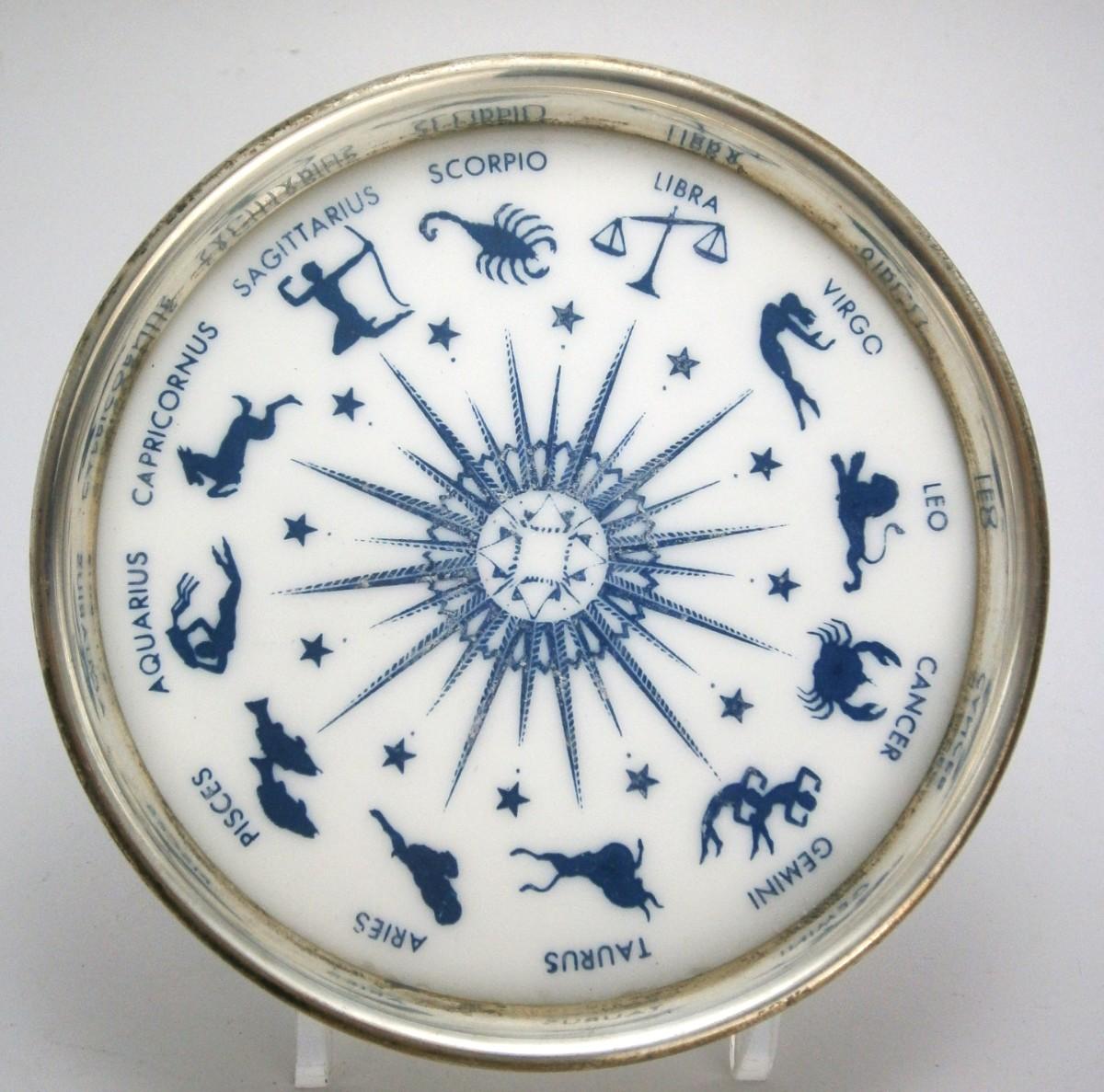 Vintage Gorham Silver Coaster Depicting Astrological Zodiac Signs, porcelain with sterling silver rim, measures 4 in. in diameter.