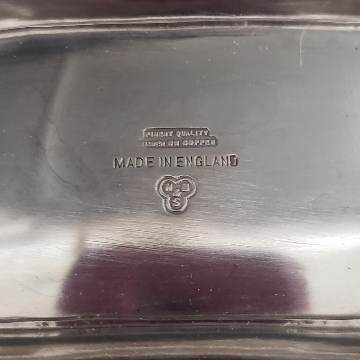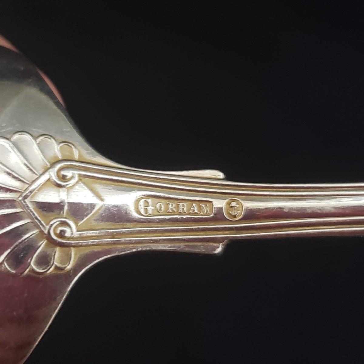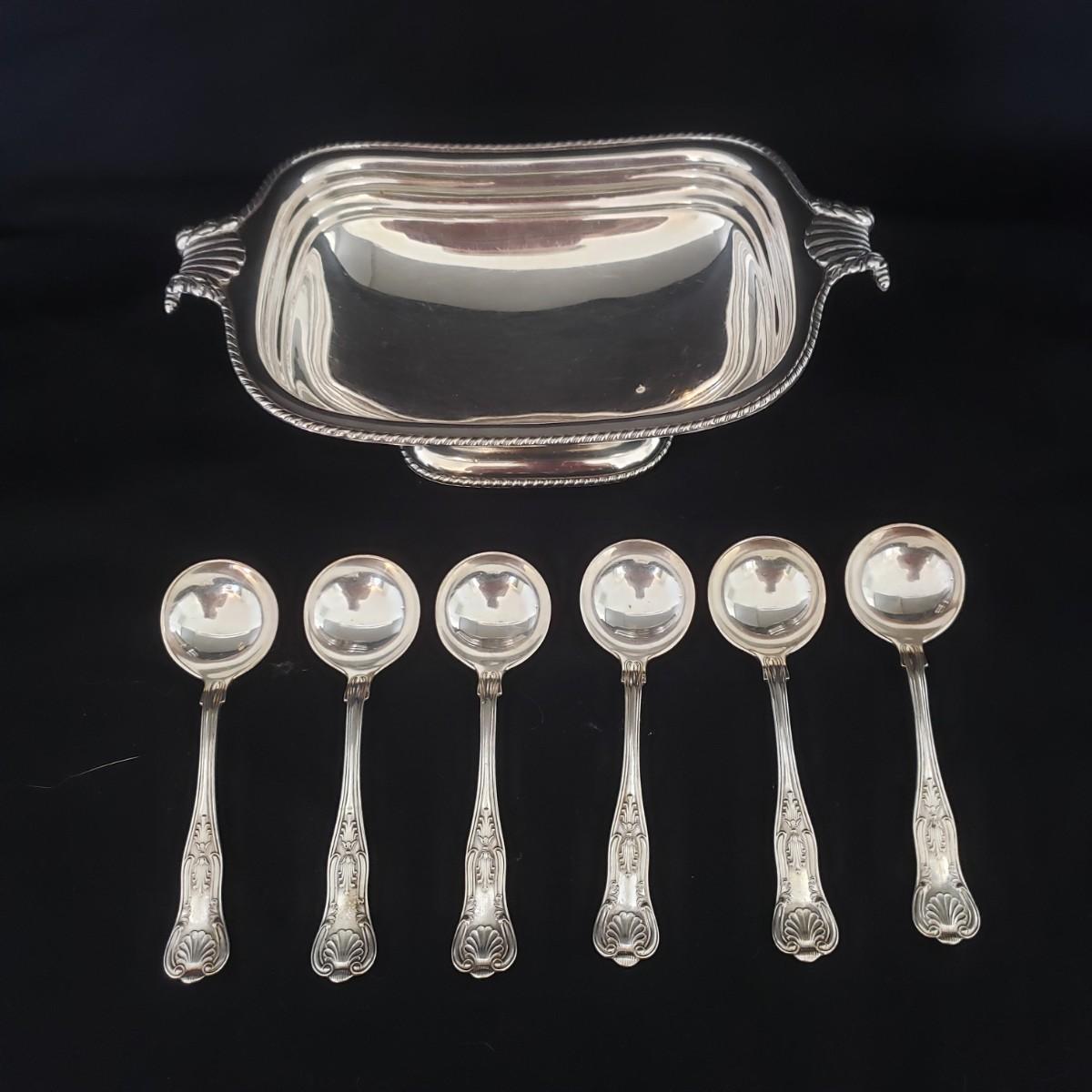 This lot features six Gorham silver plate spoons. Each spoon measures approximately 5". The serving bowl is silver on copper made in England and measures 9" x 6" x 3"H. The bowl does have a dent mark inside, see picture.