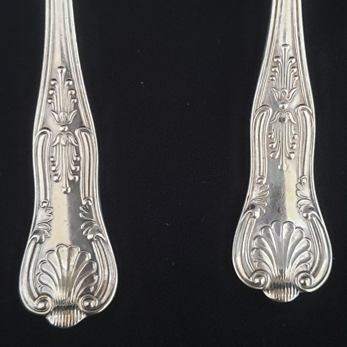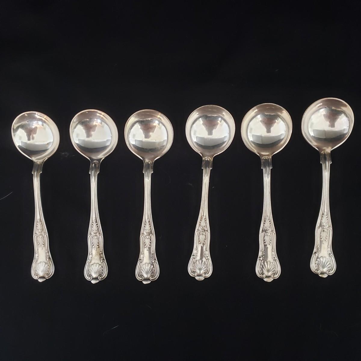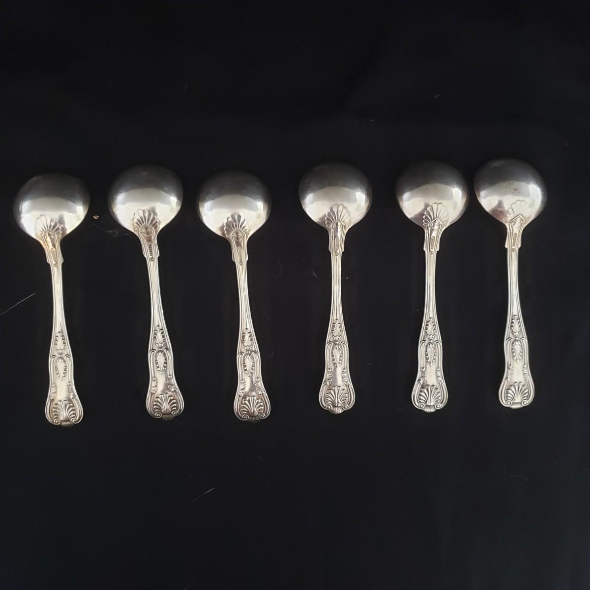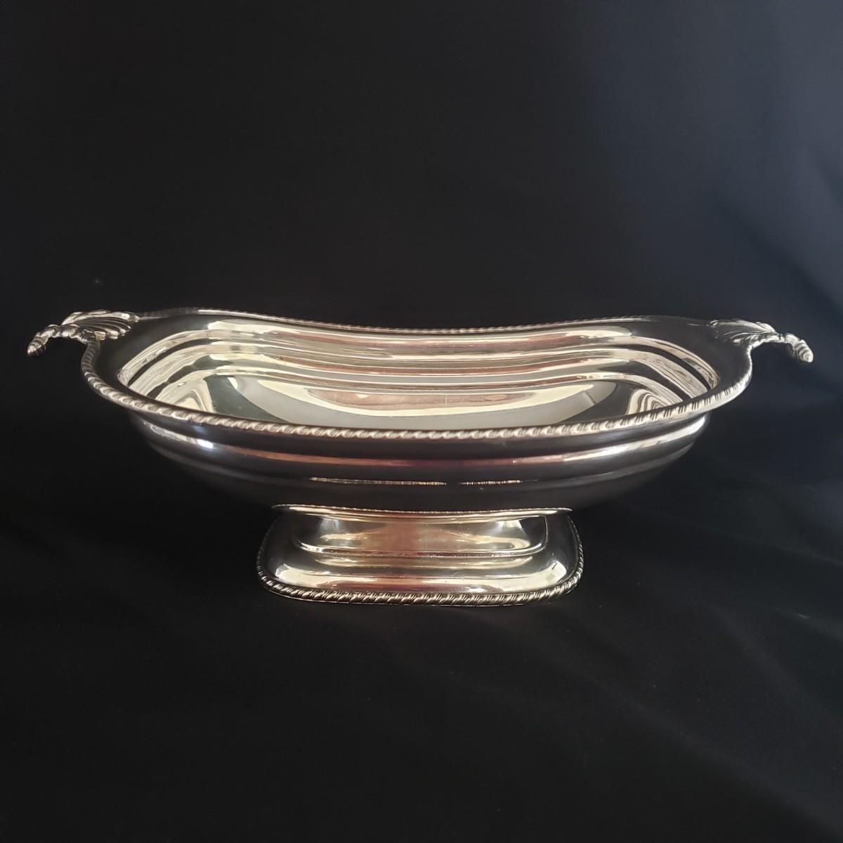 This lot features six Gorham silver plate spoons. Each spoon measures approximately 5". The serving bowl is silver on copper made in England and measures 9" x 6" x 3"H. The bowl does have a dent mark inside, see picture.