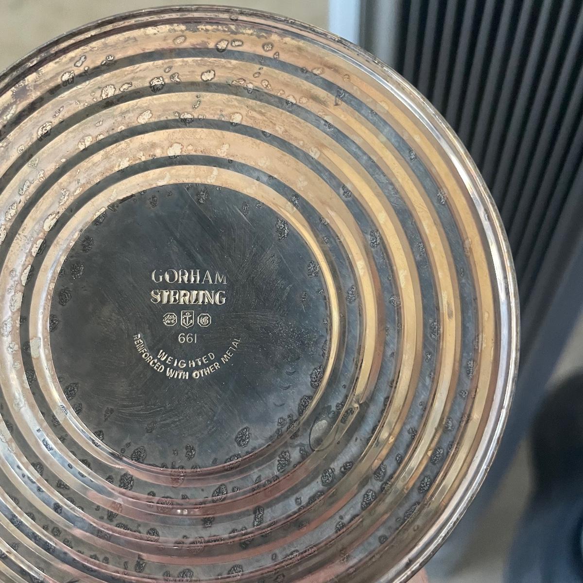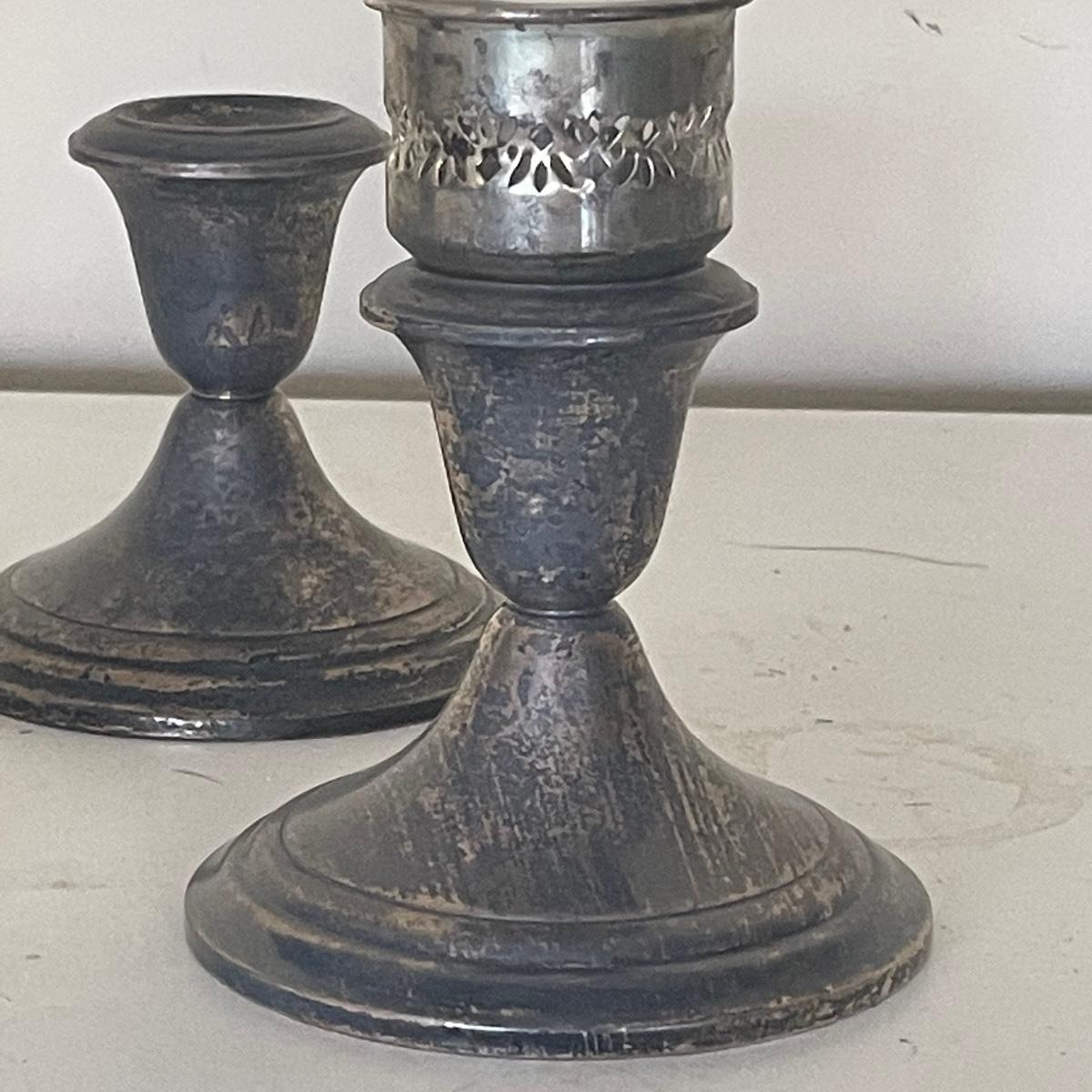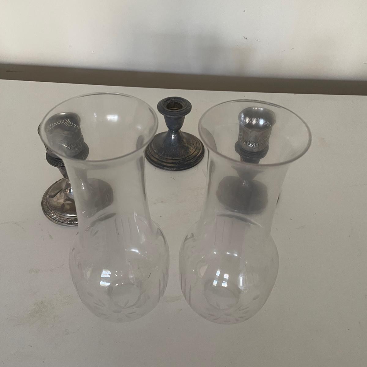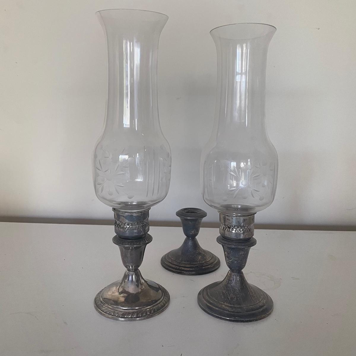 Two Gorham, one Alvin, sterling candle holders here that come with two etched glass shades. In images, the third does not have a glass shade and this one is made by Alvin, the two with shades are Gorham.