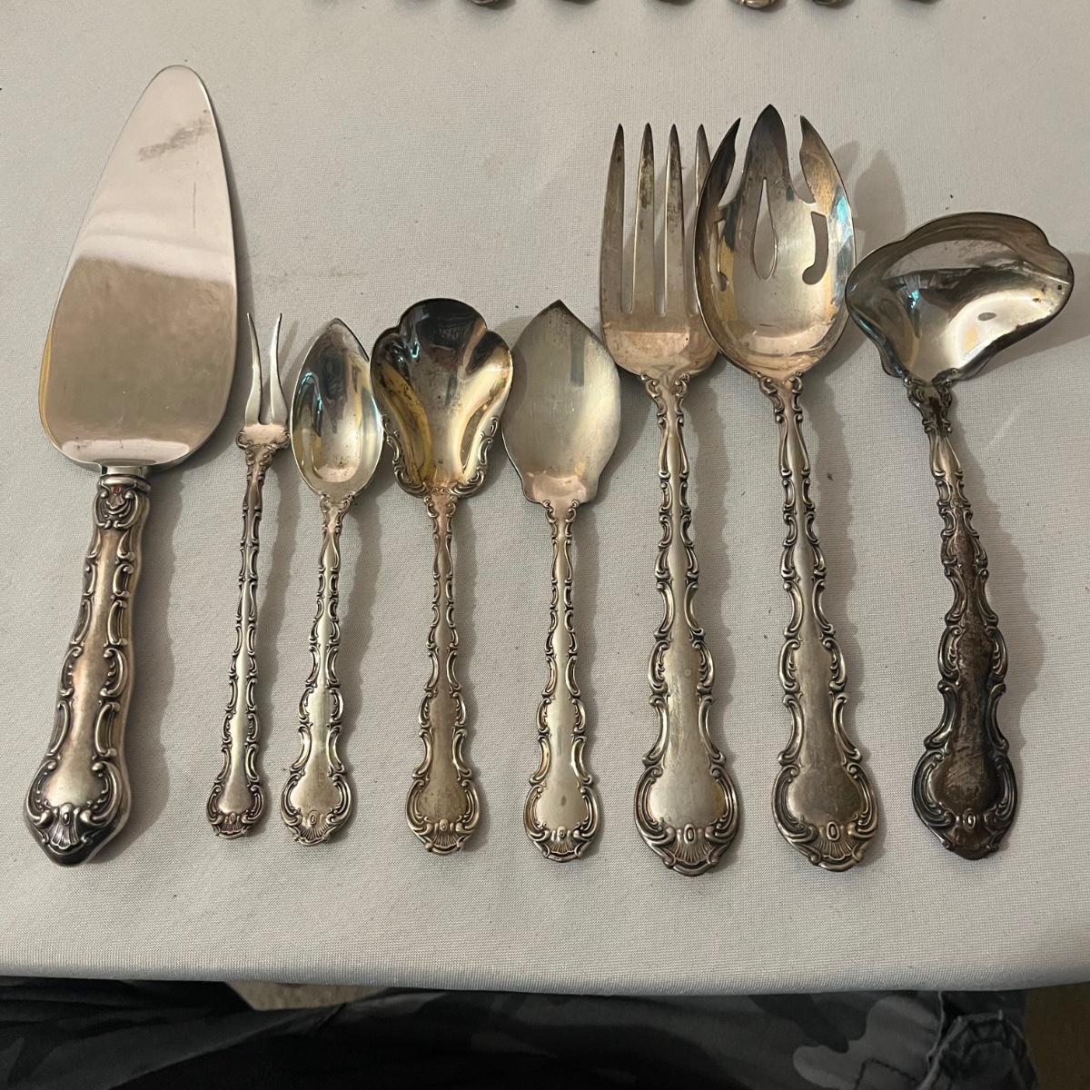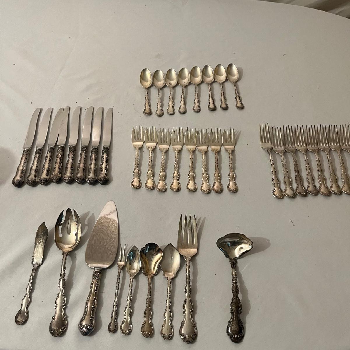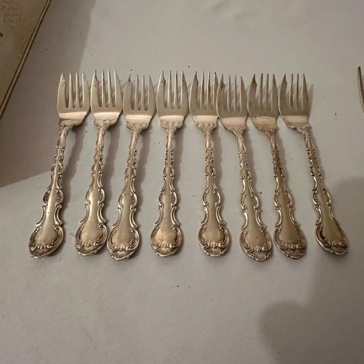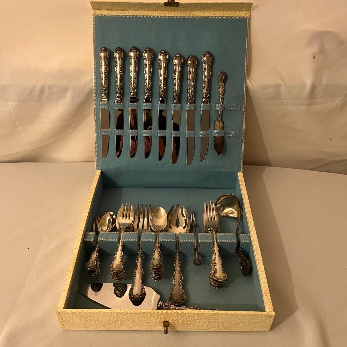 Lot contains Gorham sterling cutlery including eight salad forks, eight dinner forks, eight tea spoons, eight knives, cake server, large spoon and fork, small ladle, butter knife three small spoons and a two pronged fork. Also included is a lined case that measures 12.5” x 12.5” x 2.5”.