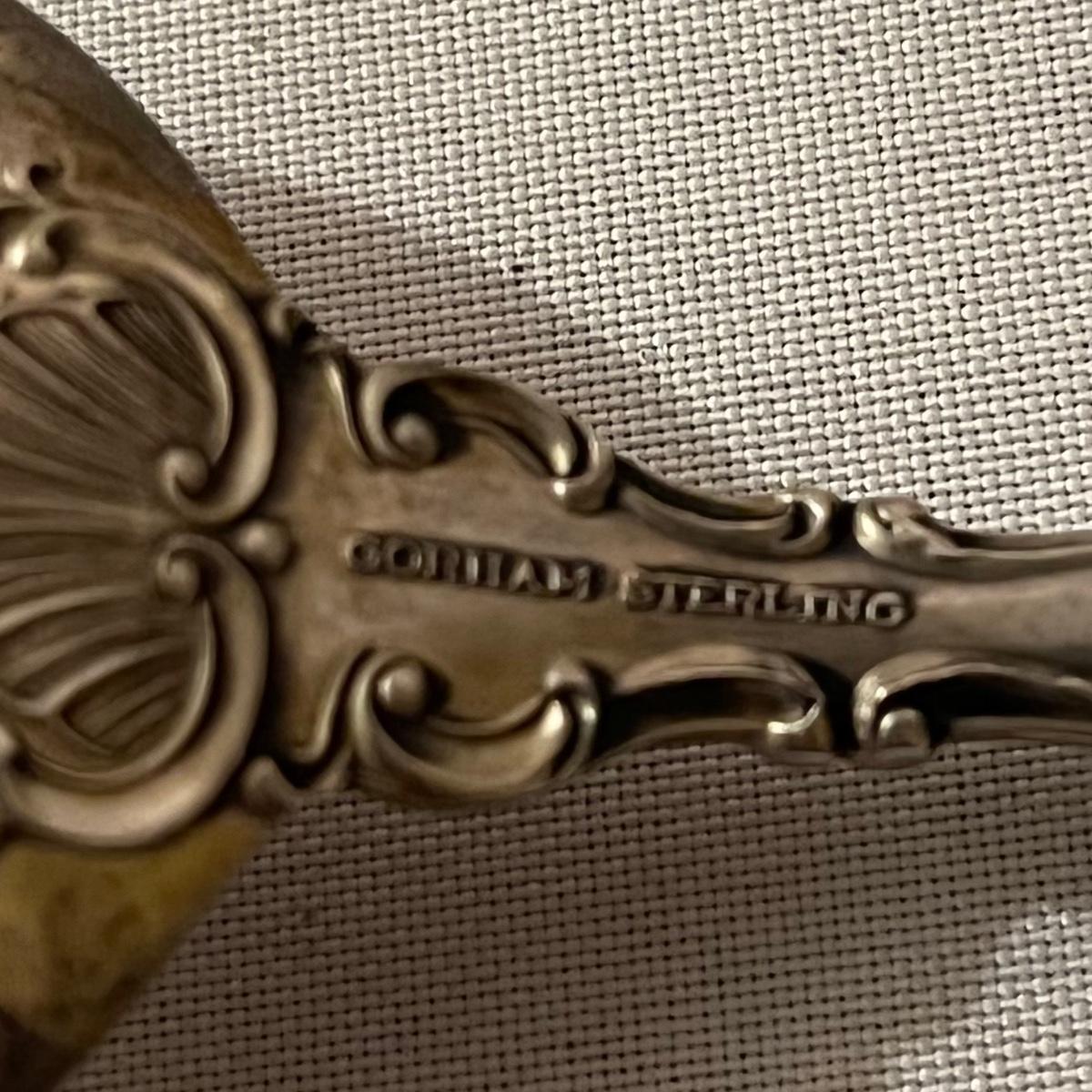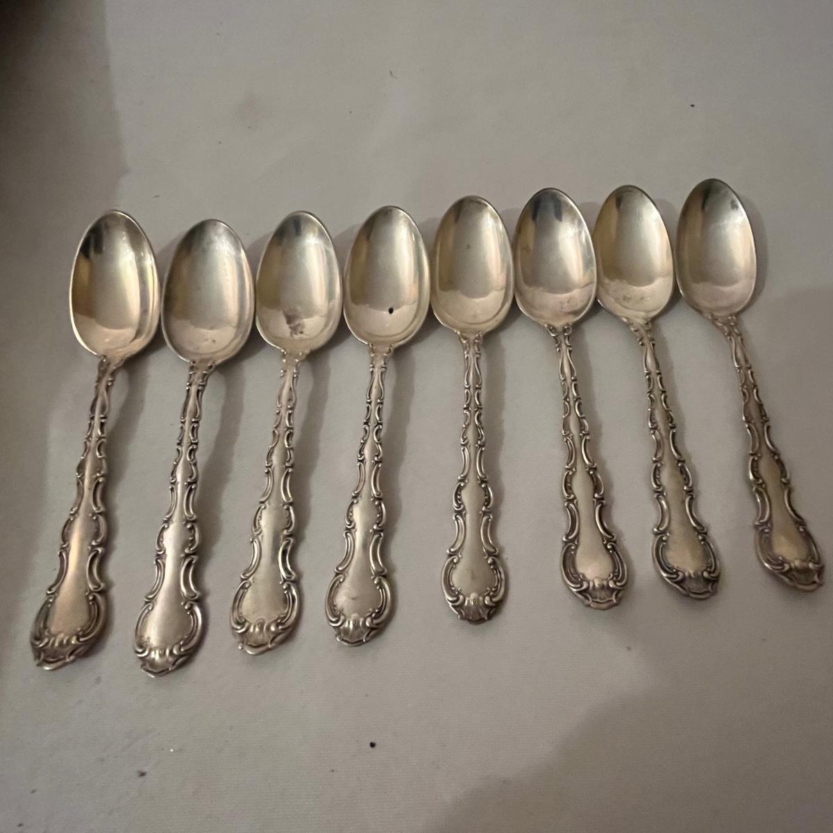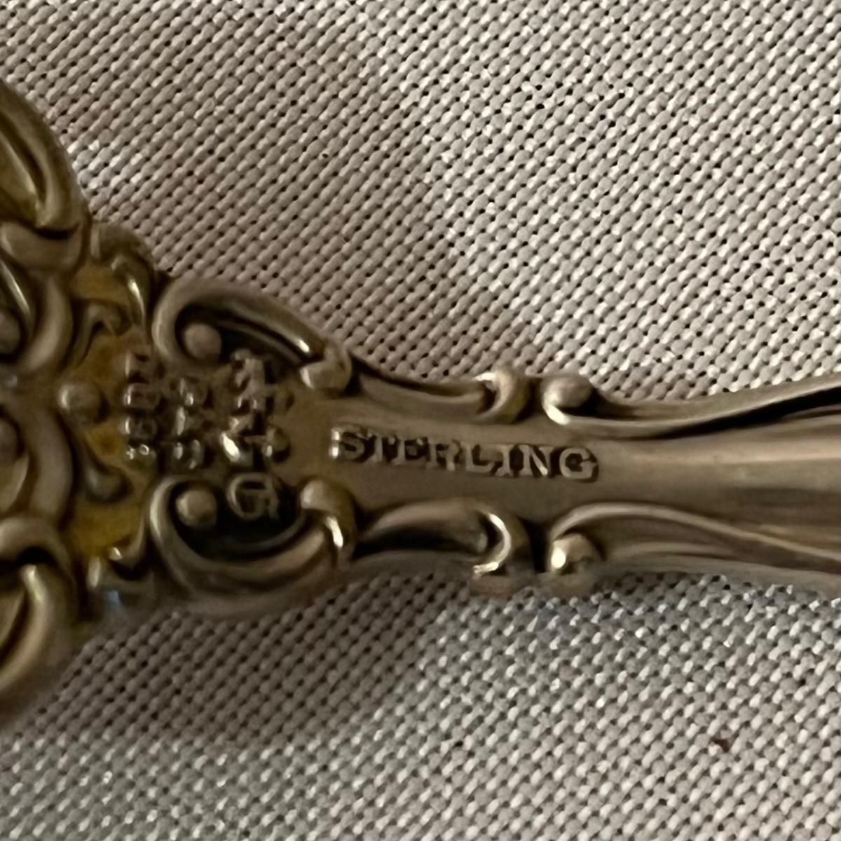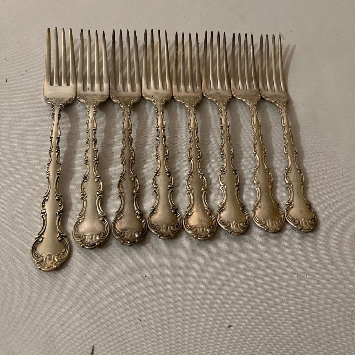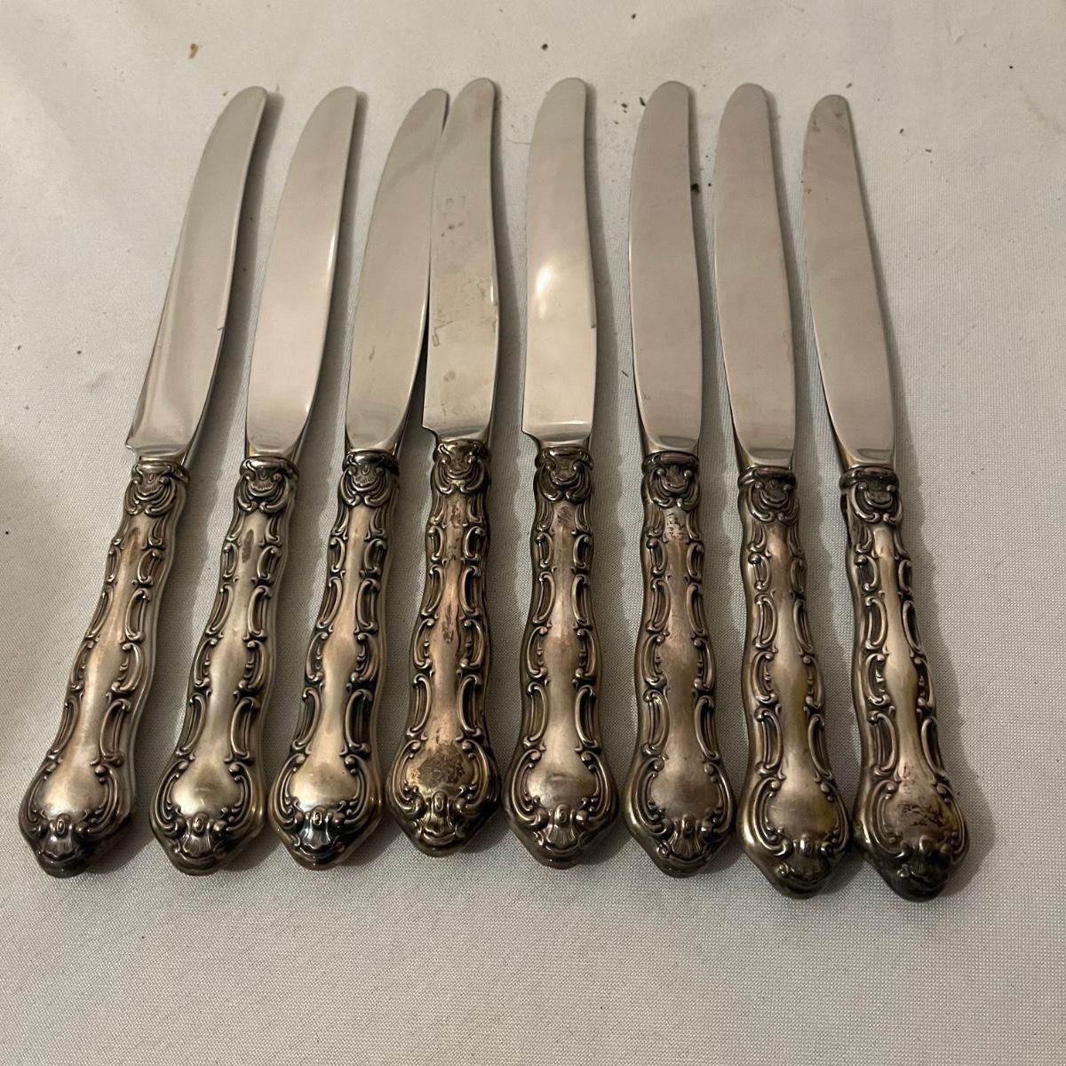 Lot contains Gorham sterling cutlery including eight salad forks, eight dinner forks, eight tea spoons, eight knives, cake server, large spoon and fork, small ladle, butter knife three small spoons and a two pronged fork. Also included is a lined case that measures 12.5” x 12.5” x 2.5”.