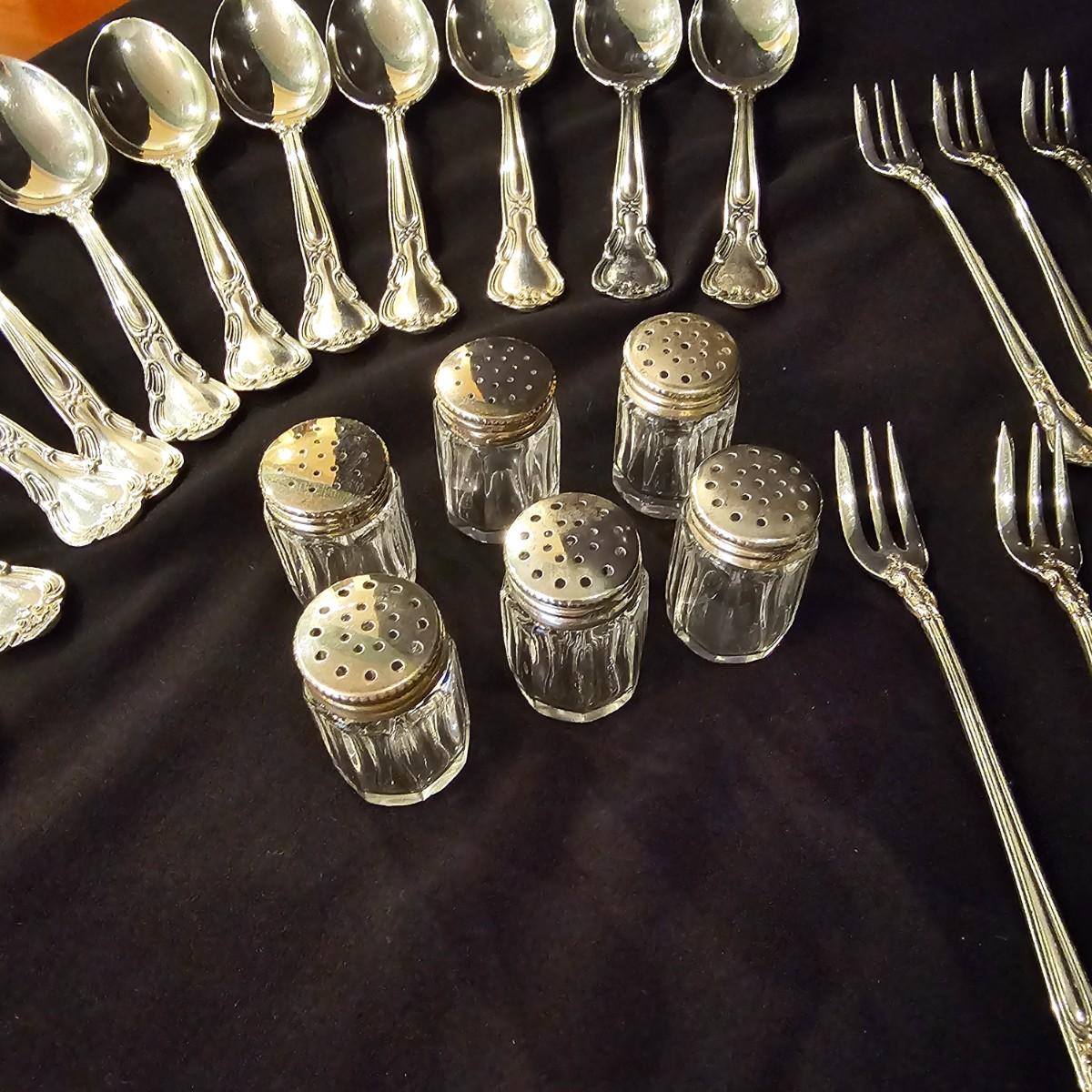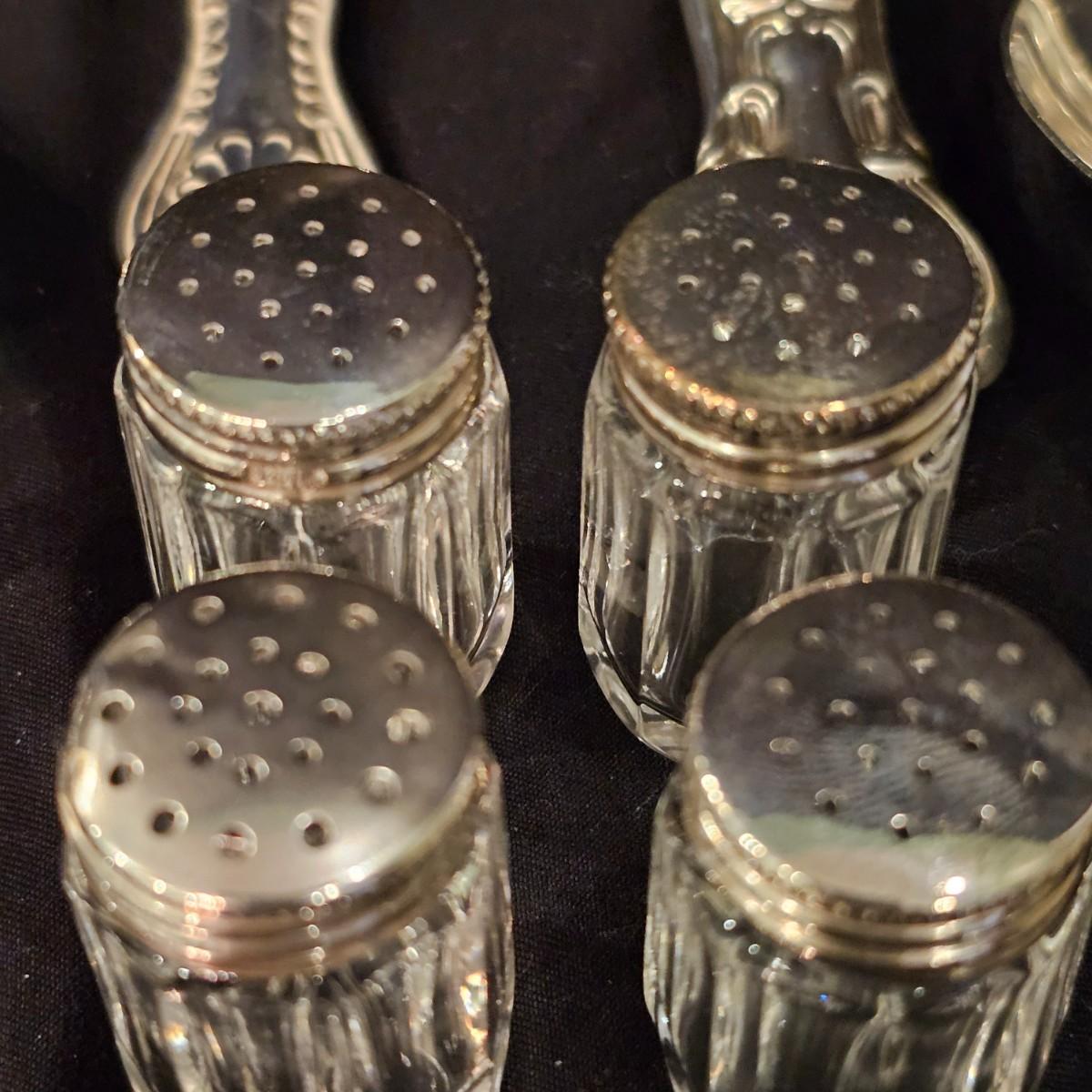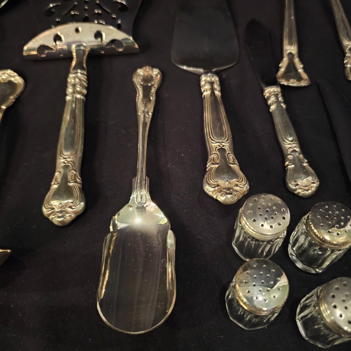 A set of Gorham sterling silver flatware, service for twelve. Also includes serving pieces, four engraved sterling napkin rings and 16 individual salt shakers, glass with sterling tops, marked 925. Note that cheese knife is different from set and is silver plate. 120 pieces total. See photos for details. Shipping available.