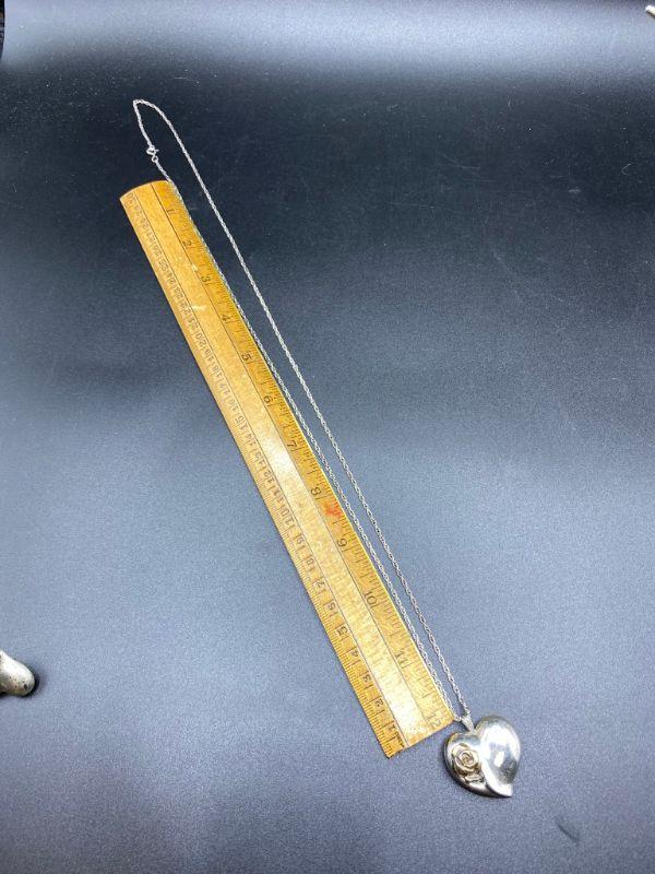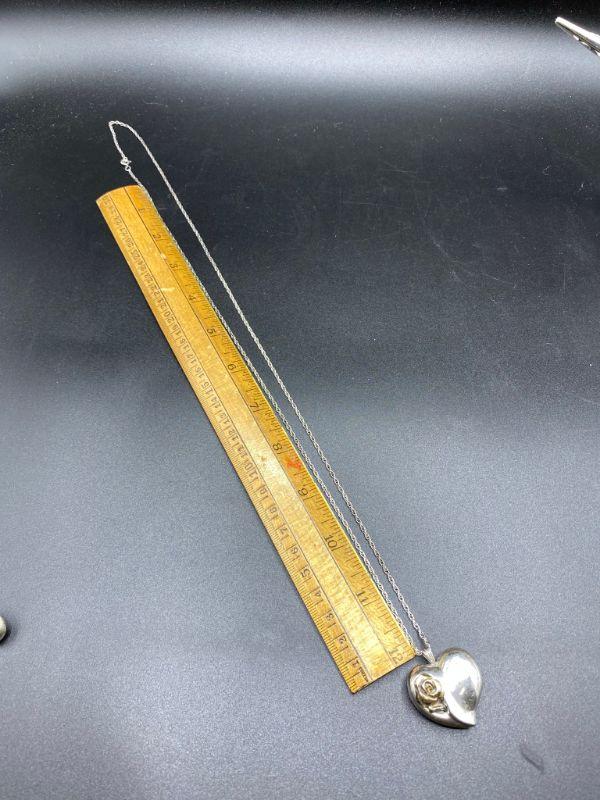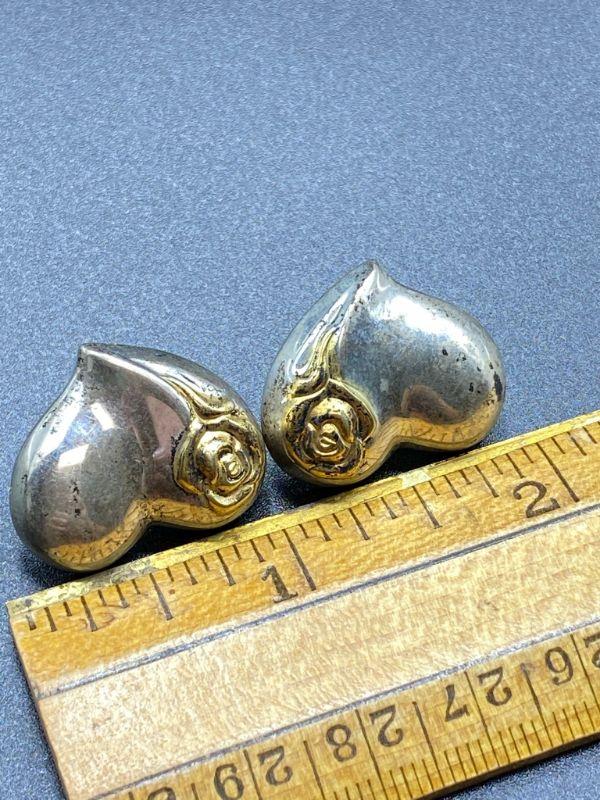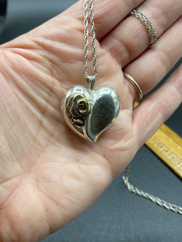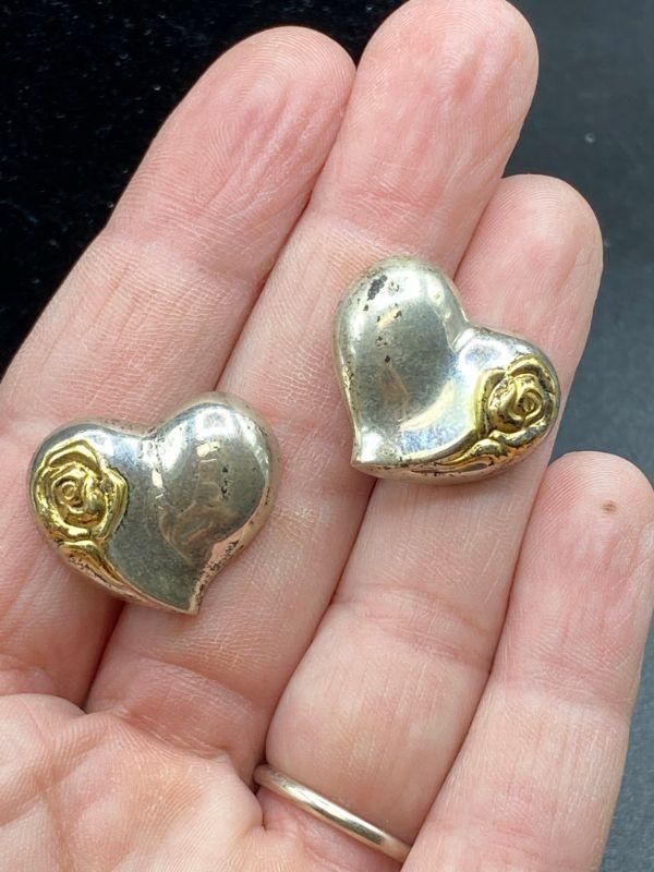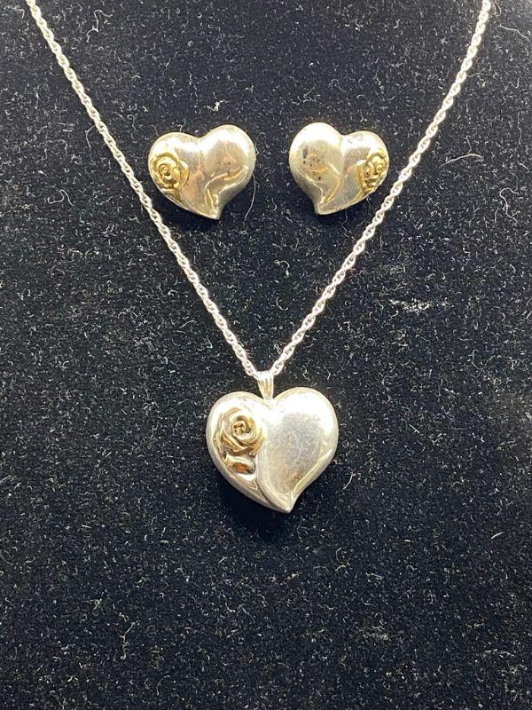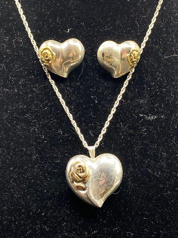 Gorham sterling silver jewelry set. Matching heart pendant necklace and earrings. Two tone silver with embossed gold rose. Marked on the back. Earrings are for pierced ears. Chain has over a 12" drop length.
