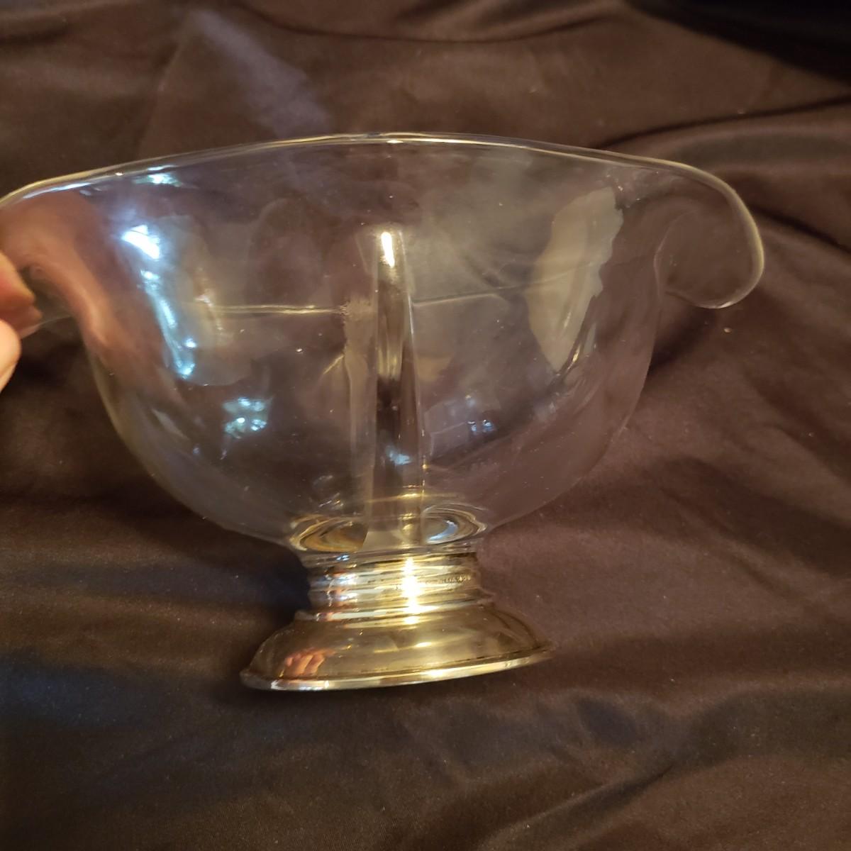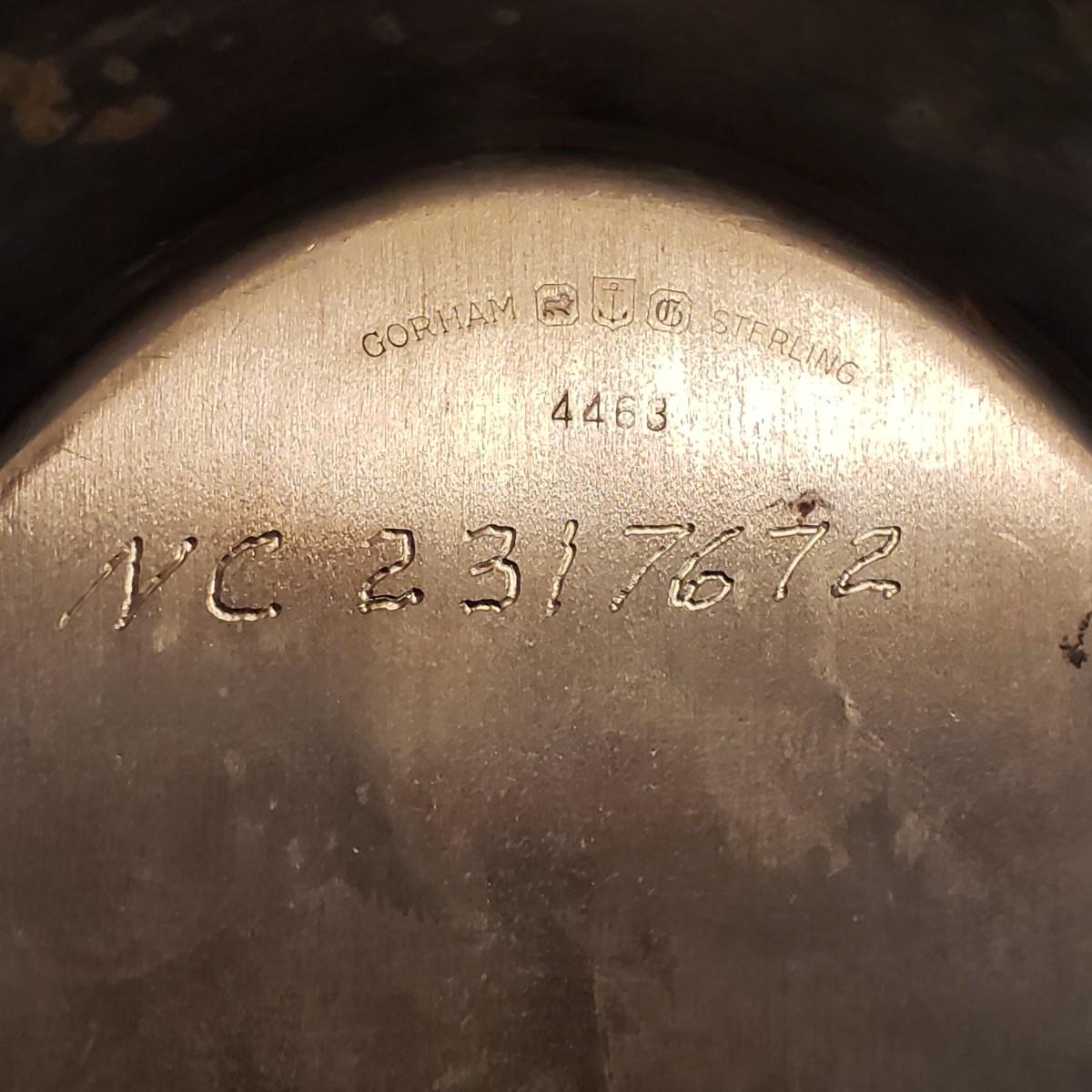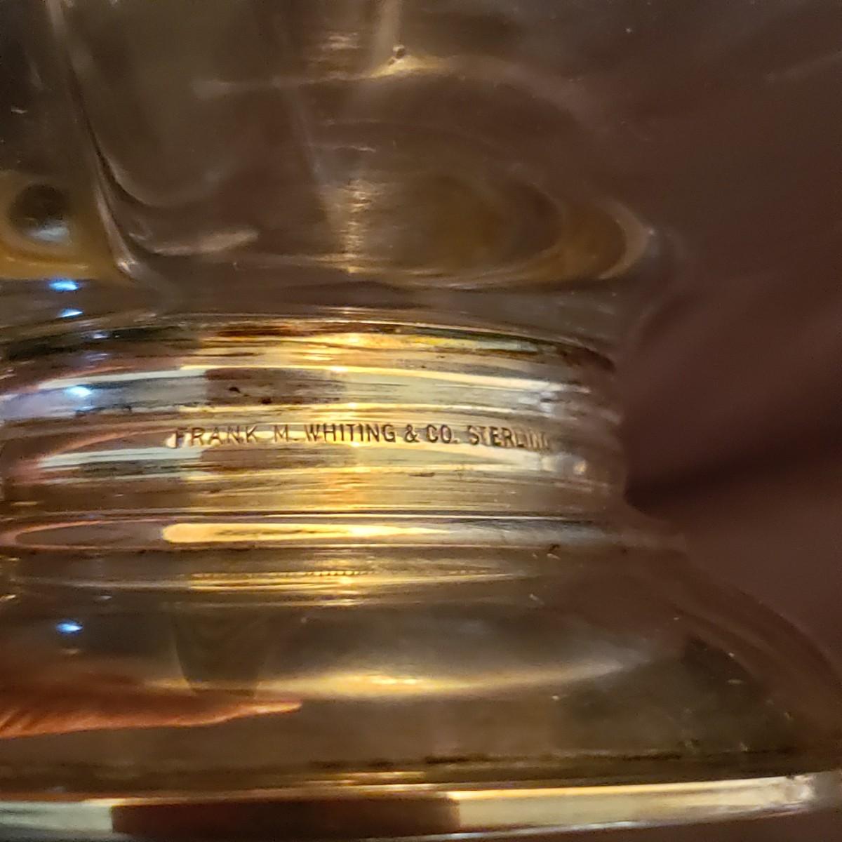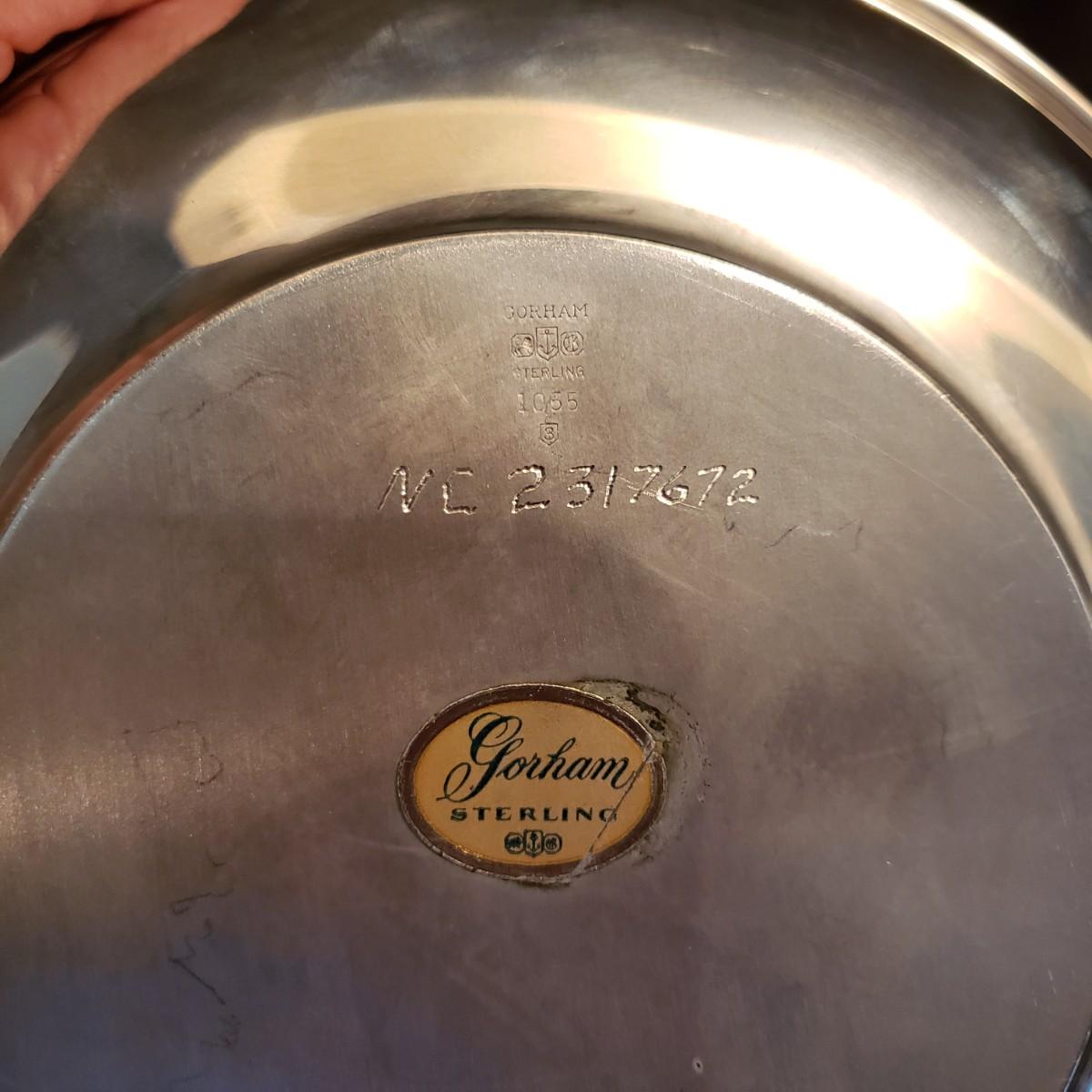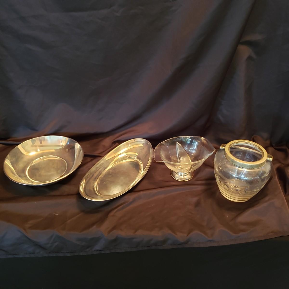 This lot has two Gorham sterling silver trays. The round piece measures 9" x 2" H. The round piece has a darkened spot on the inside, see picture. The elongated tray measures approximately 12" x 1" H. It has some spots on the back, see picture. The Whiting sterling silver base with a glass top is divided into two sections. This piece measures 7" x 5" x 4" H. The last piece pictured does not have any markings. It is a jar that has a silver like rim and handle. The glass is etched in a stripe and leaf pattern. The jar measures 6" x 6" H.