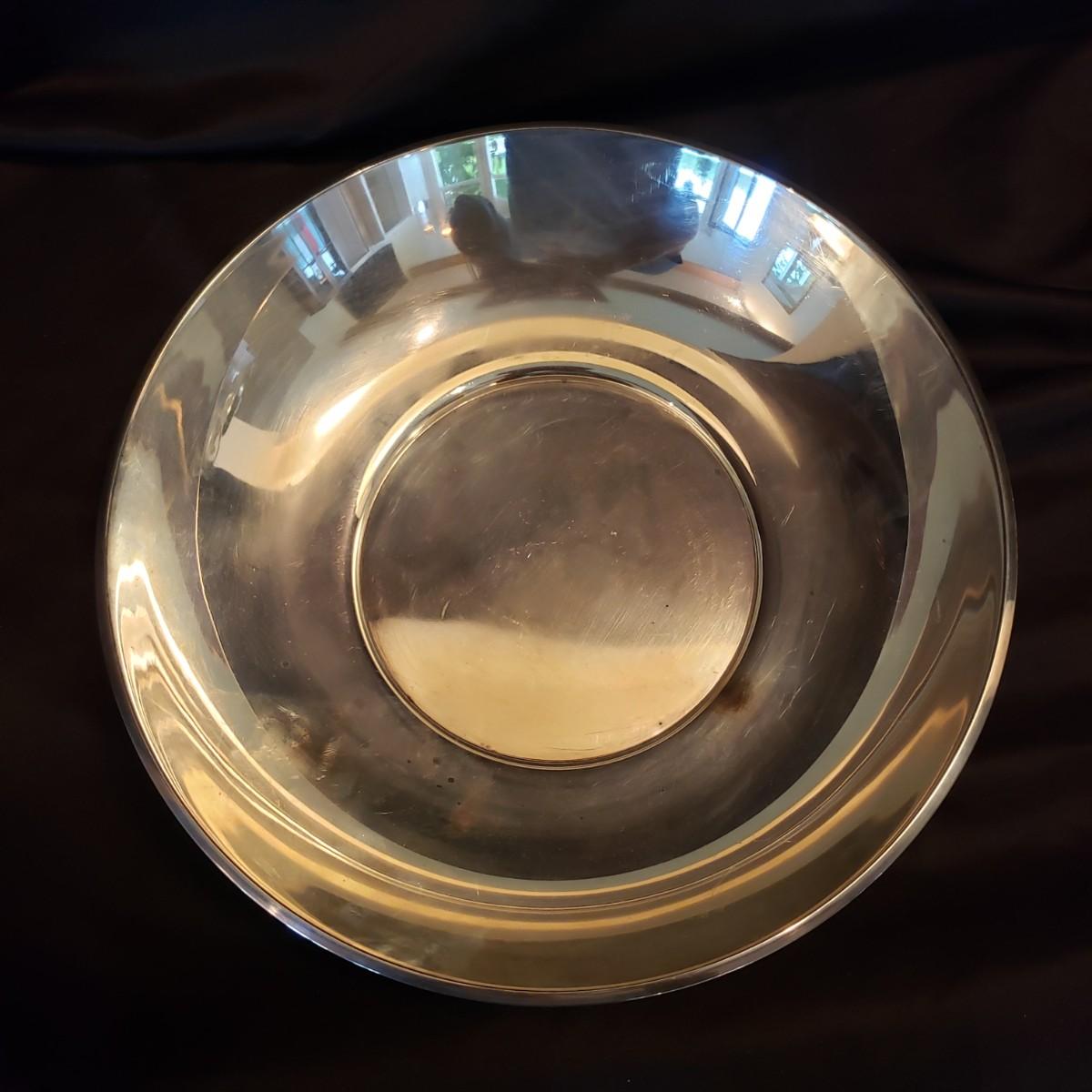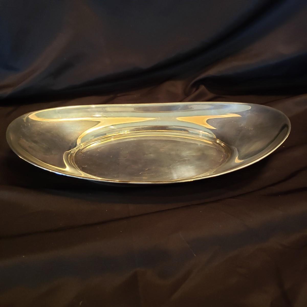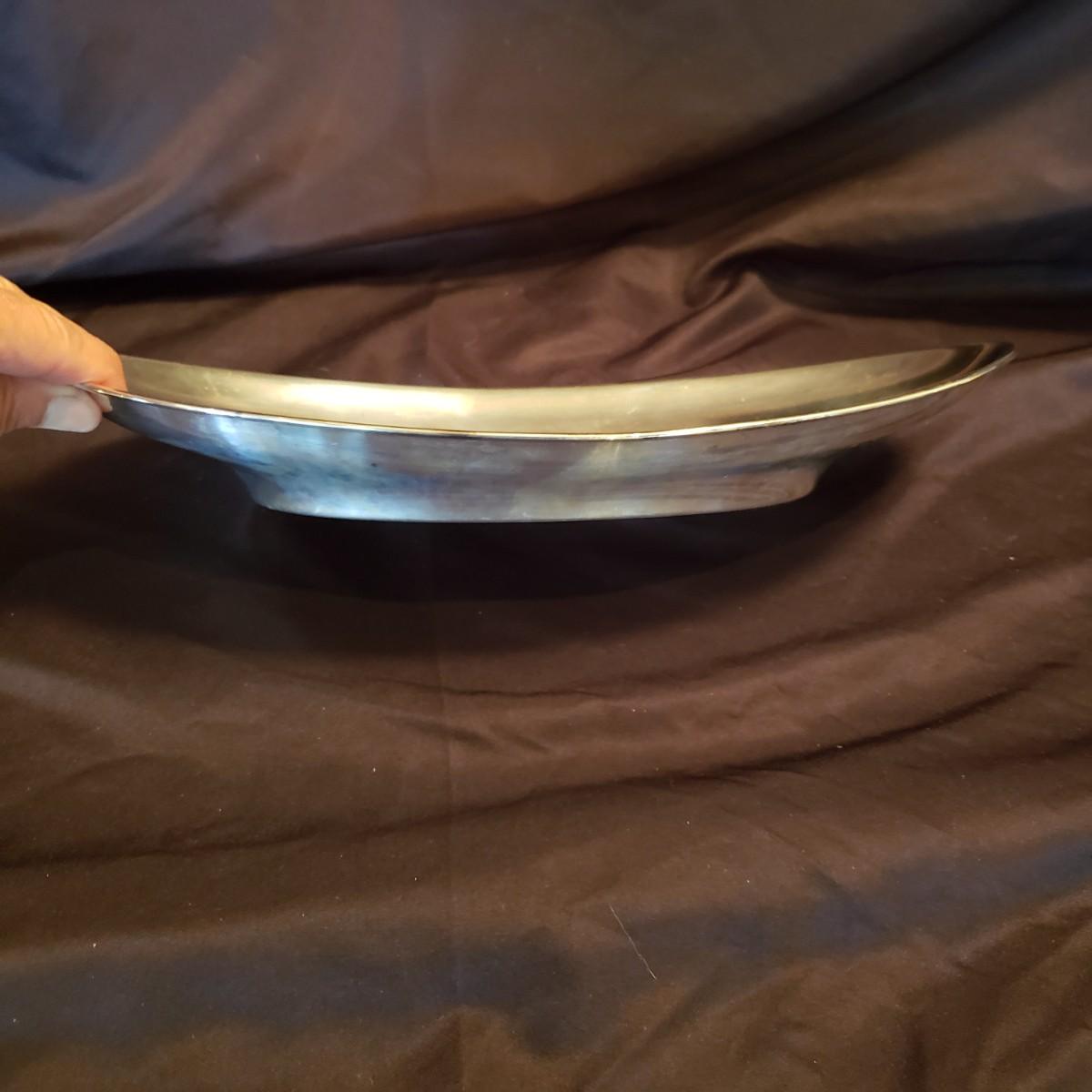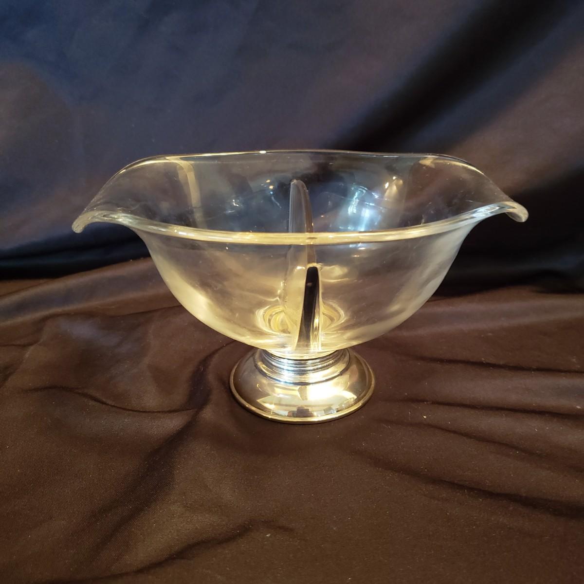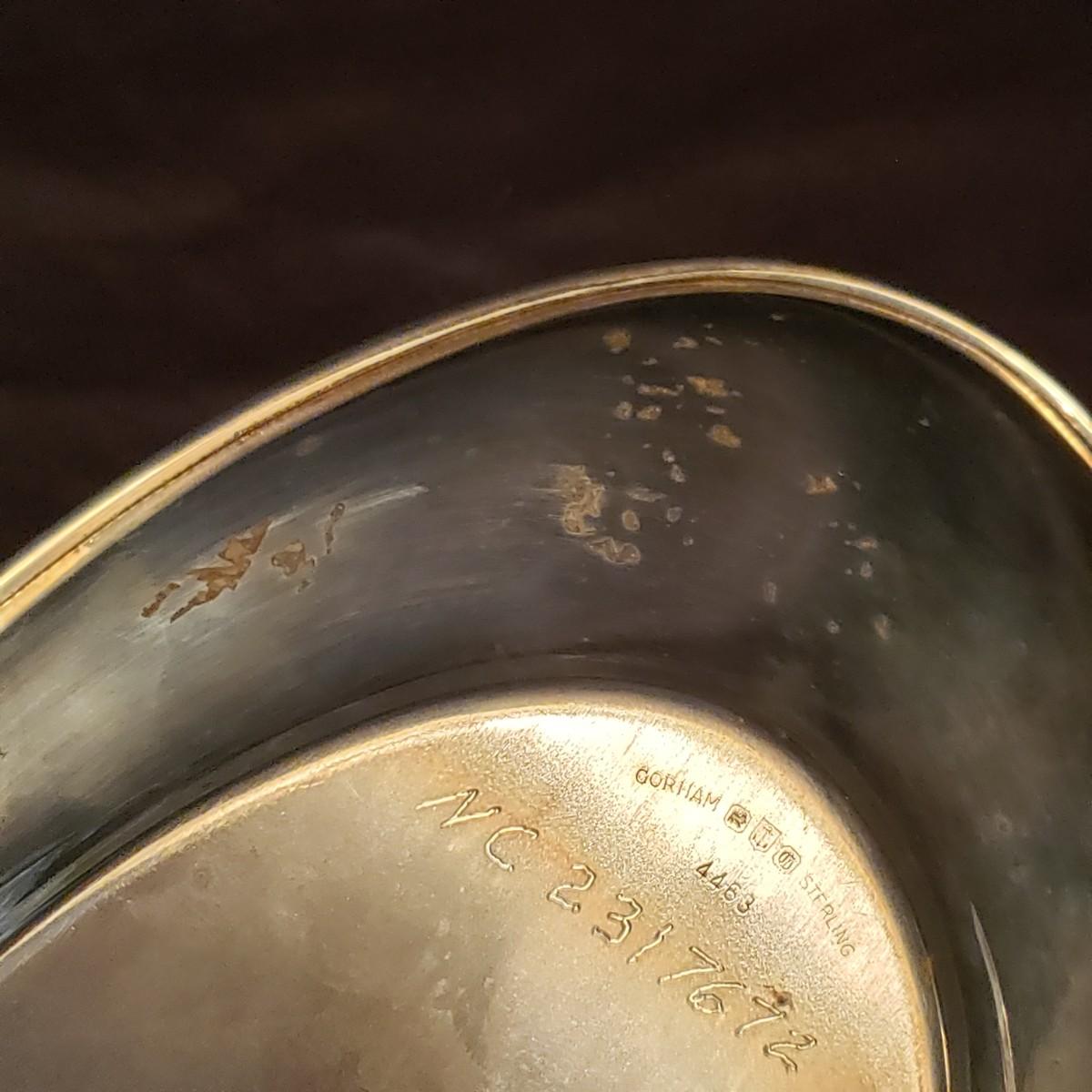 This lot has two Gorham sterling silver trays. The round piece measures 9" x 2" H. The round piece has a darkened spot on the inside, see picture. The elongated tray measures approximately 12" x 1" H. It has some spots on the back, see picture. The Whiting sterling silver base with a glass top is divided into two sections. This piece measures 7" x 5" x 4" H. The last piece pictured does not have any markings. It is a jar that has a silver like rim and handle. The glass is etched in a stripe and leaf pattern. The jar measures 6" x 6" H.