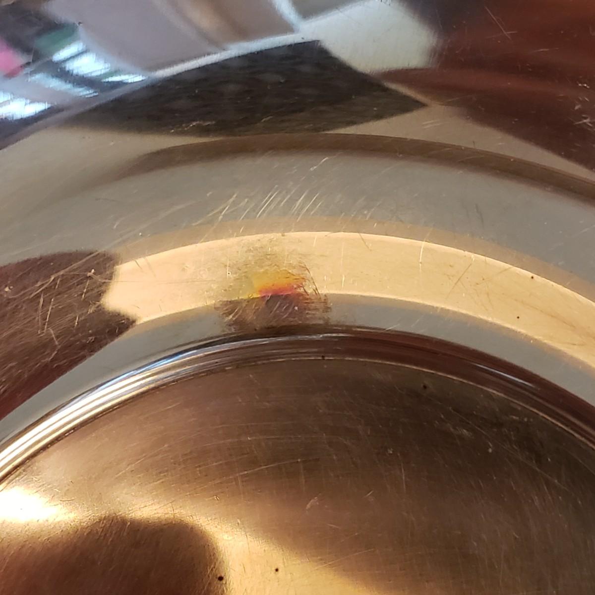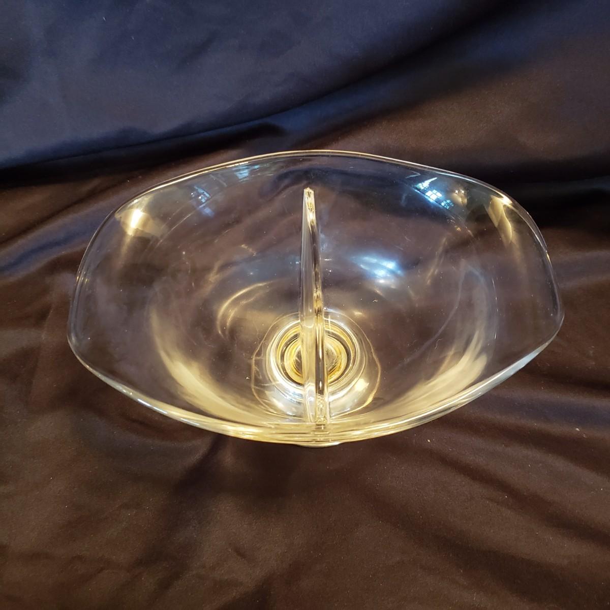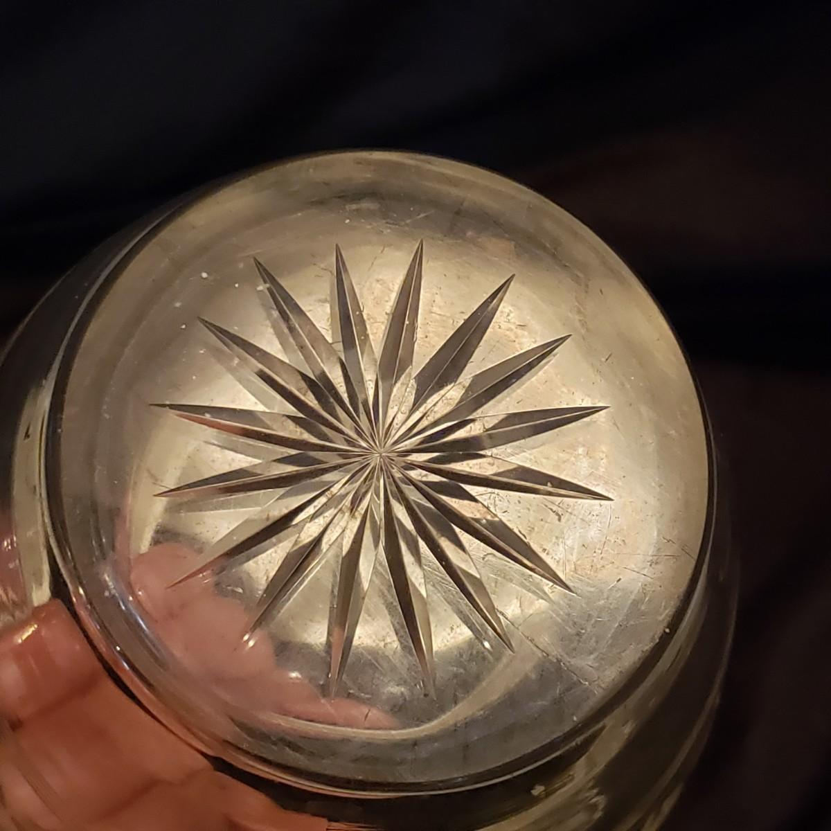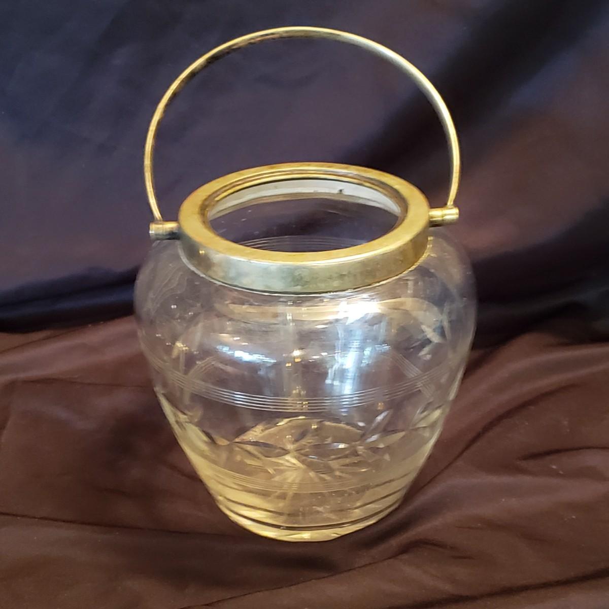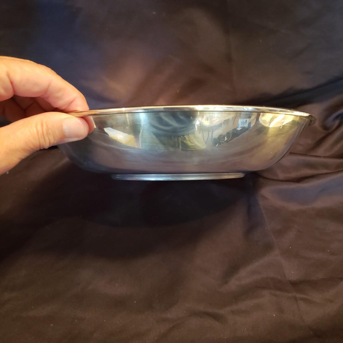 This lot has two Gorham sterling silver trays. The round piece measures 9" x 2" H. The round piece has a darkened spot on the inside, see picture. The elongated tray measures approximately 12" x 1" H. It has some spots on the back, see picture. The Whiting sterling silver base with a glass top is divided into two sections. This piece measures 7" x 5" x 4" H. The last piece pictured does not have any markings. It is a jar that has a silver like rim and handle. The glass is etched in a stripe and leaf pattern. The jar measures 6" x 6" H.