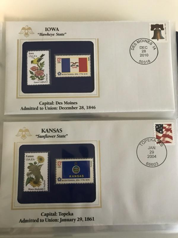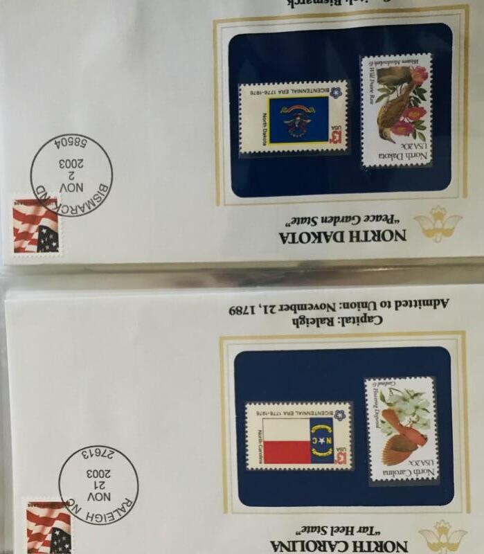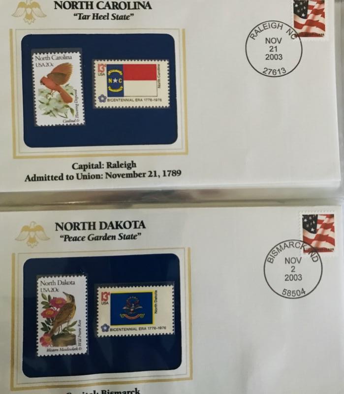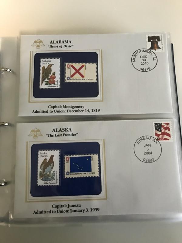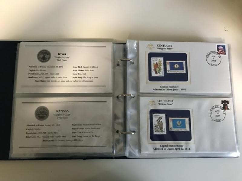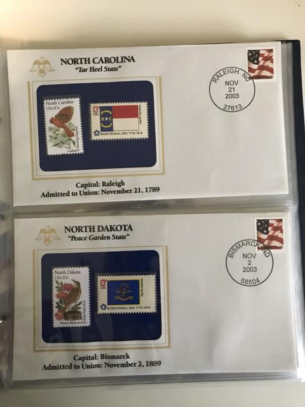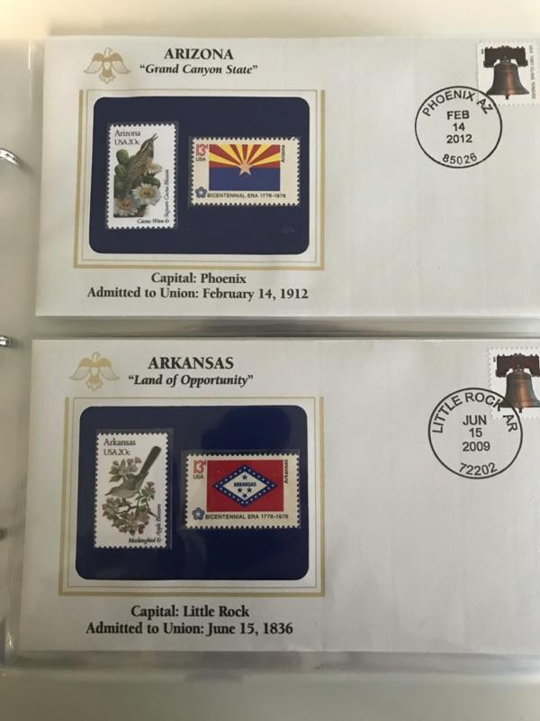 This is a bound book of all 50 US States stamps. The oldest envelop was cancelled on 2003 all the way to 2011. Each envelop has details about each state.