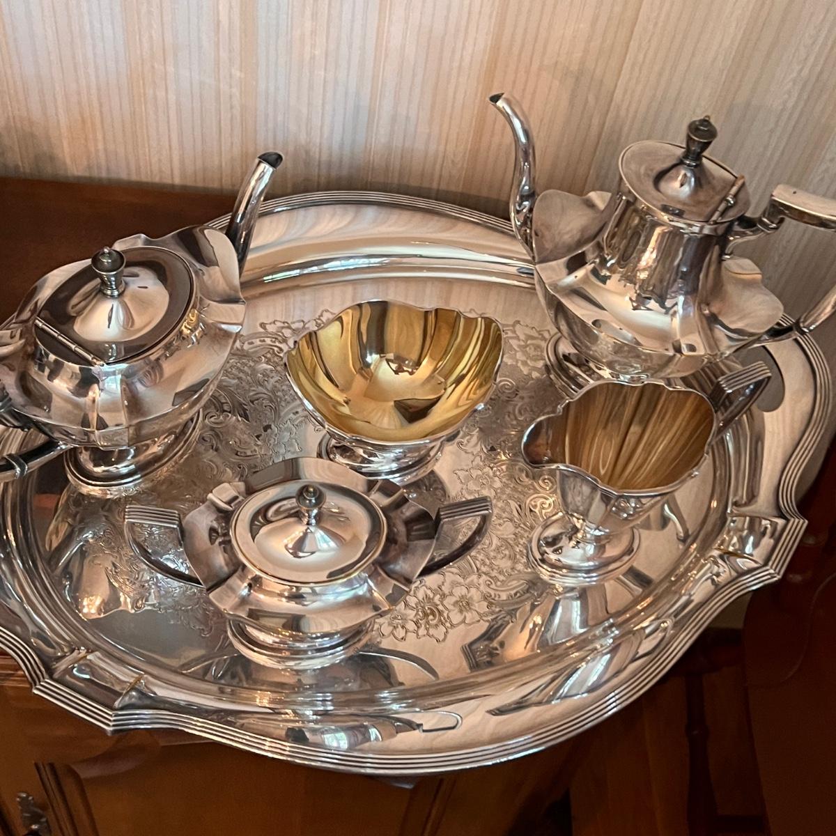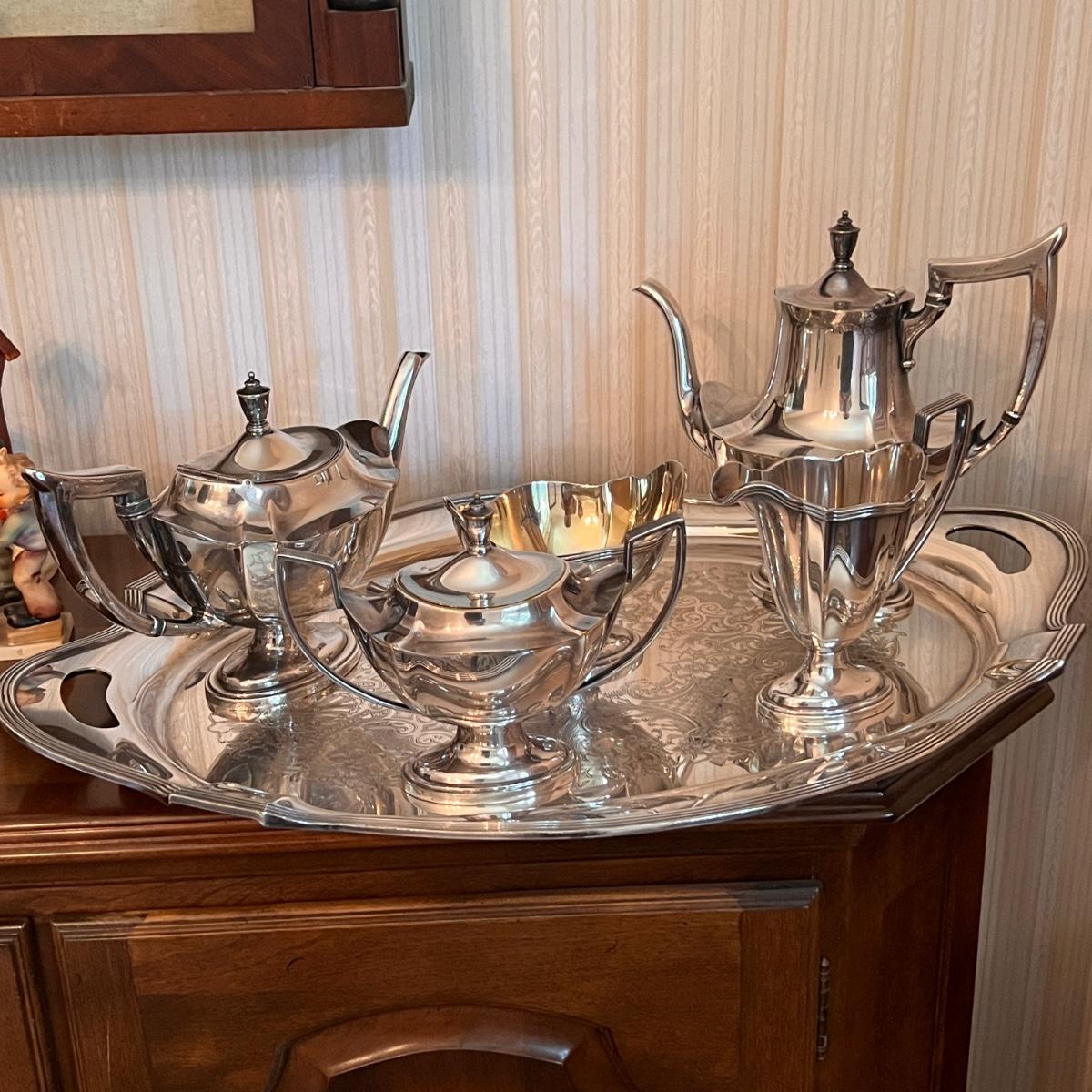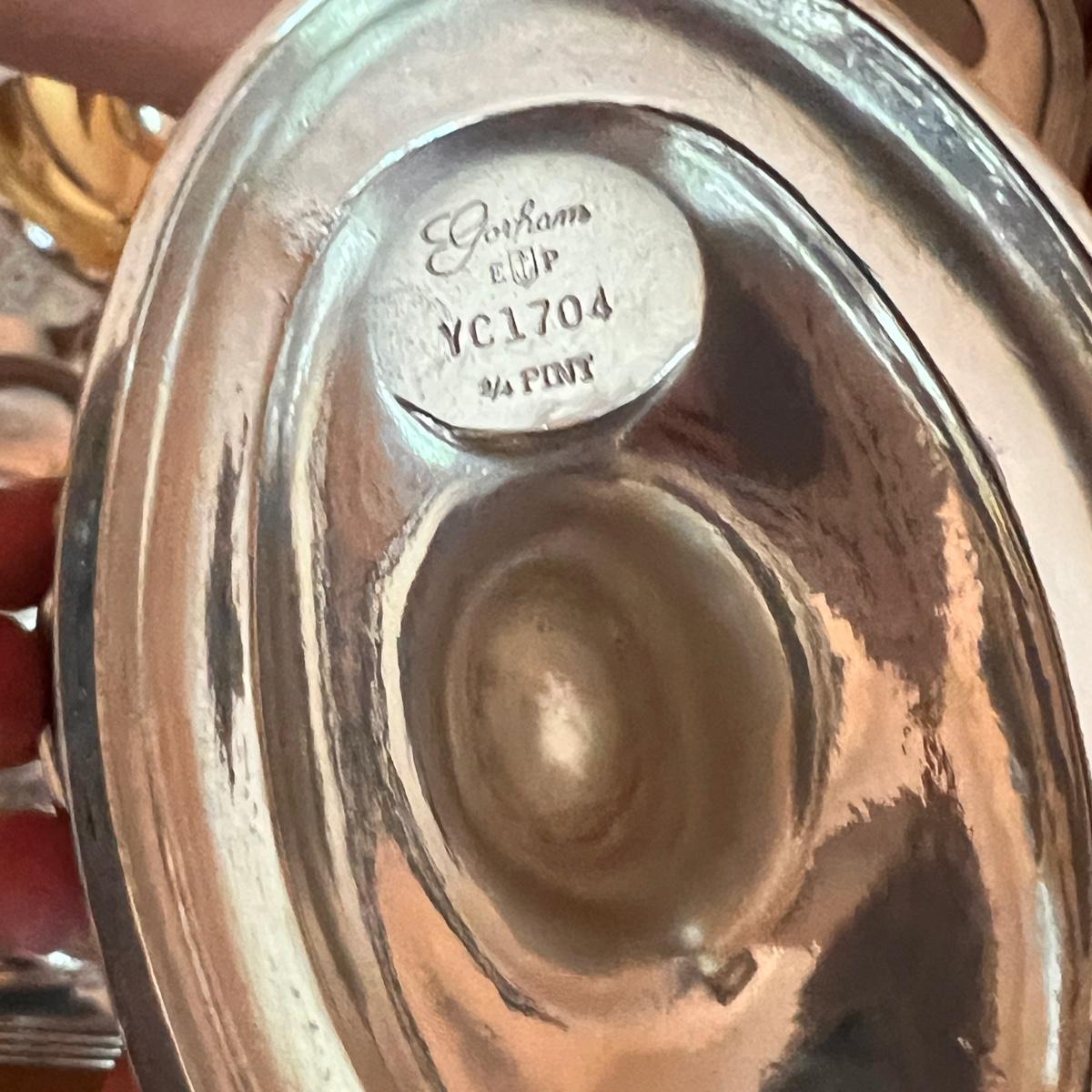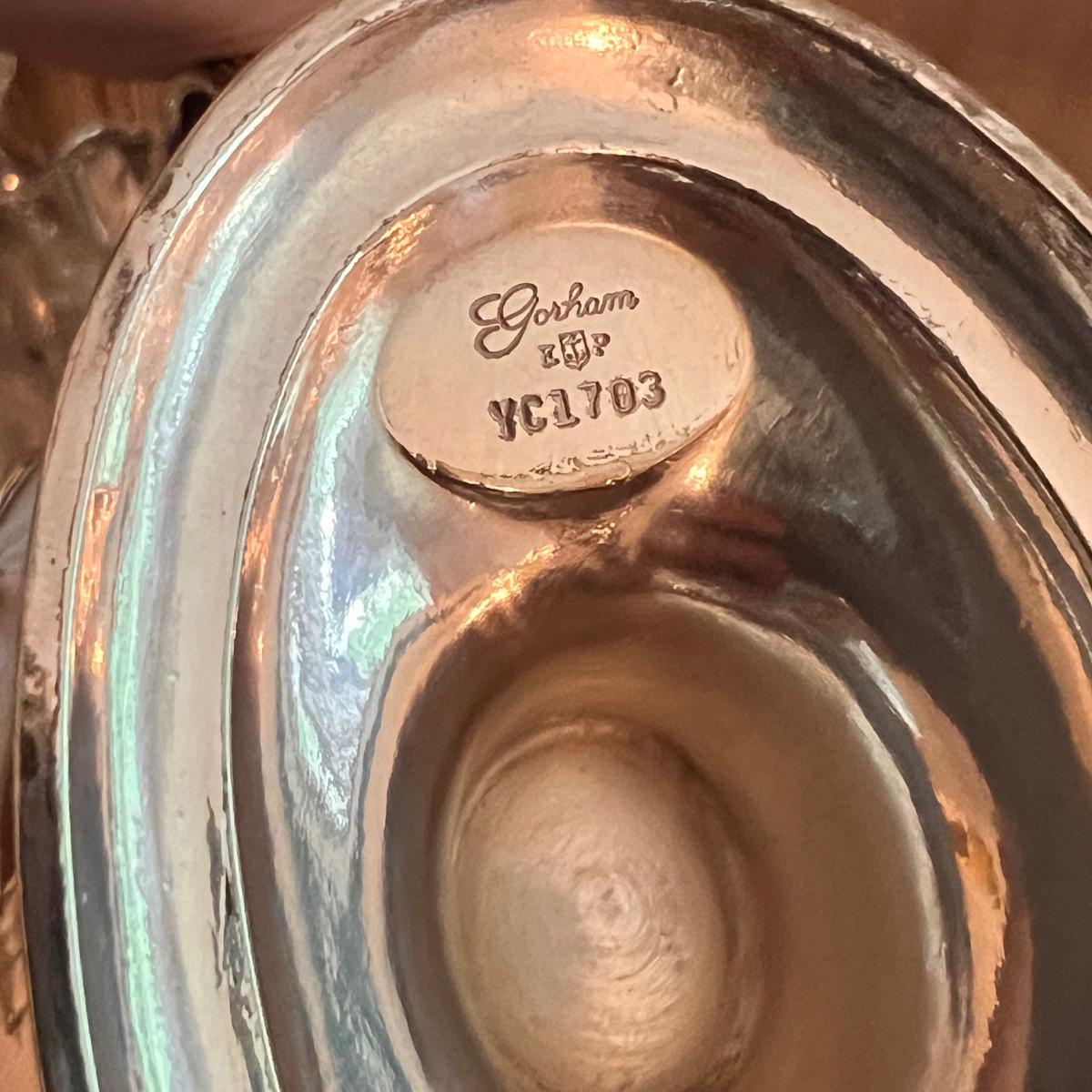 All the pieces except the tray have stamp Gorham YC1703. In very well kept condition. Believed to be Plymouth Bay collection. Silver plate.