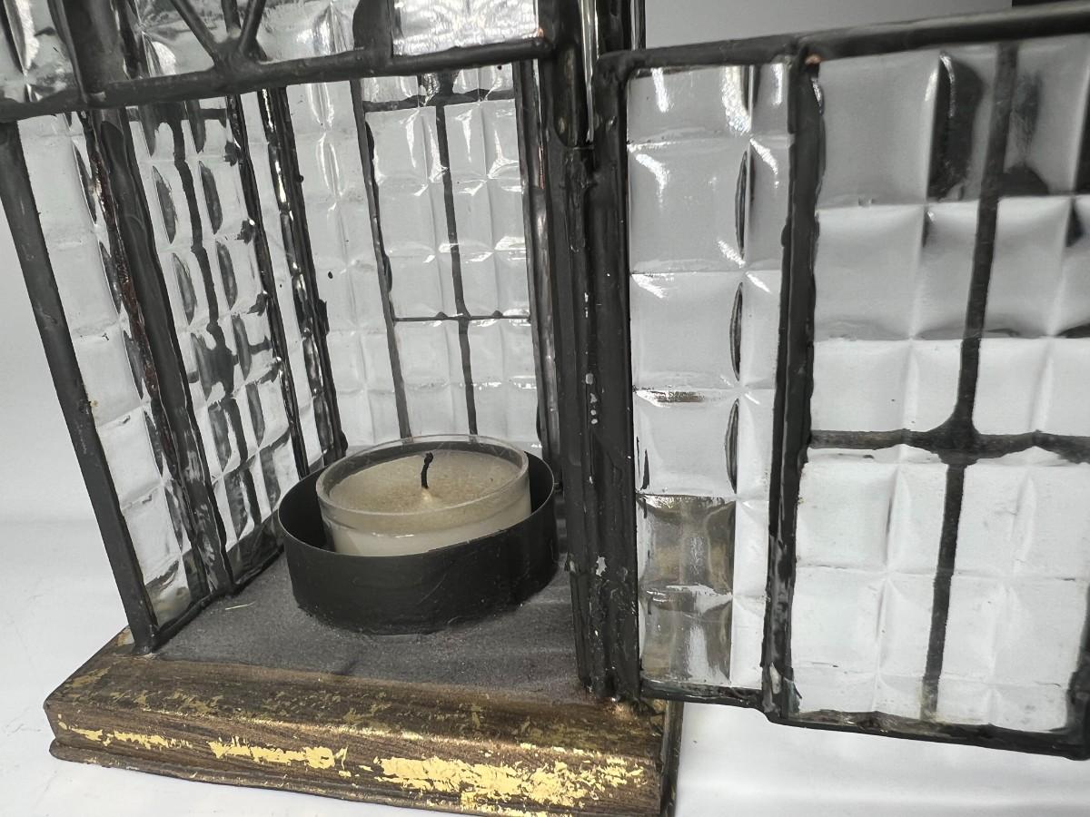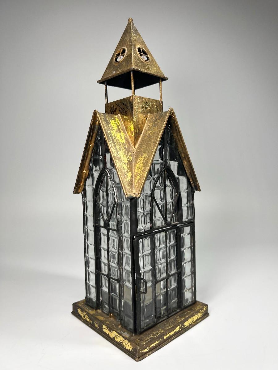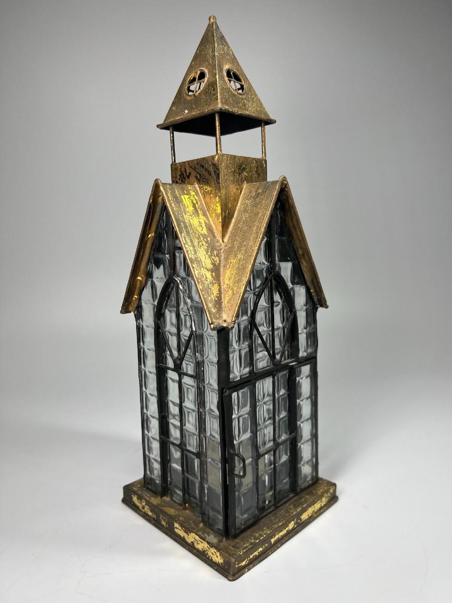 Gothic Church Cathedral Style Gazebo Gold Color Metal & Glass Candle Holder Lantern, there is no significant damage to the metal or glass and is in good displayable condition. Check pictures for more details and for sizing.