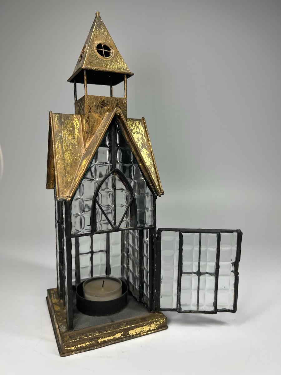 Gothic Church Cathedral Style Gazebo Gold Color Metal & Glass Candle Holder Lantern