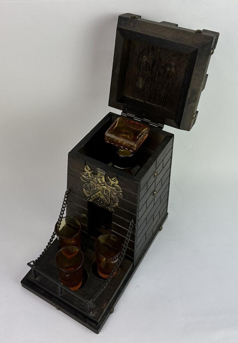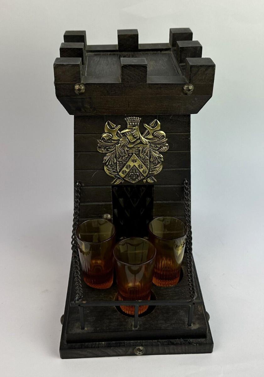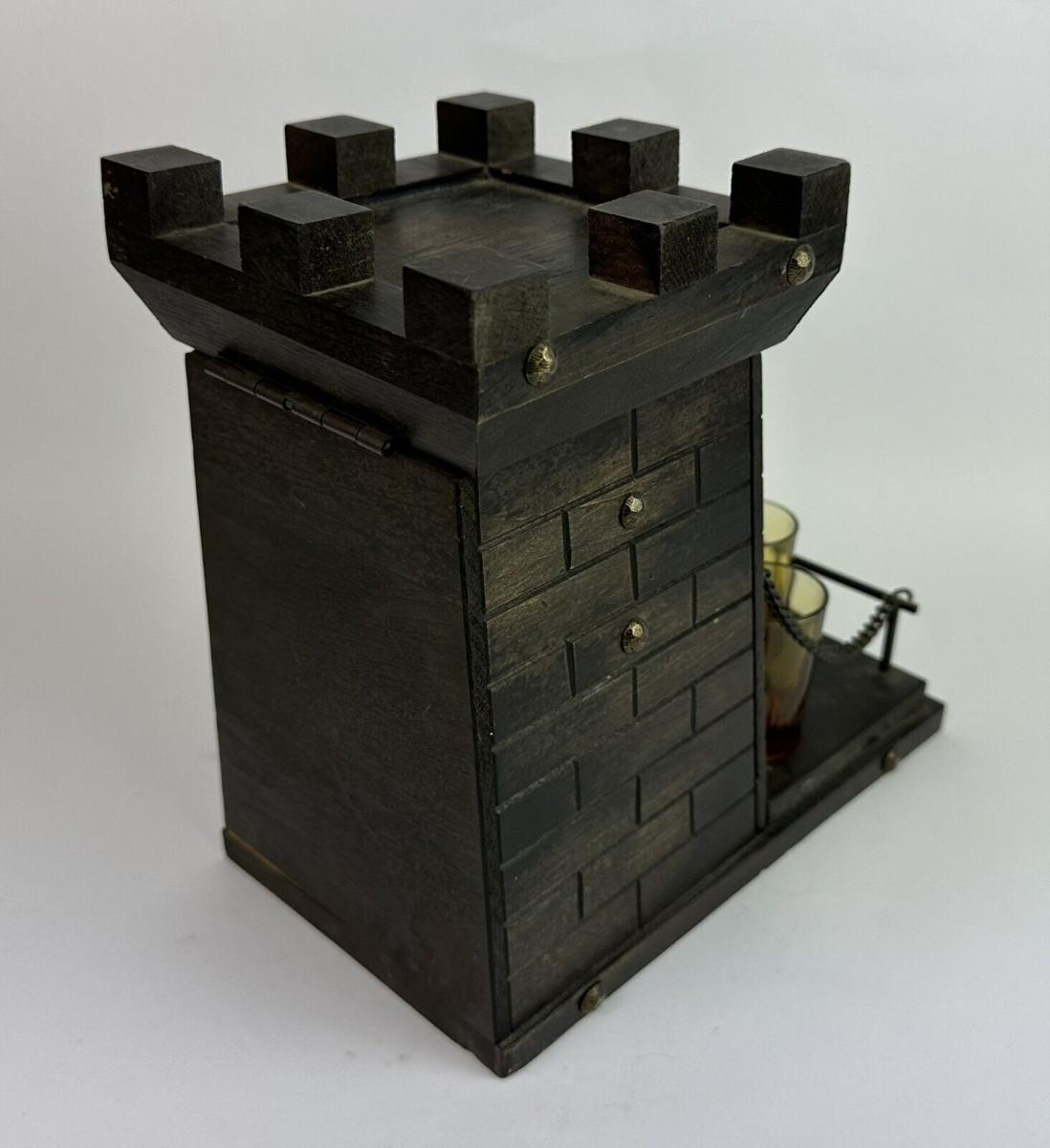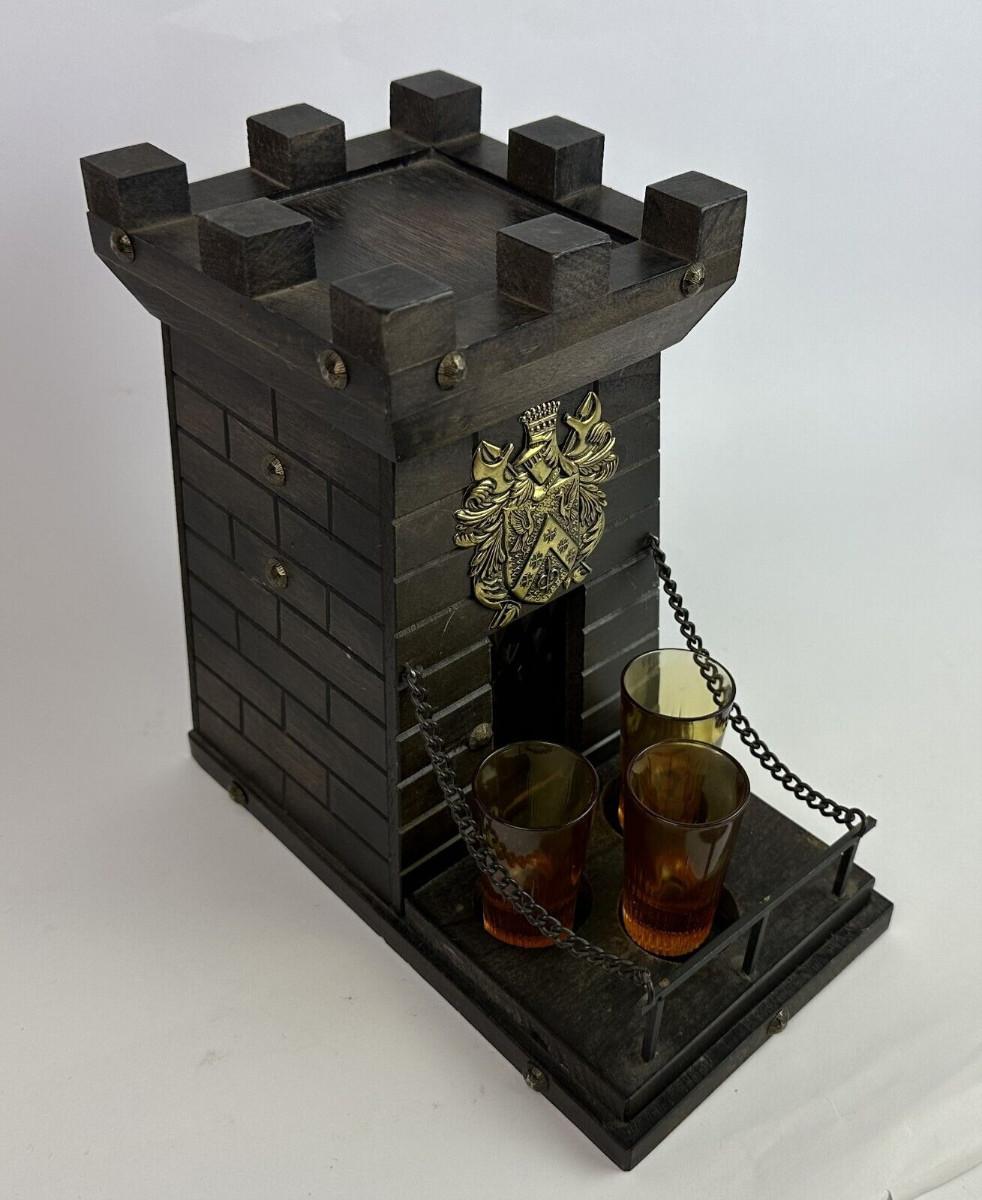 You can find this Medievel Castle Decanter Set in the 1970 Sears catalog...Measures approx. 8.5 x 8.5"...Wooden construction with a Coat of Arms above the door..Turrets open to reveal an amber glass decanter...three matching shot glasses...as shown...light wear...Retro barware.