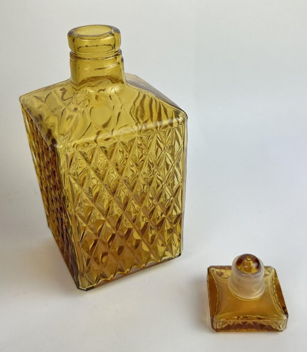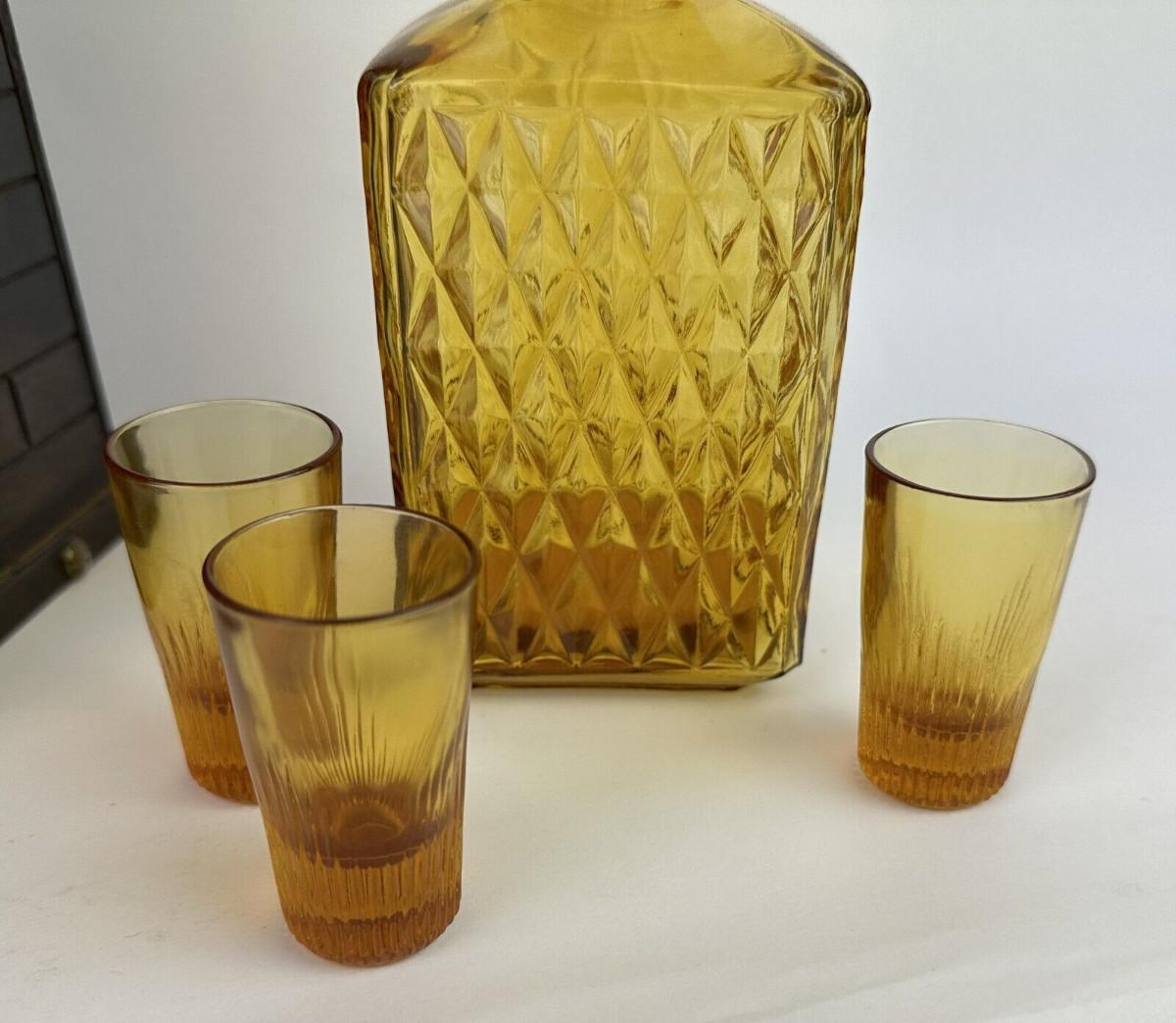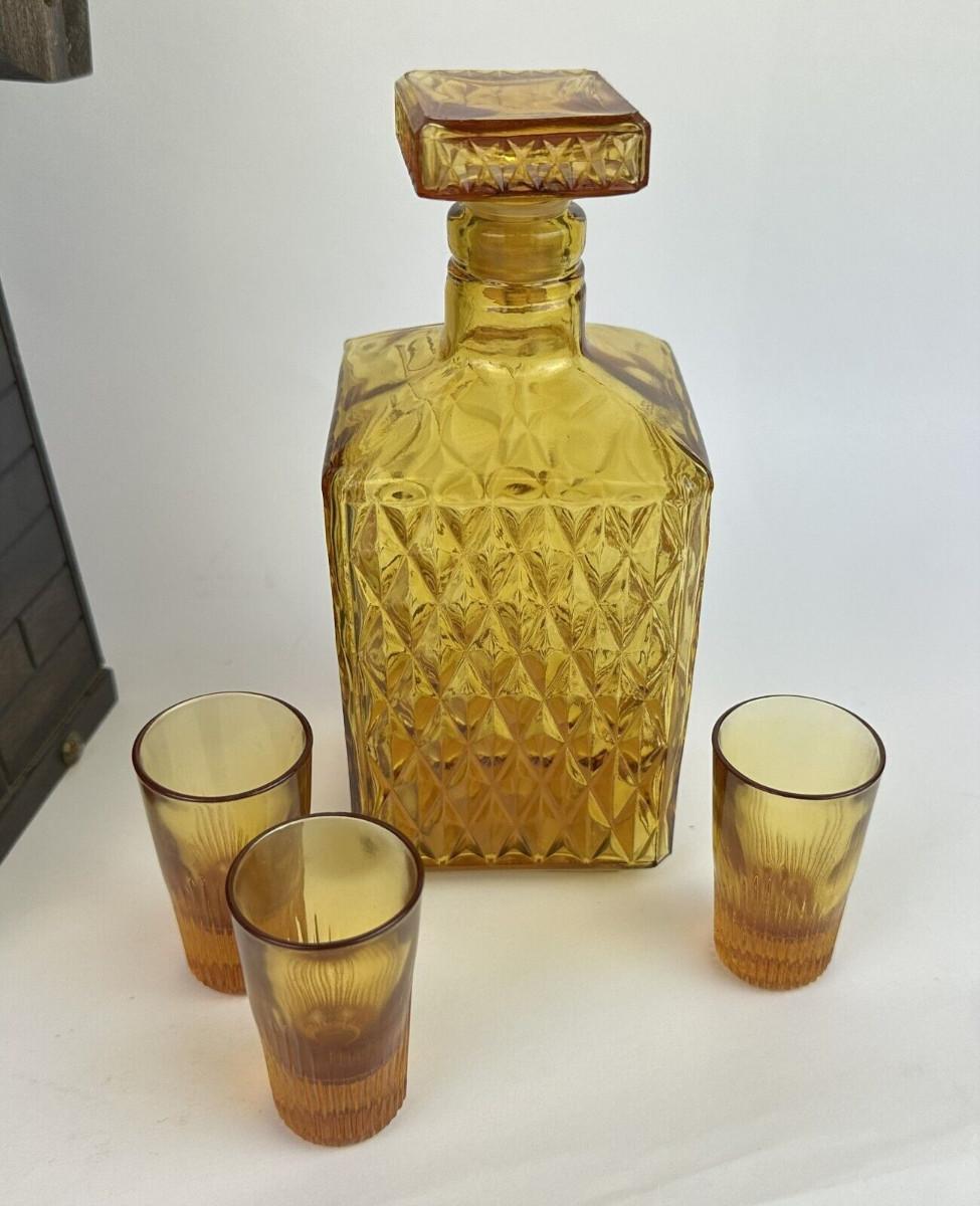 You can find this Medievel Castle Decanter Set in the 1970 Sears catalog...Measures approx. 8.5 x 8.5"...Wooden construction with a Coat of Arms above the door..Turrets open to reveal an amber glass decanter...three matching shot glasses...as shown...light wear...Retro barware.