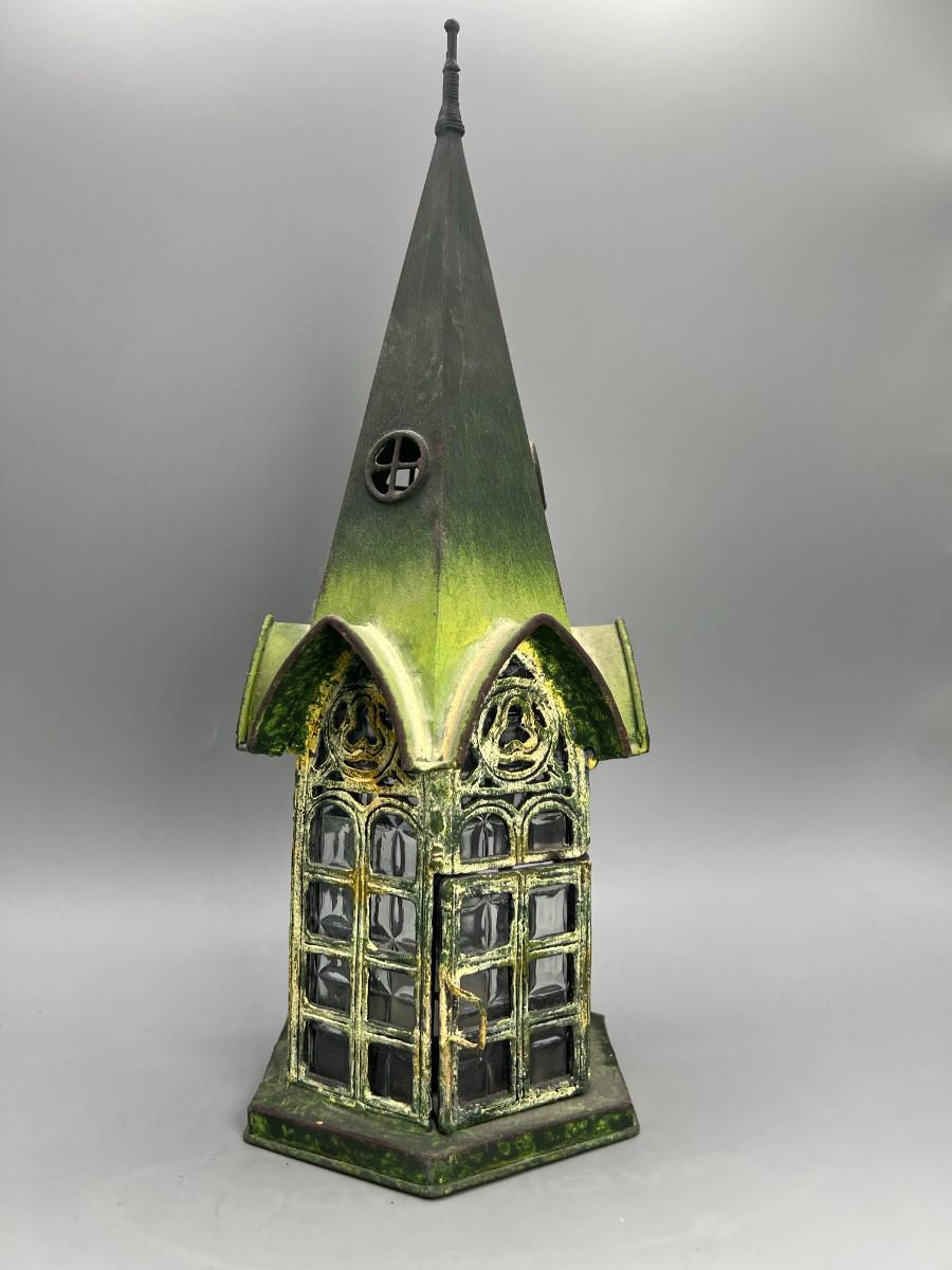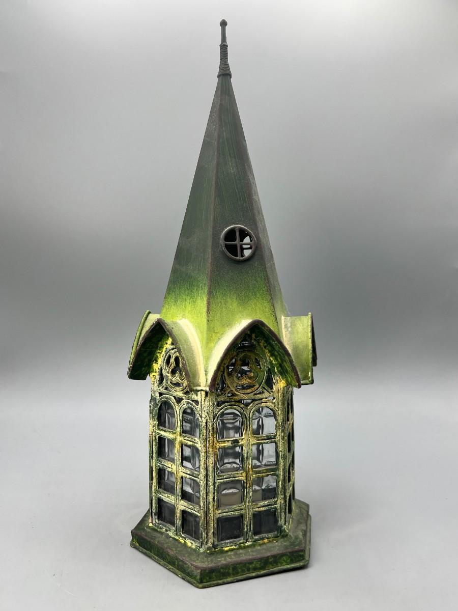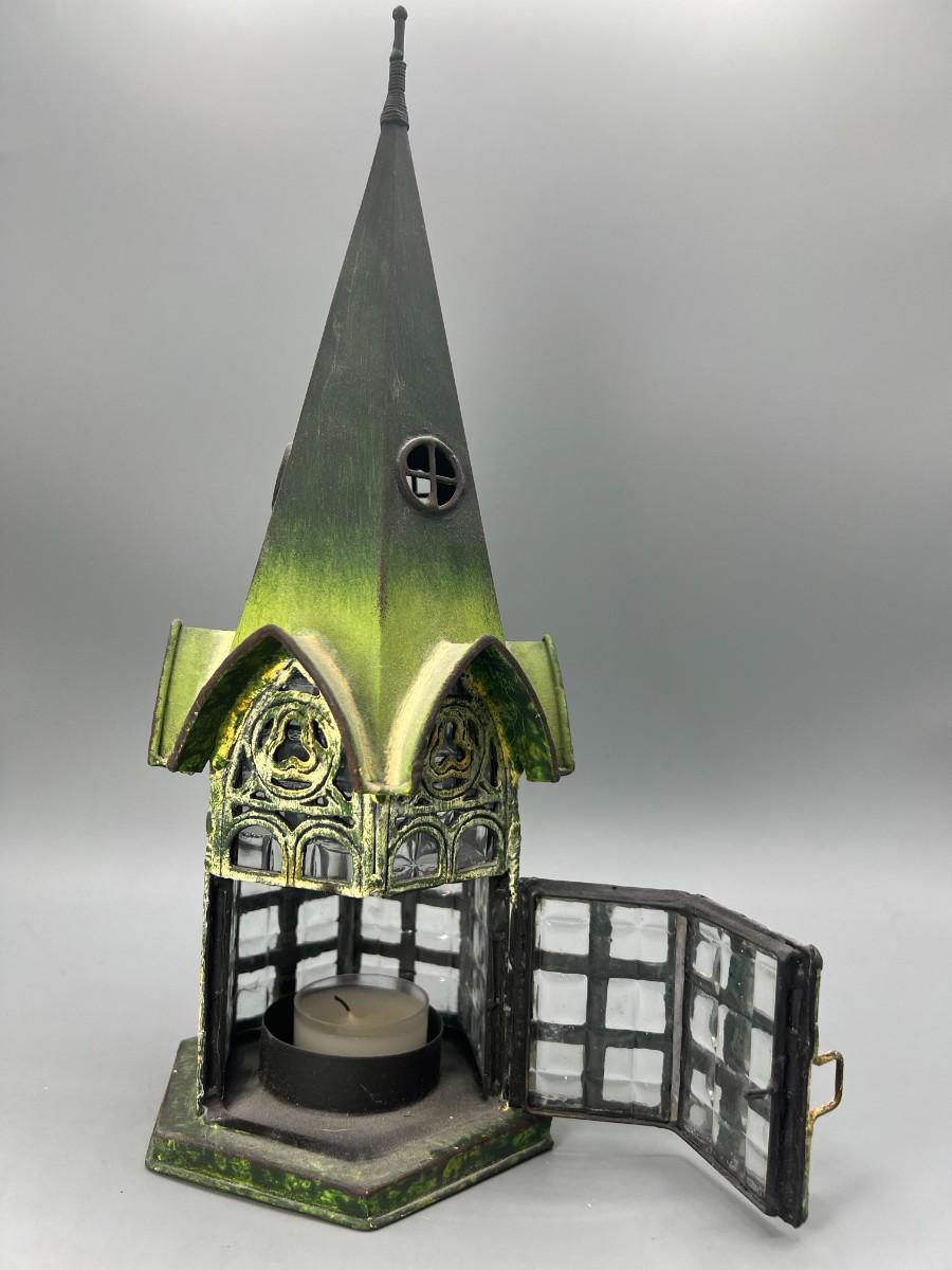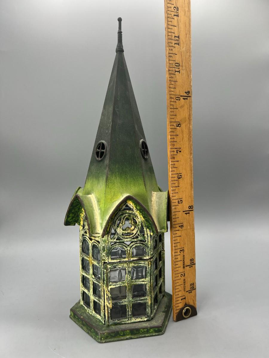 Gothic Style Pointed Cathedral Gazebo Green Patina & Glass Candle Holder Lantern