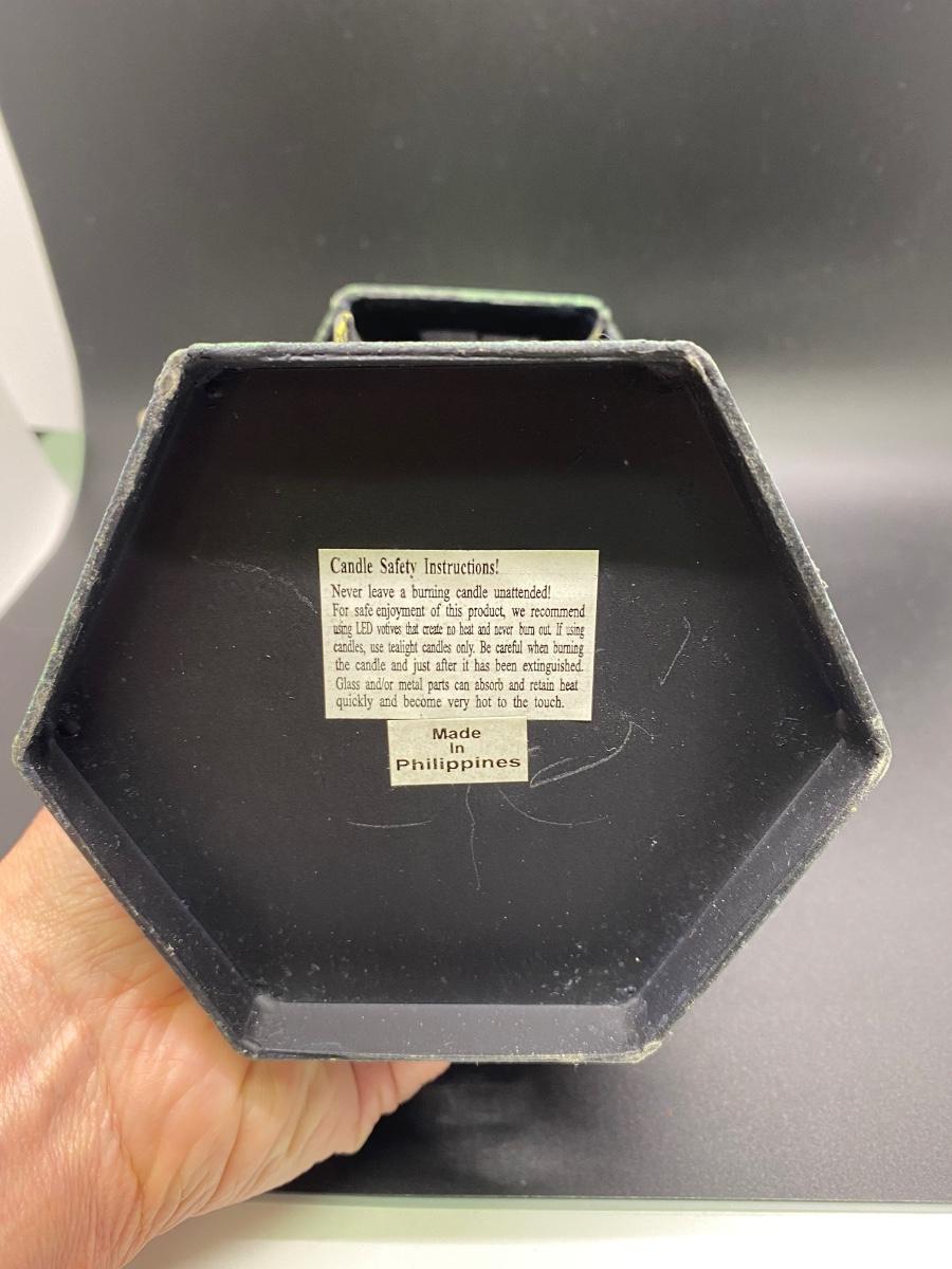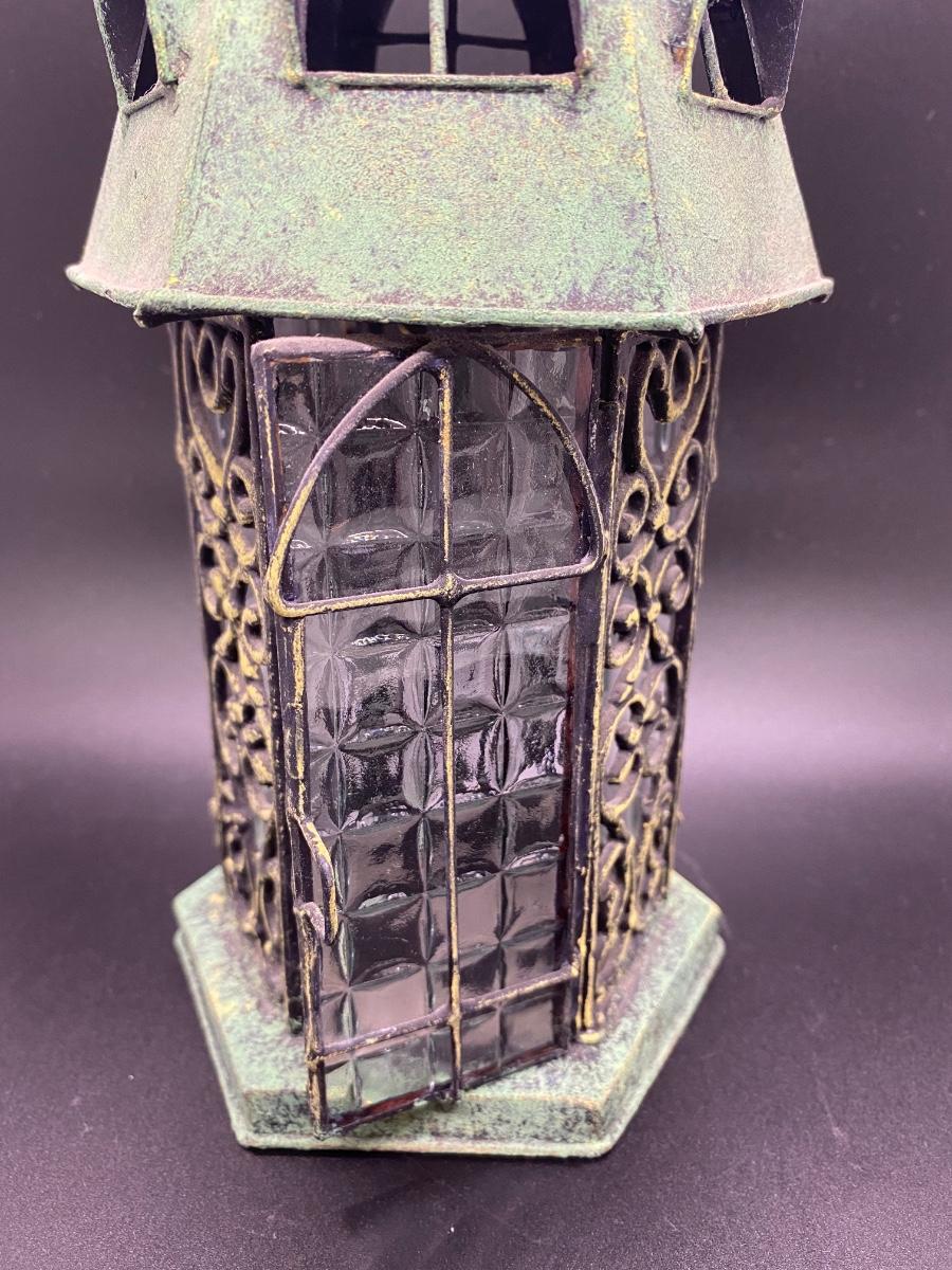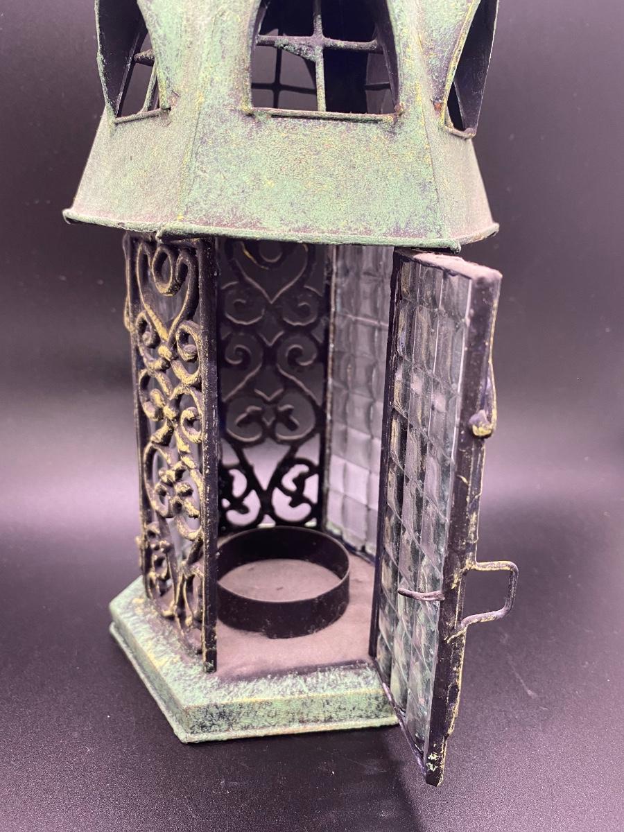 Weathered gothic style steeple candle holder. Nicely patinaed metal with glass panel body. Hinged door for candle access. Holds tealight and votive sized candles. Good condition, about 11" size.