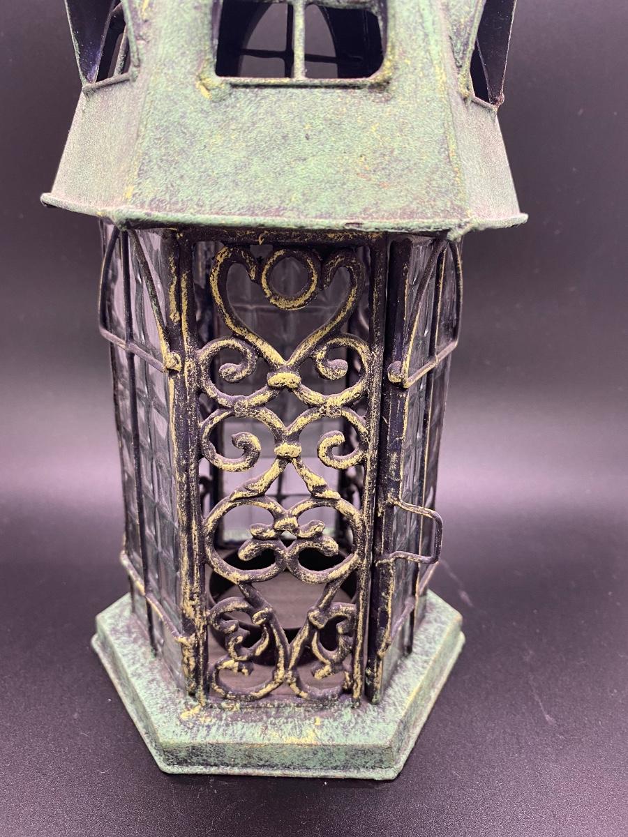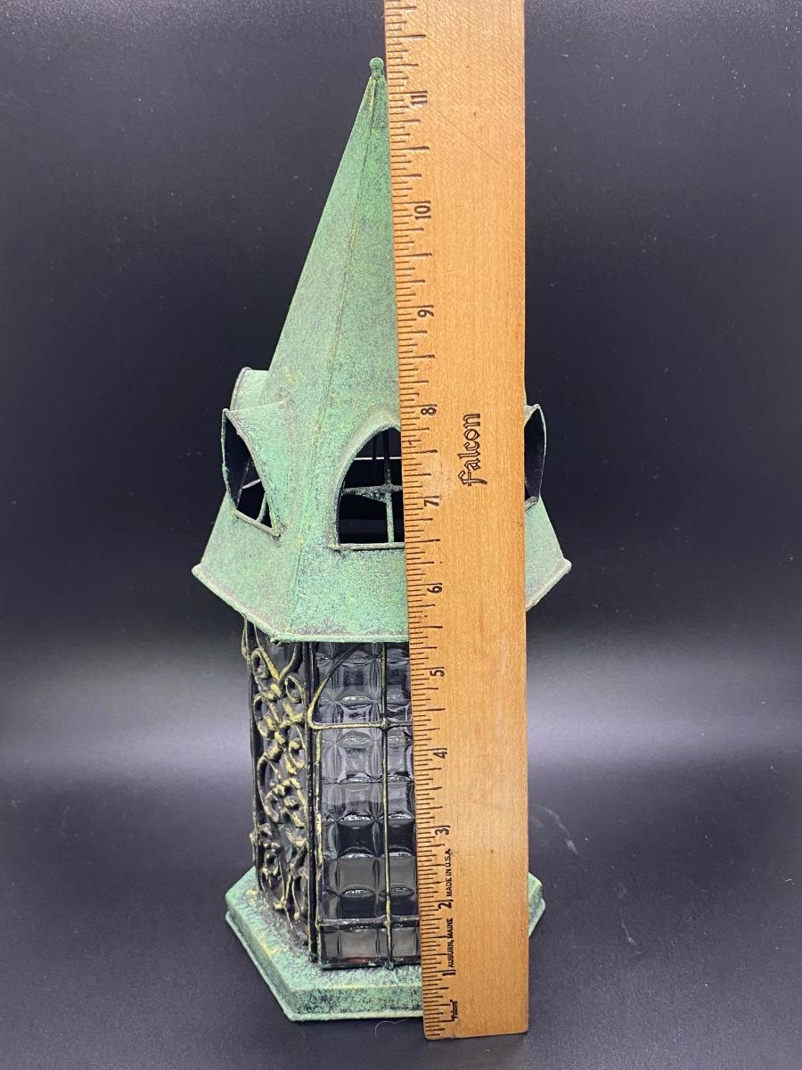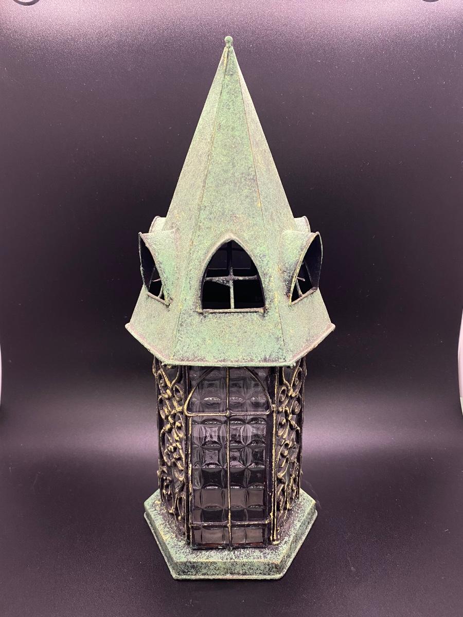 Gothic Style Steeple Gazebo Green Patina & Glass Candle Holder Lantern