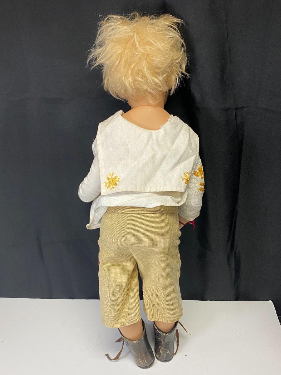 Ola by Sissel Skille & Gotz doll. 26" blonde hair blue eyed doll with a happy expression face. I am pretty sure this is not his original shirt, it does not fit right and from looking online he was in a red sweater, shoes are not original either. Doll is in good condition, hair is messy.