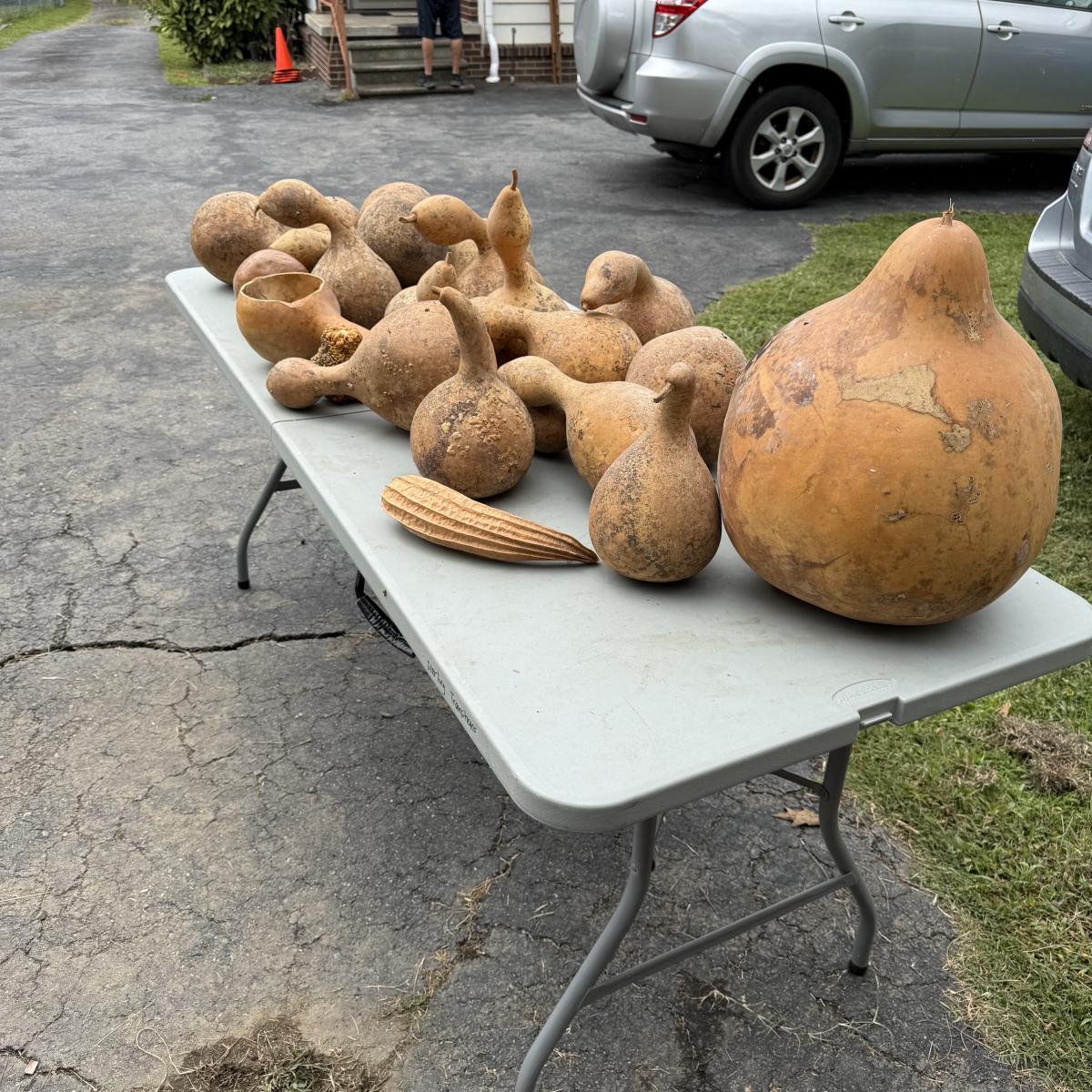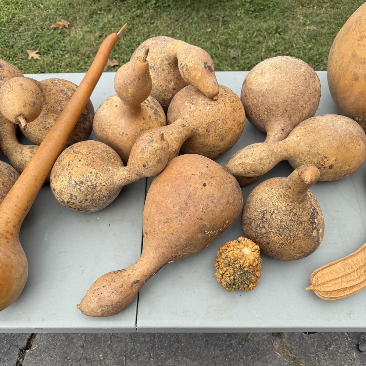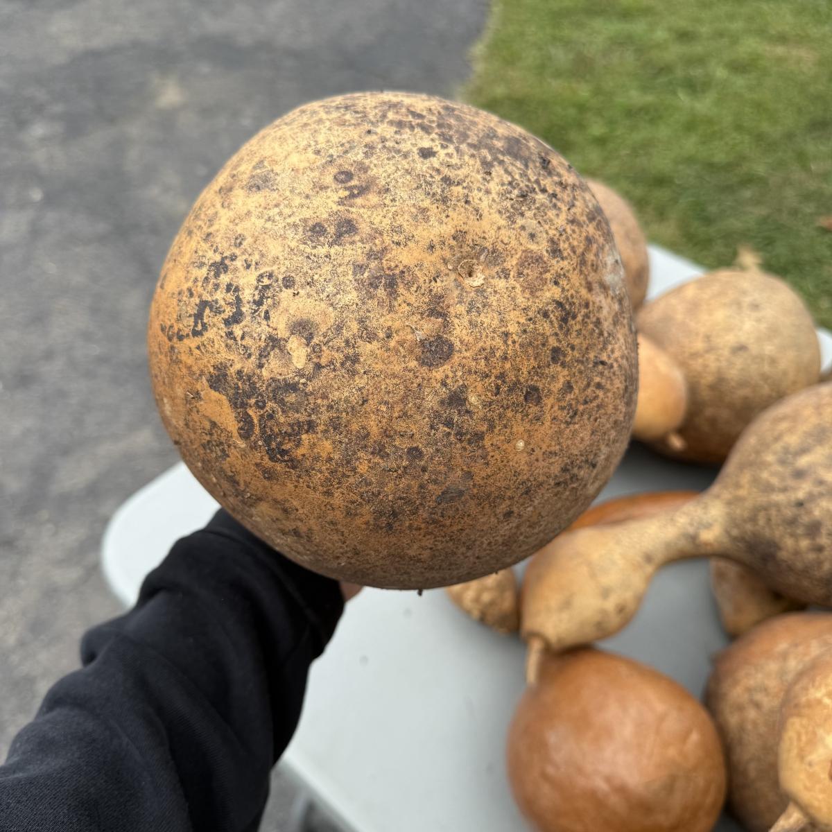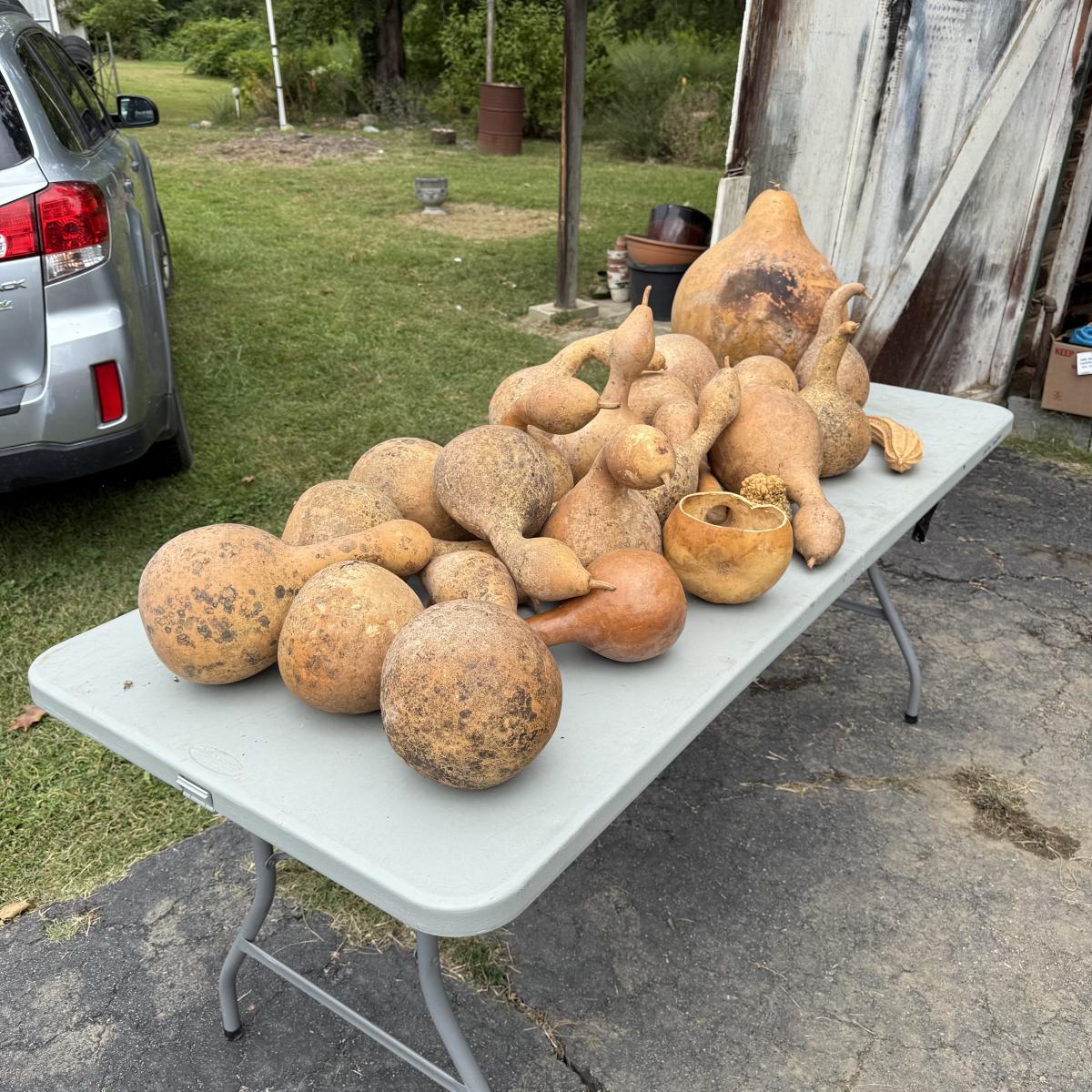 This lot contains 20 dried medium to large gourds. A majority are the same size with a couple of odd balls in there including a mega gourd that measures 13” x 17”H. Most of them measure around 6” x 11”H. There is some debris on most of them and one has been hollowed out. See pictures for details. Local pick up only.
