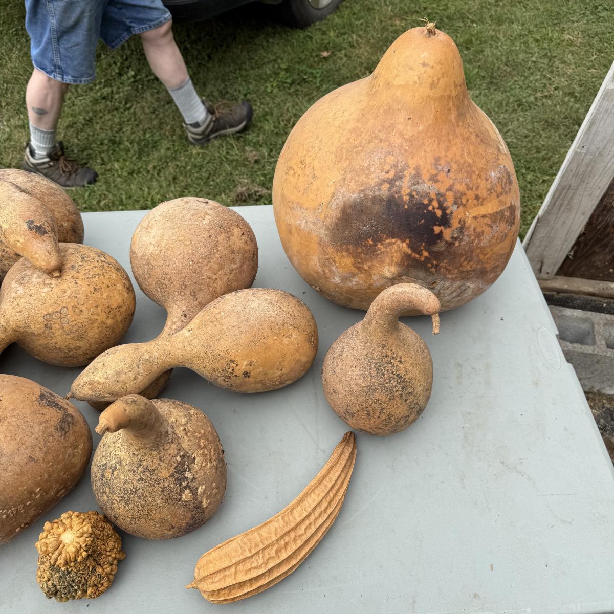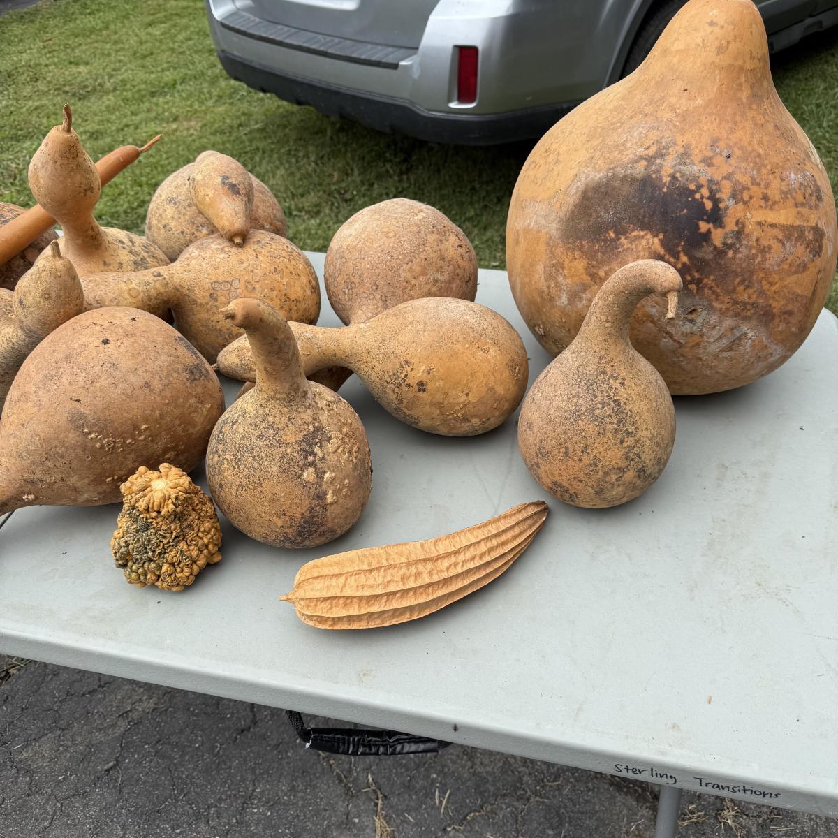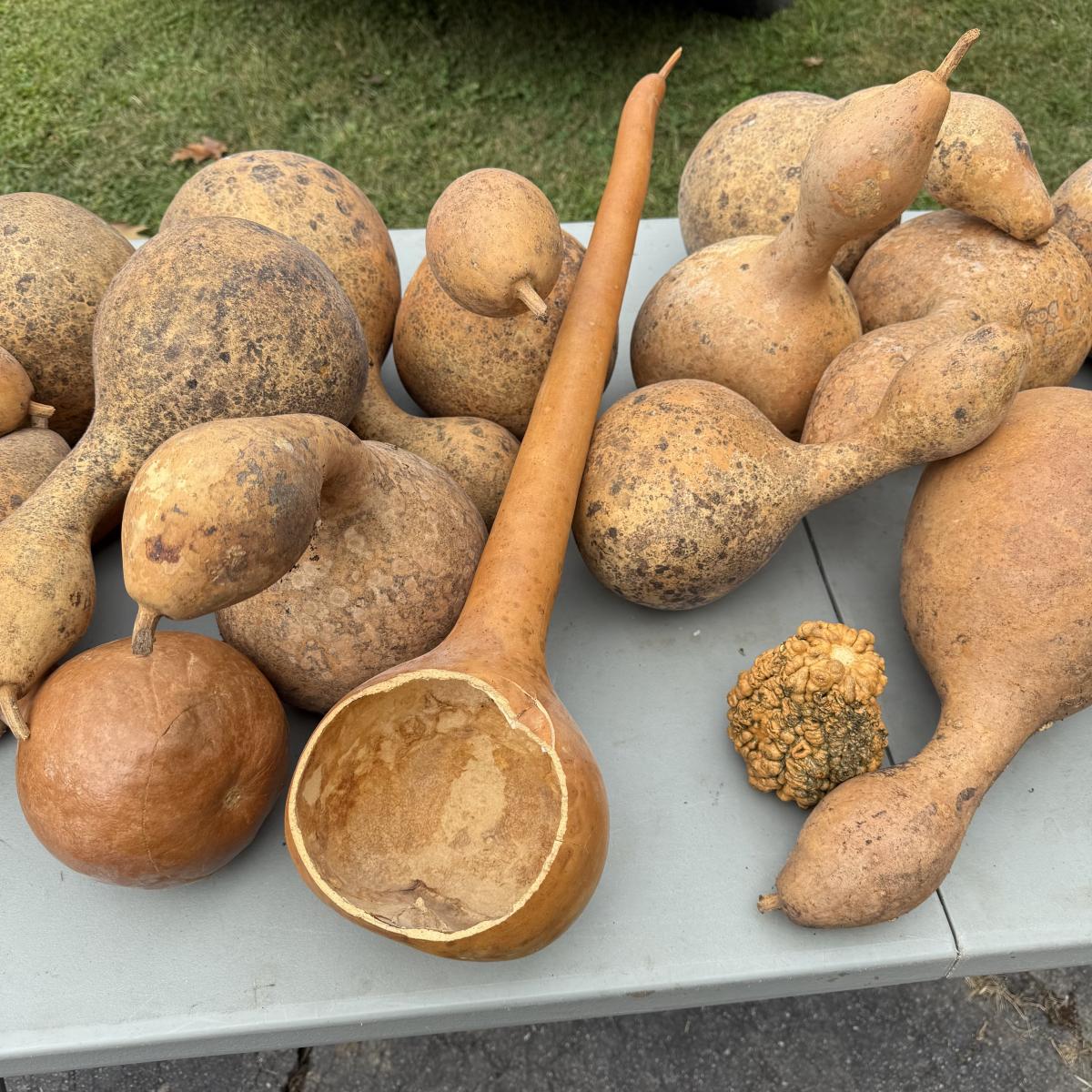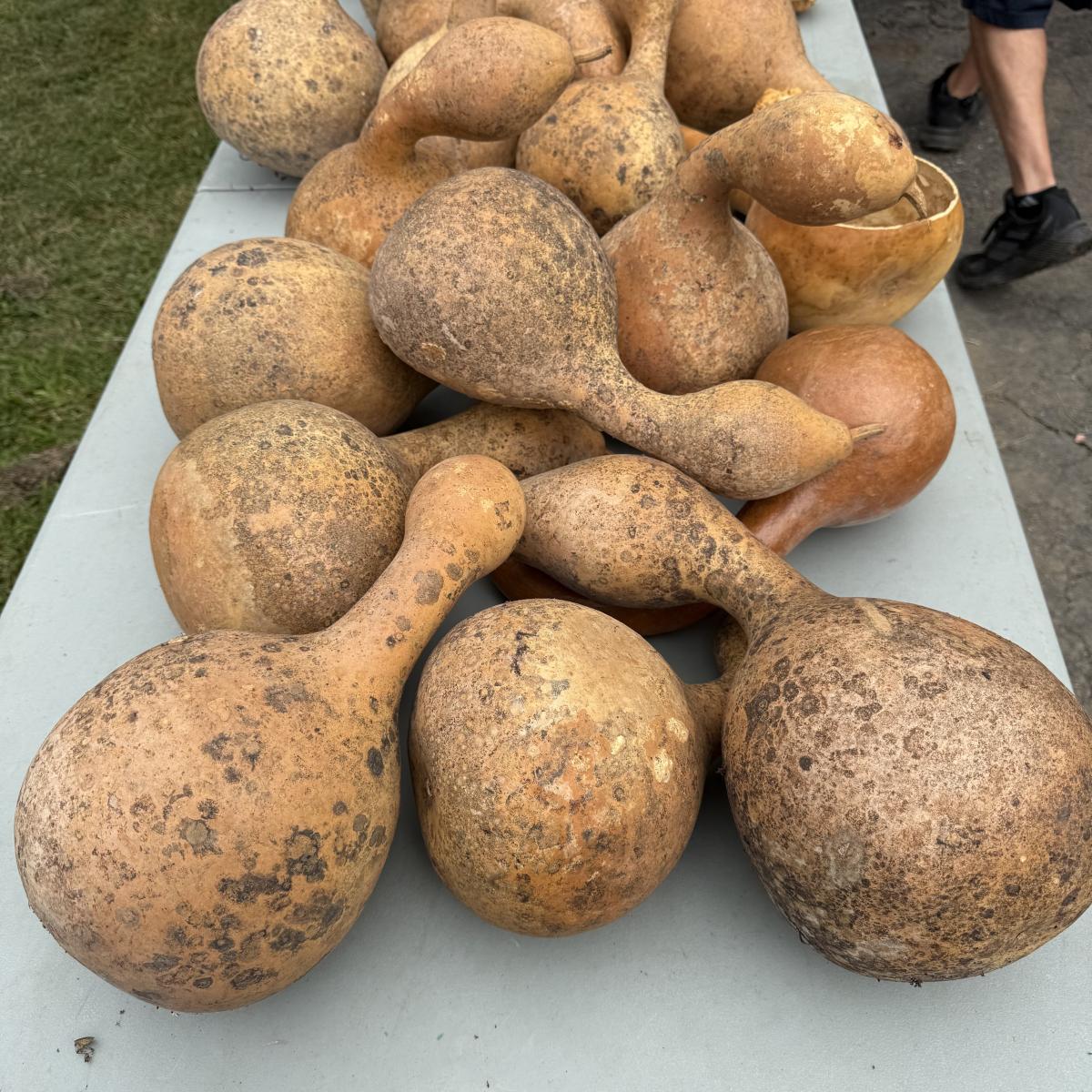 This lot contains 20 dried medium to large gourds. A majority are the same size with a couple of odd balls in there including a mega gourd that measures 13” x 17”H. Most of them measure around 6” x 11”H. There is some debris on most of them and one has been hollowed out. See pictures for details. Local pick up only.