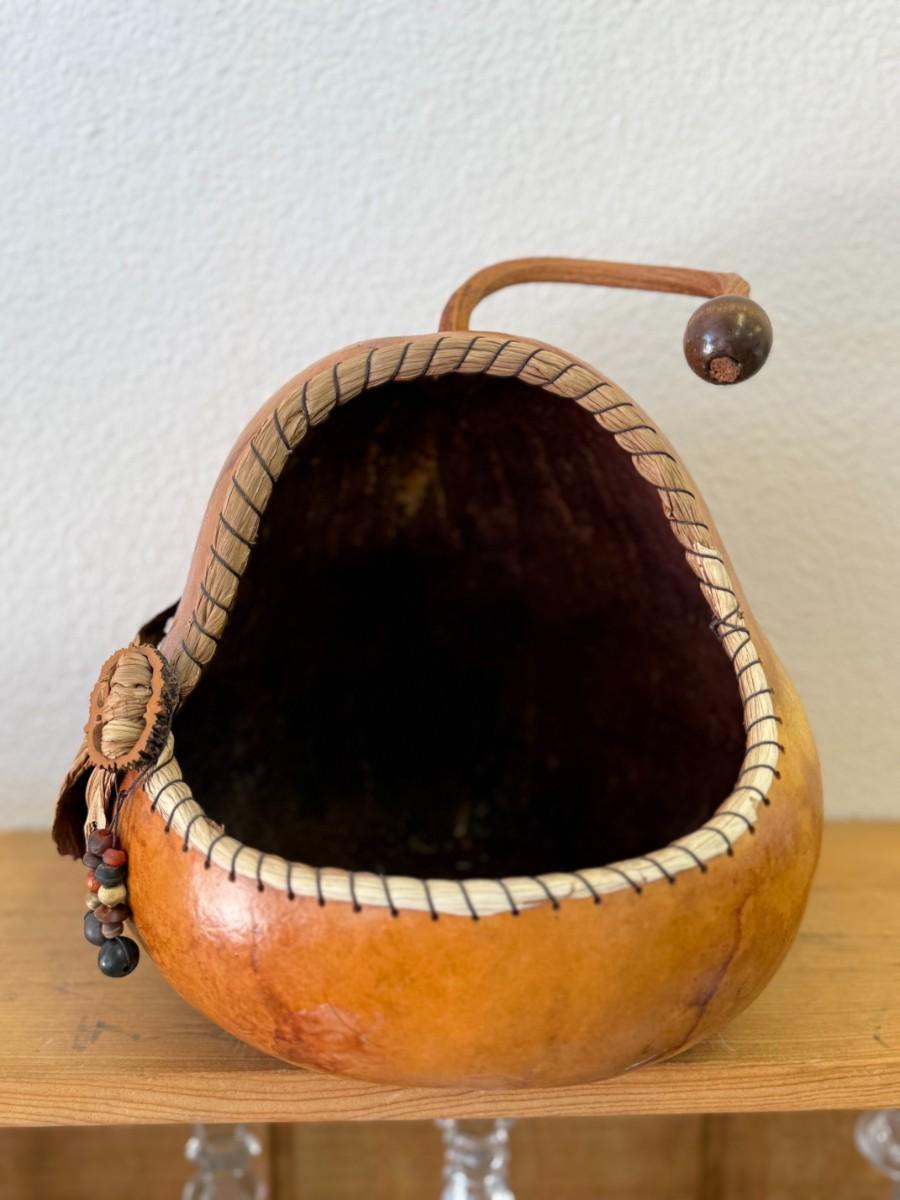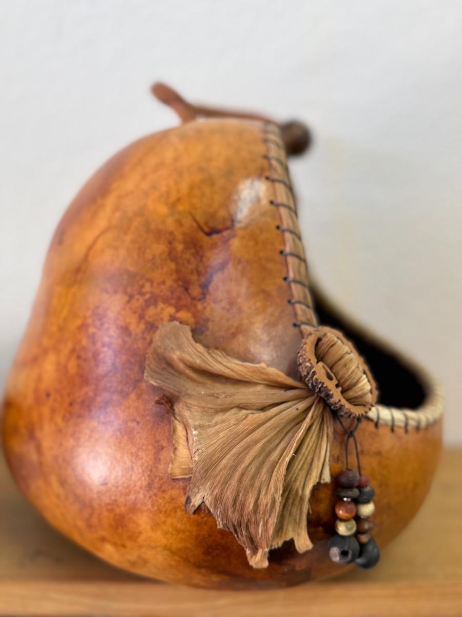 This unique gourd vessel dyed with GourdMaster dye showcases artistic craftsmanship and can serve as a beautiful decorative piece.