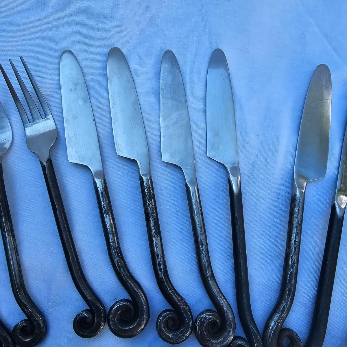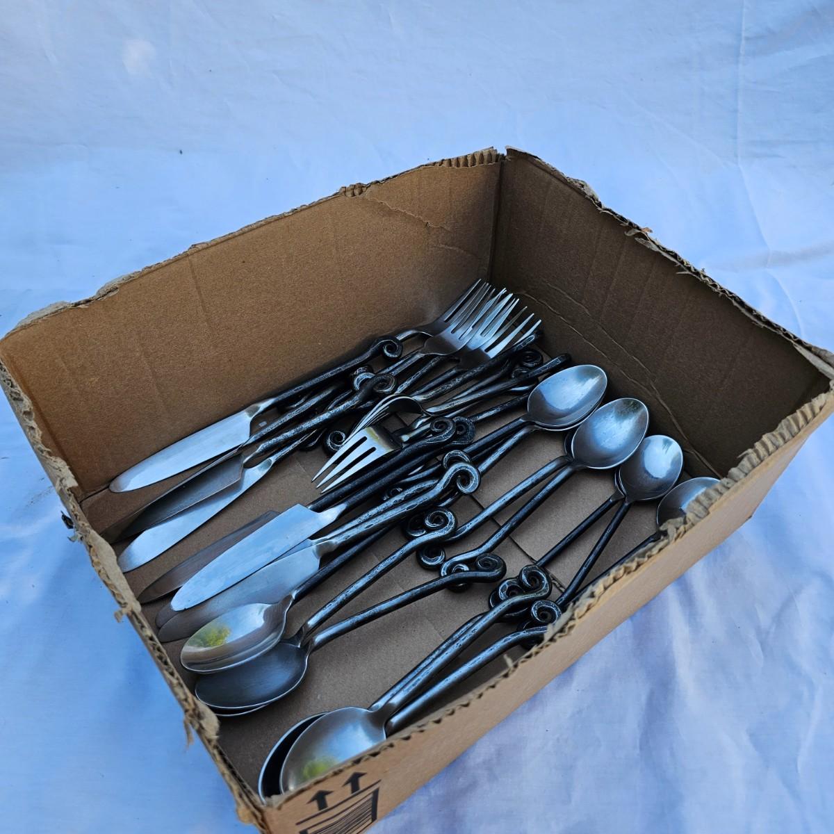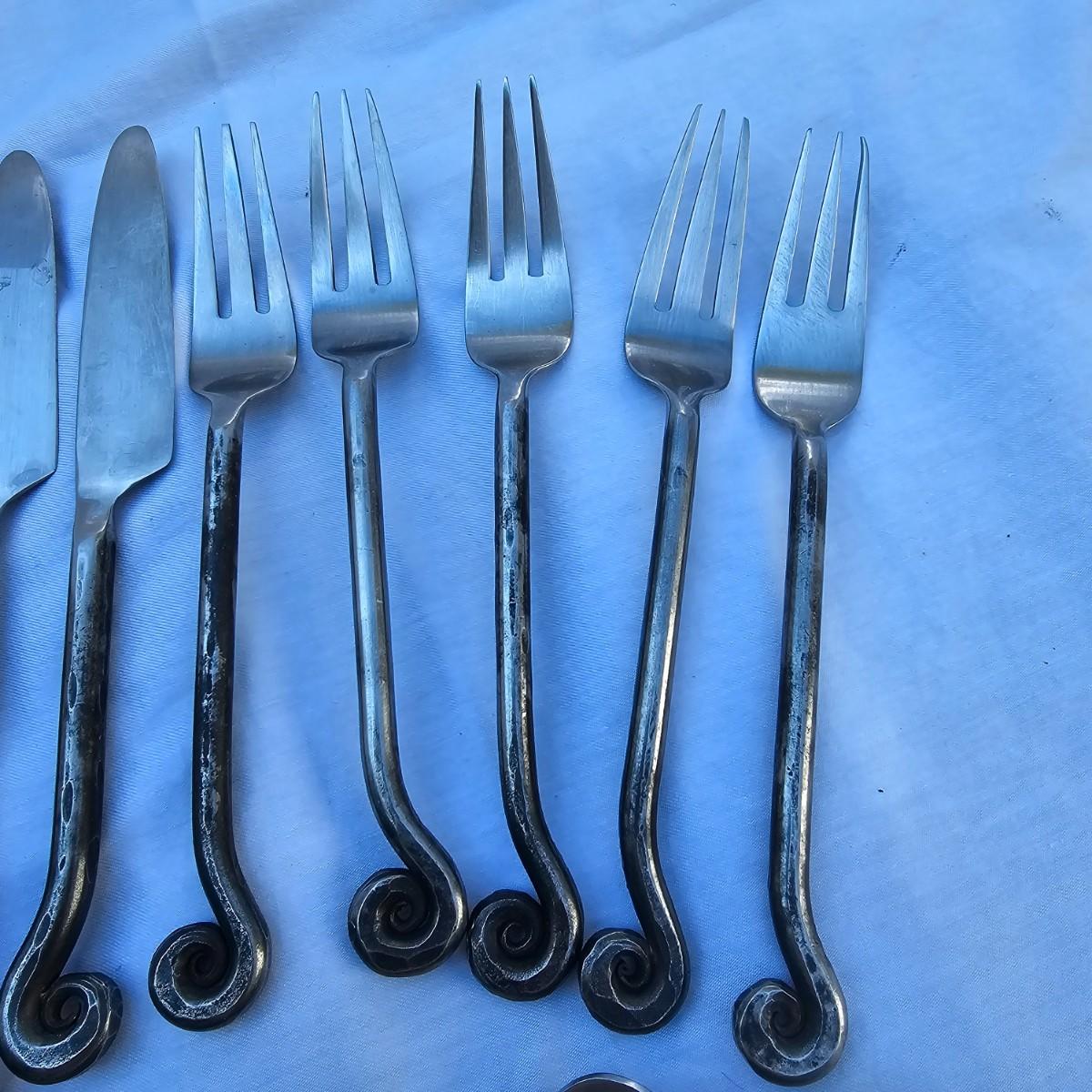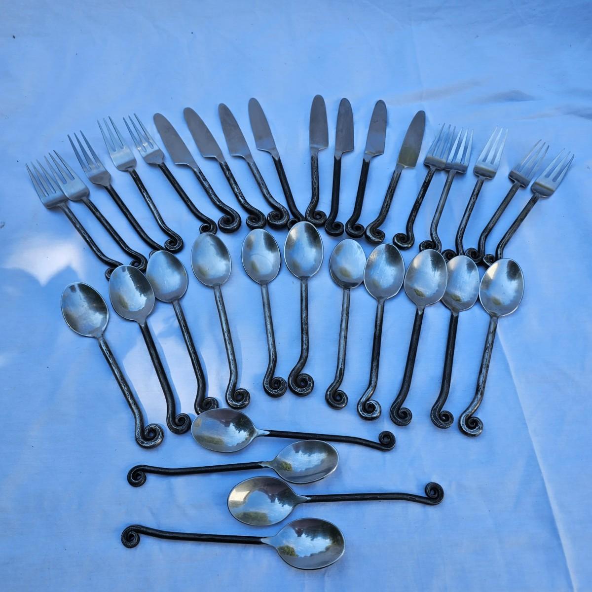 33 piece set of Gourmet Settings stainless steel flatware in the Treble Clef pattern. Each piece has a distinctive twirl at the bottom of the handle. Knives, forks and spoons, knives are approximately 9" in length. Stamp on back of spoons is gs 18/10 indicating type of stainless. See photos for details. Shipping available.