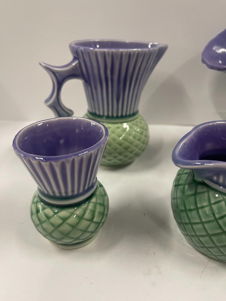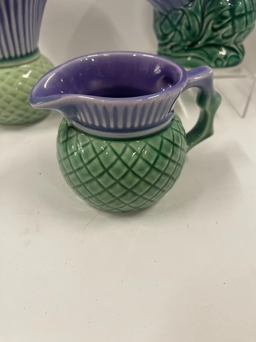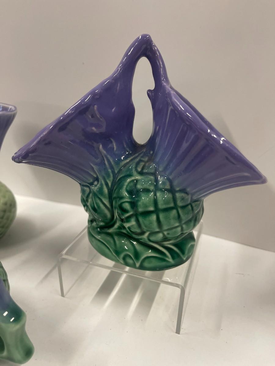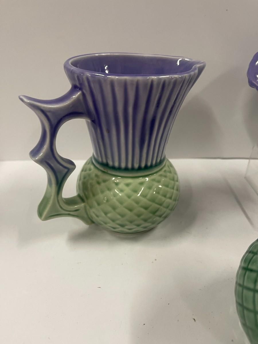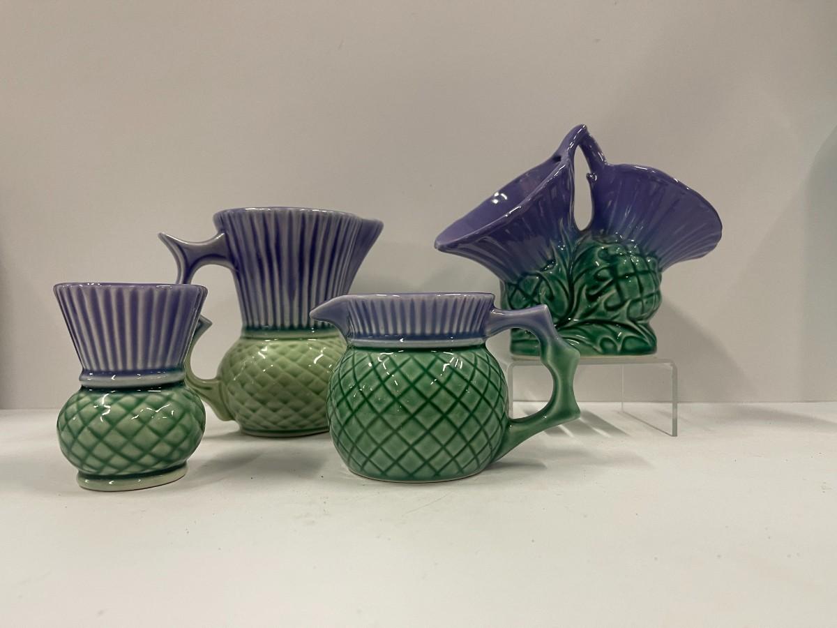 Govancroft Highland Ware from Scotland. For a sense of size, the small pitcher is about 5" high and the vase is 6" wide x 5" high, All in very good condition: no chips, cracks, crazing.