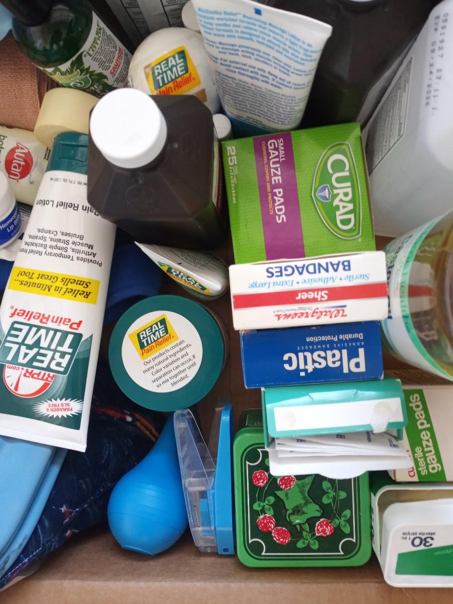 GRAB BAG BOX OF FIRST AID AND HEALTH ITEMS