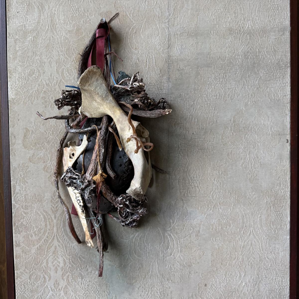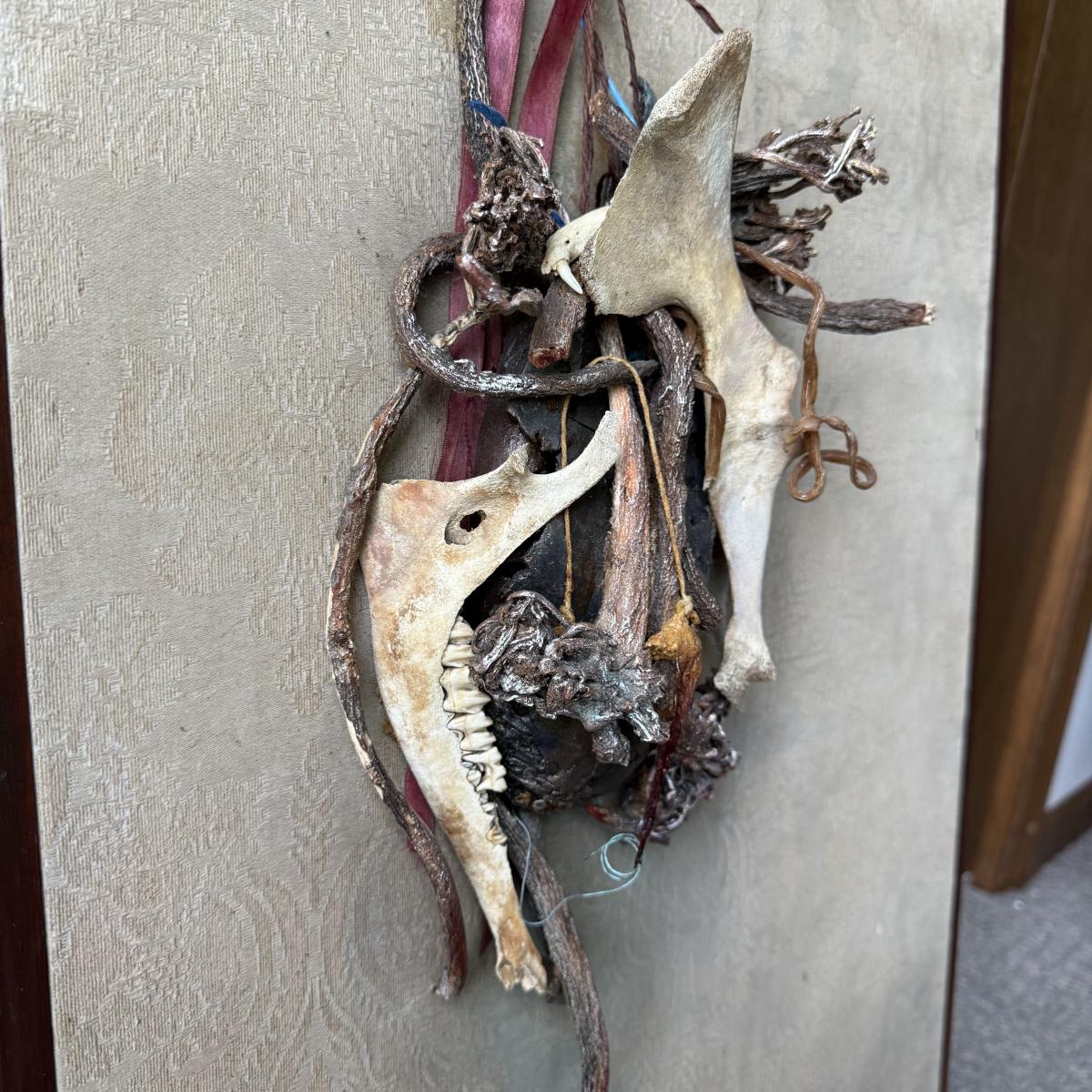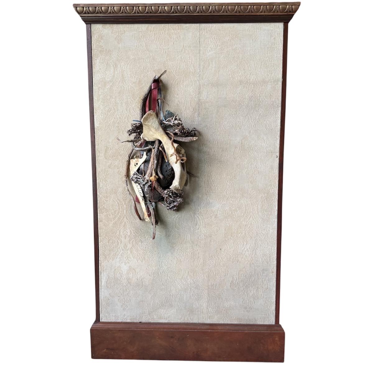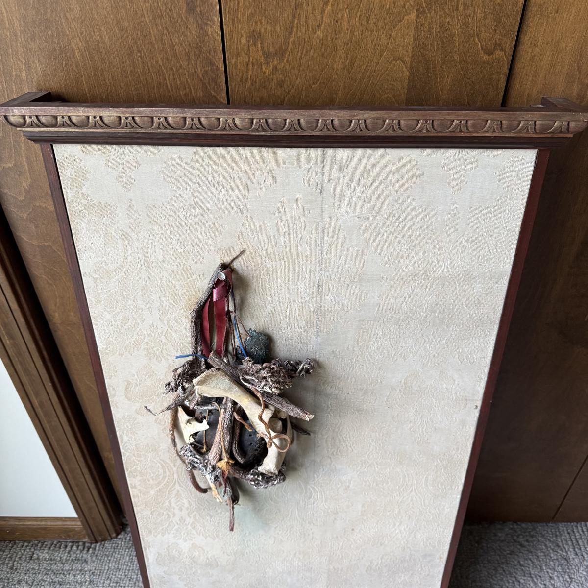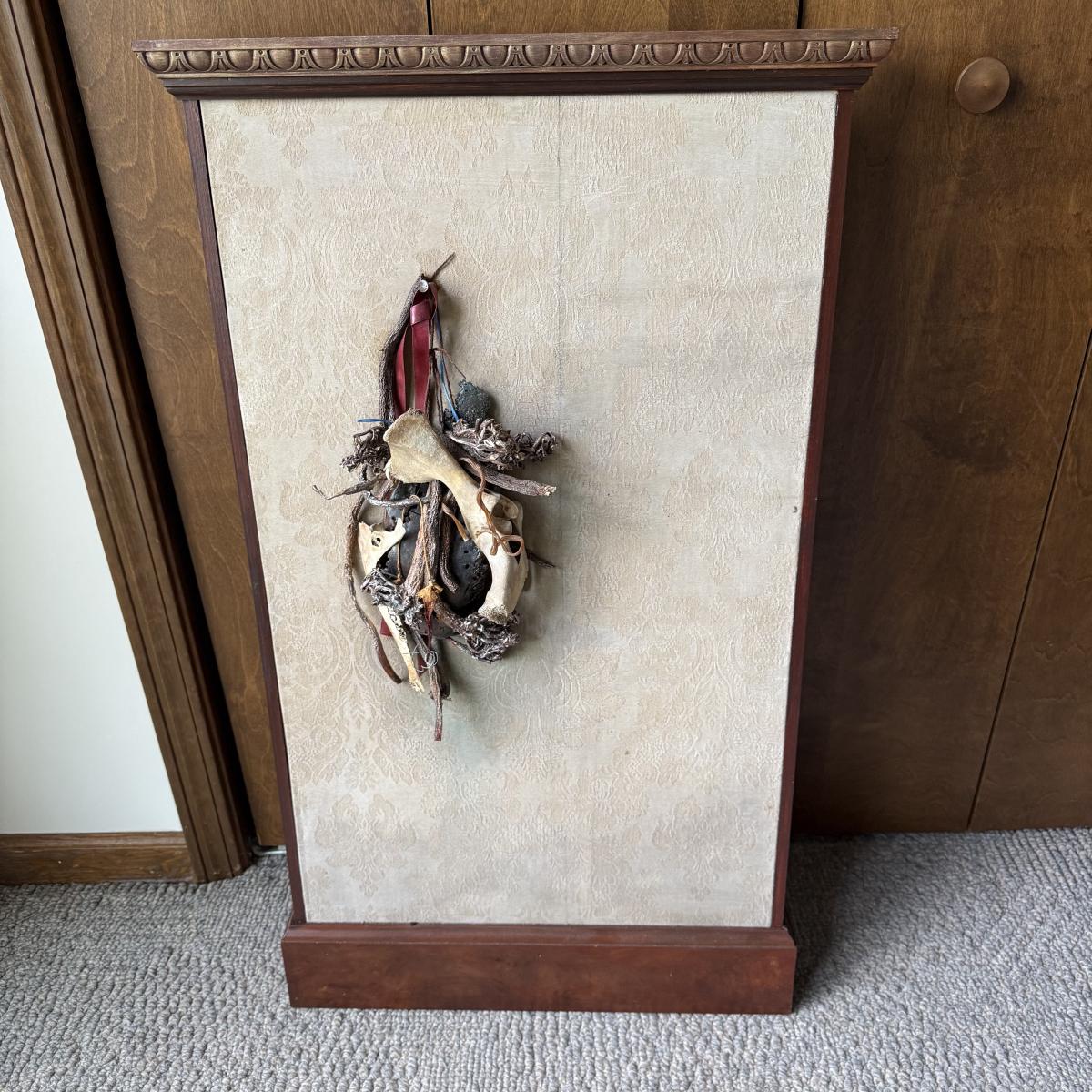 This lot contains a spectacular mixed media abstract piece of art. The piece includes but is not limited to bones, ribbons, metal, and fabric. It sits in a shadowbox style frame. This item measures 22.5” x 38”H, (comes out from wall). It does have hardware to be hung.