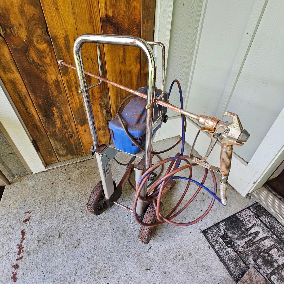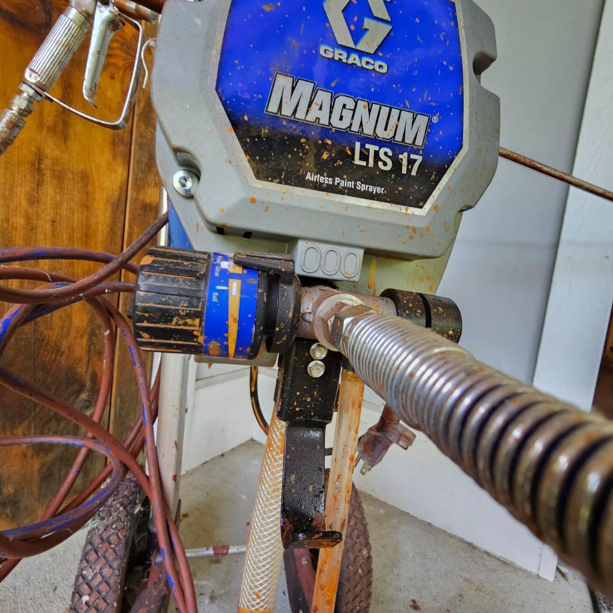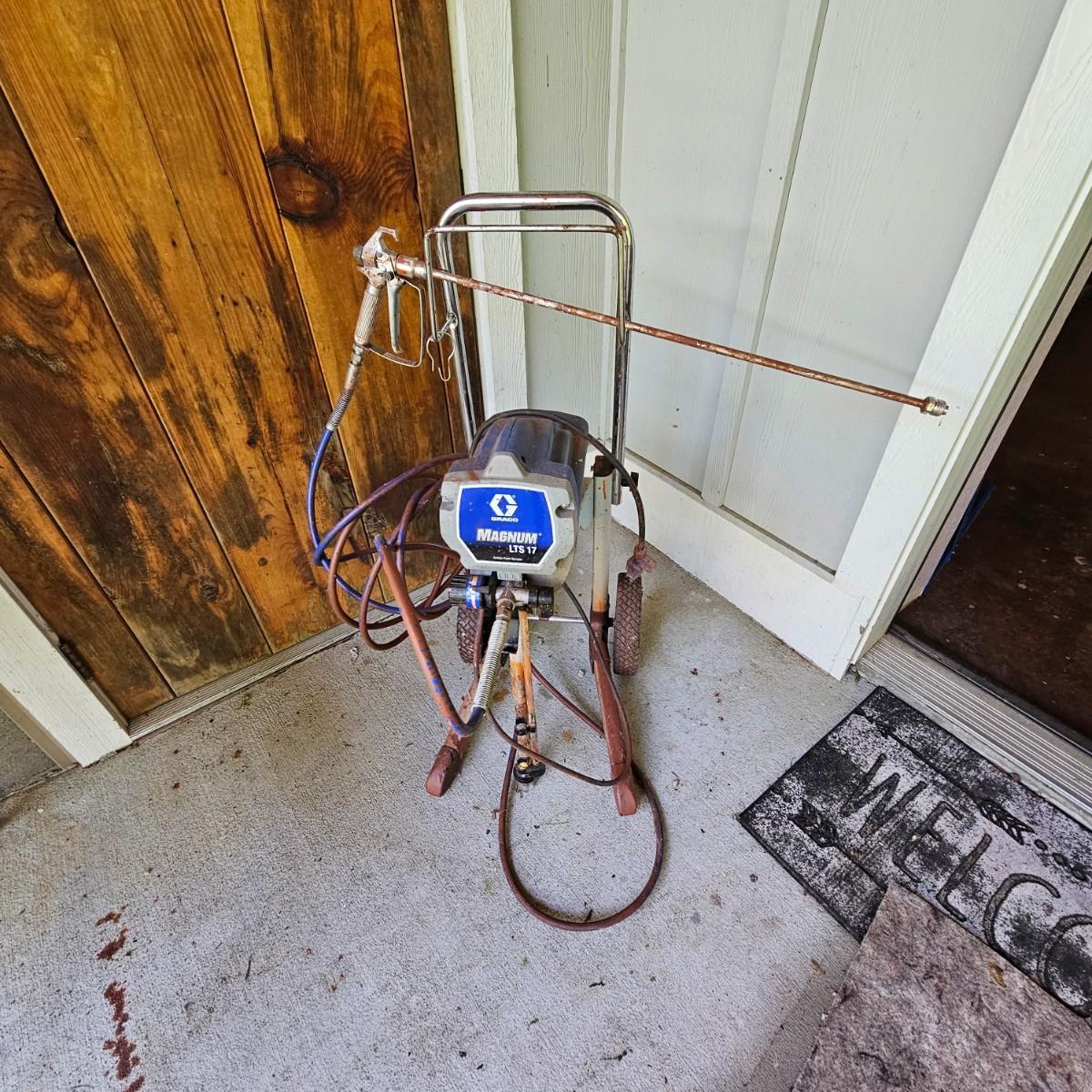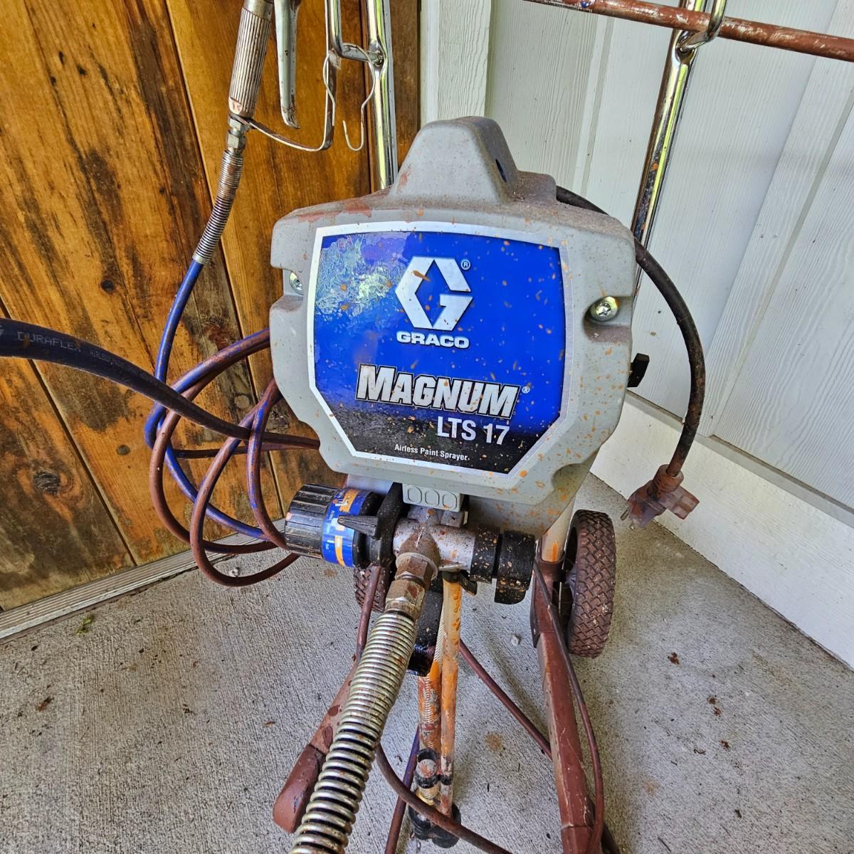 Graco Magnum LTS 17 paint sprayer and cart. Unit is designed to siphon paint from buckets via hose. Measures 15" x 24" x 37"H, powered on when plugged in. Delivery hose with wand type handle and spray head, see photos for details. Local pickup only.