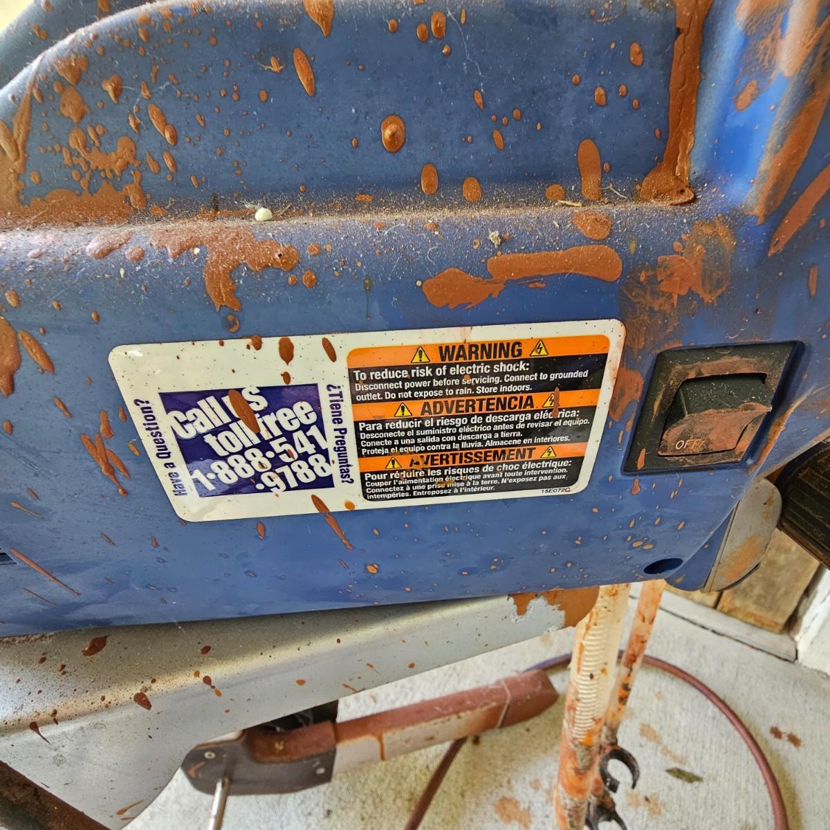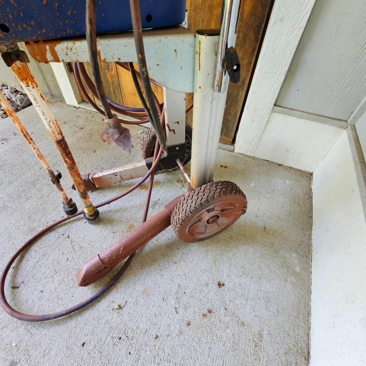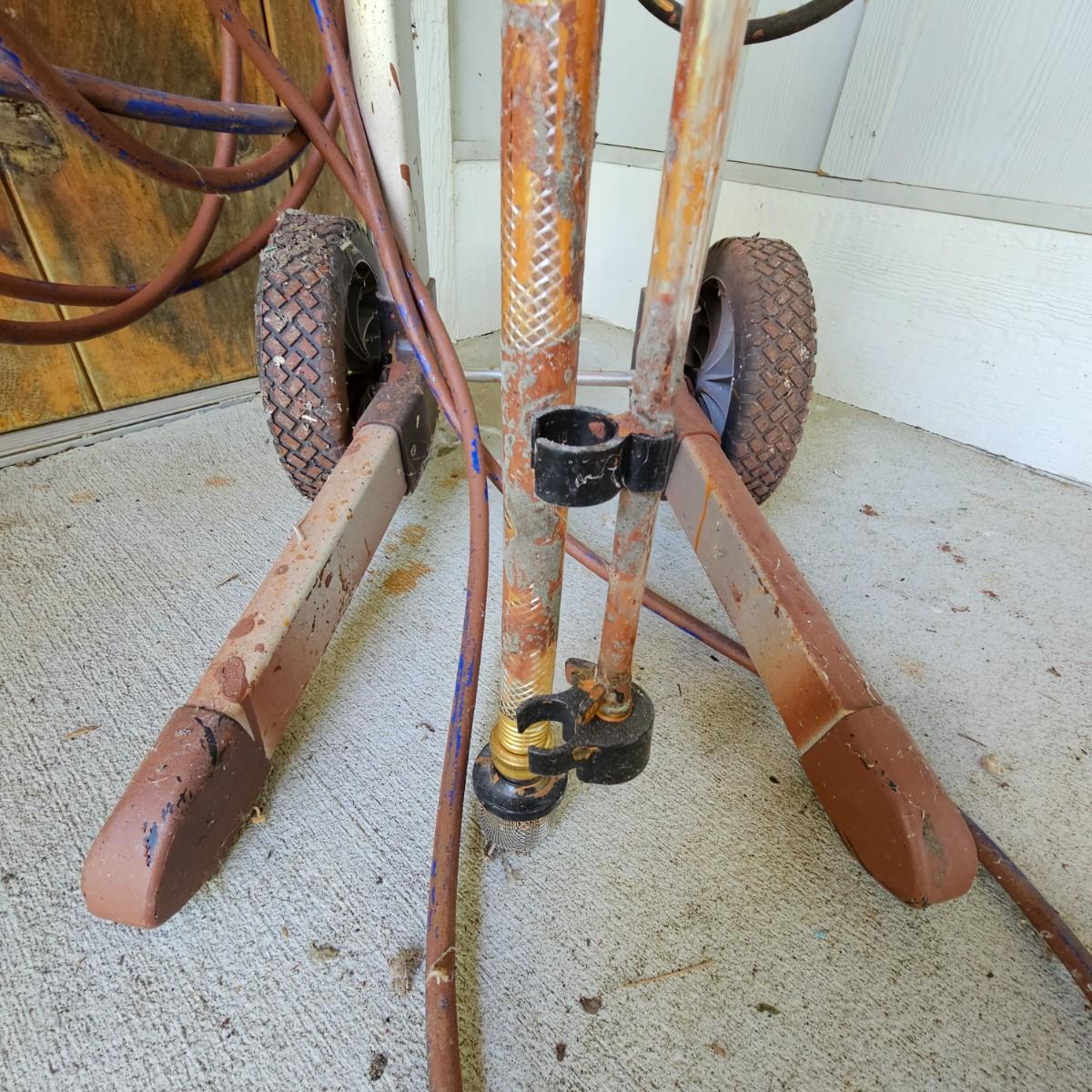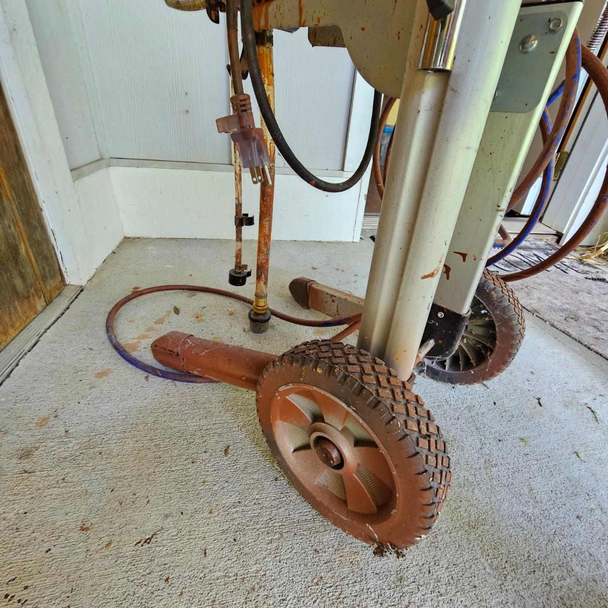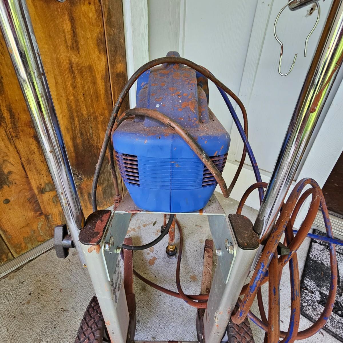 Graco Magnum LTS 17 paint sprayer and cart. Unit is designed to siphon paint from buckets via hose. Measures 15" x 24" x 37"H, powered on when plugged in. Delivery hose with wand type handle and spray head, see photos for details. Local pickup only.
