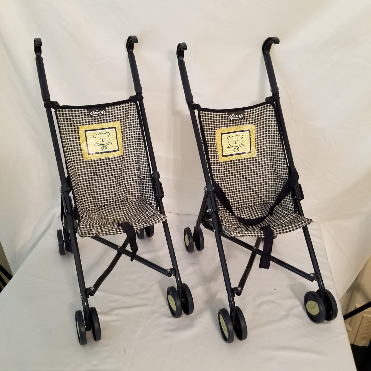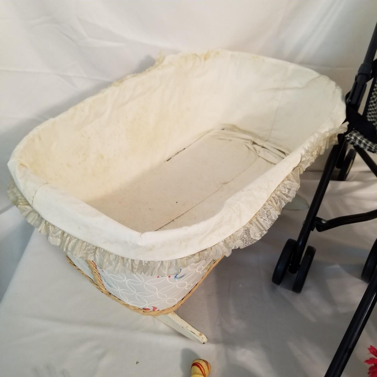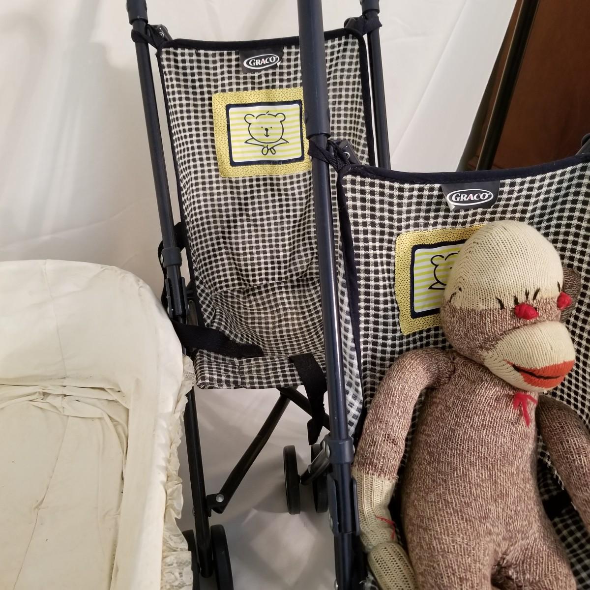 Two Tollytots Graco strollers, one sock monkey plush toy, a vintage rocking cradle and some assorted child's toys. See photos for detail. Crib is 20" x12" x10", strollers are 10" x19" x24". All items gently loved. Local pickup only.