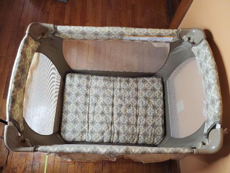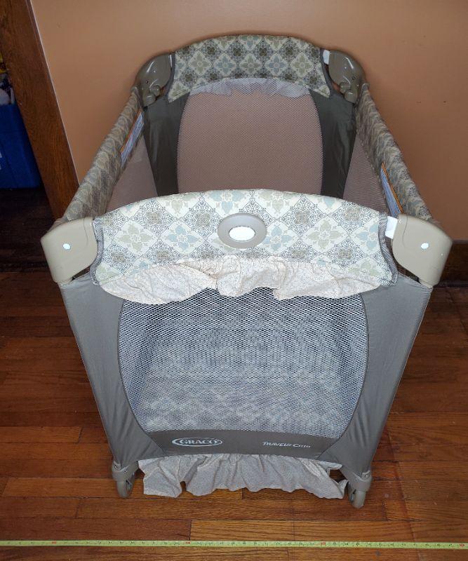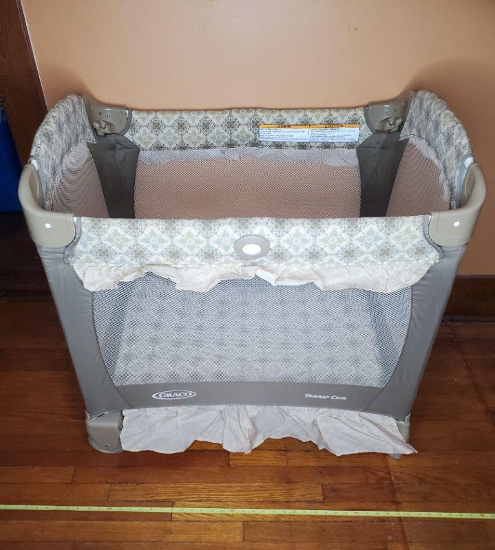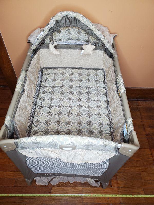 Gender Neutral Graco Pack n Play Travel Crib with removable bassinet and removable mobile. No holes in the netting, good clean condition.