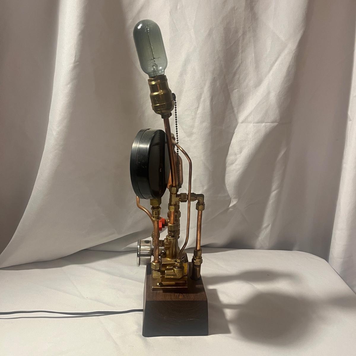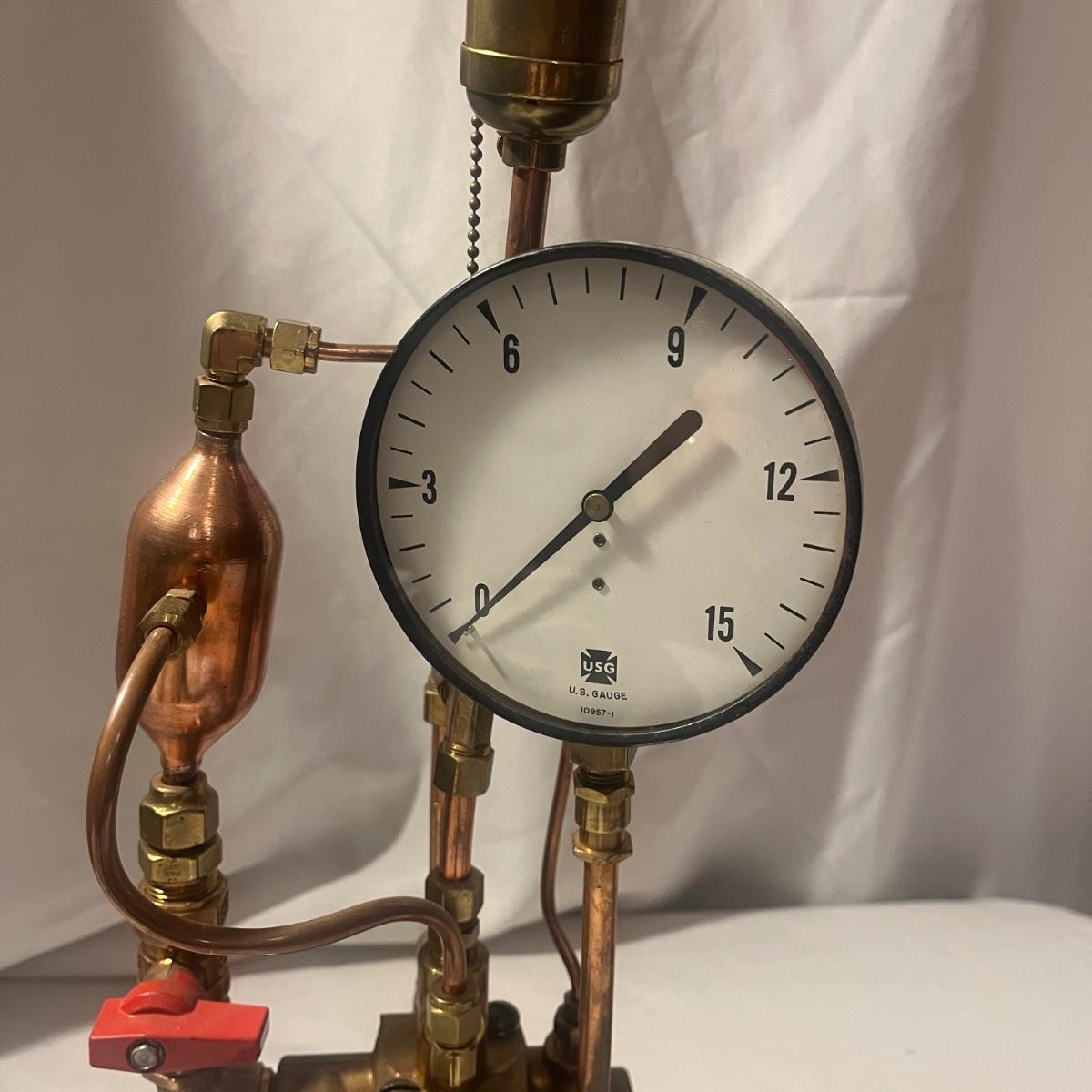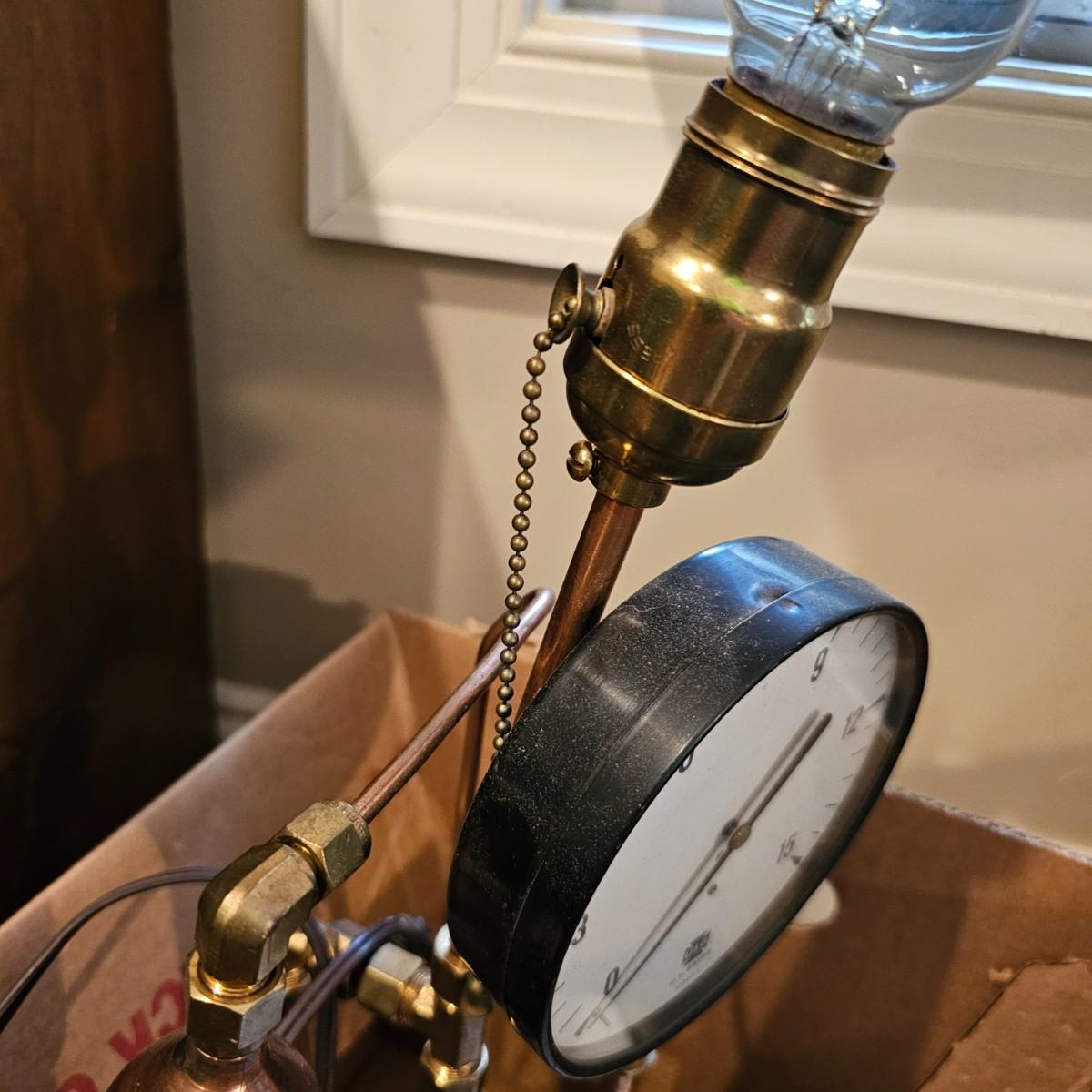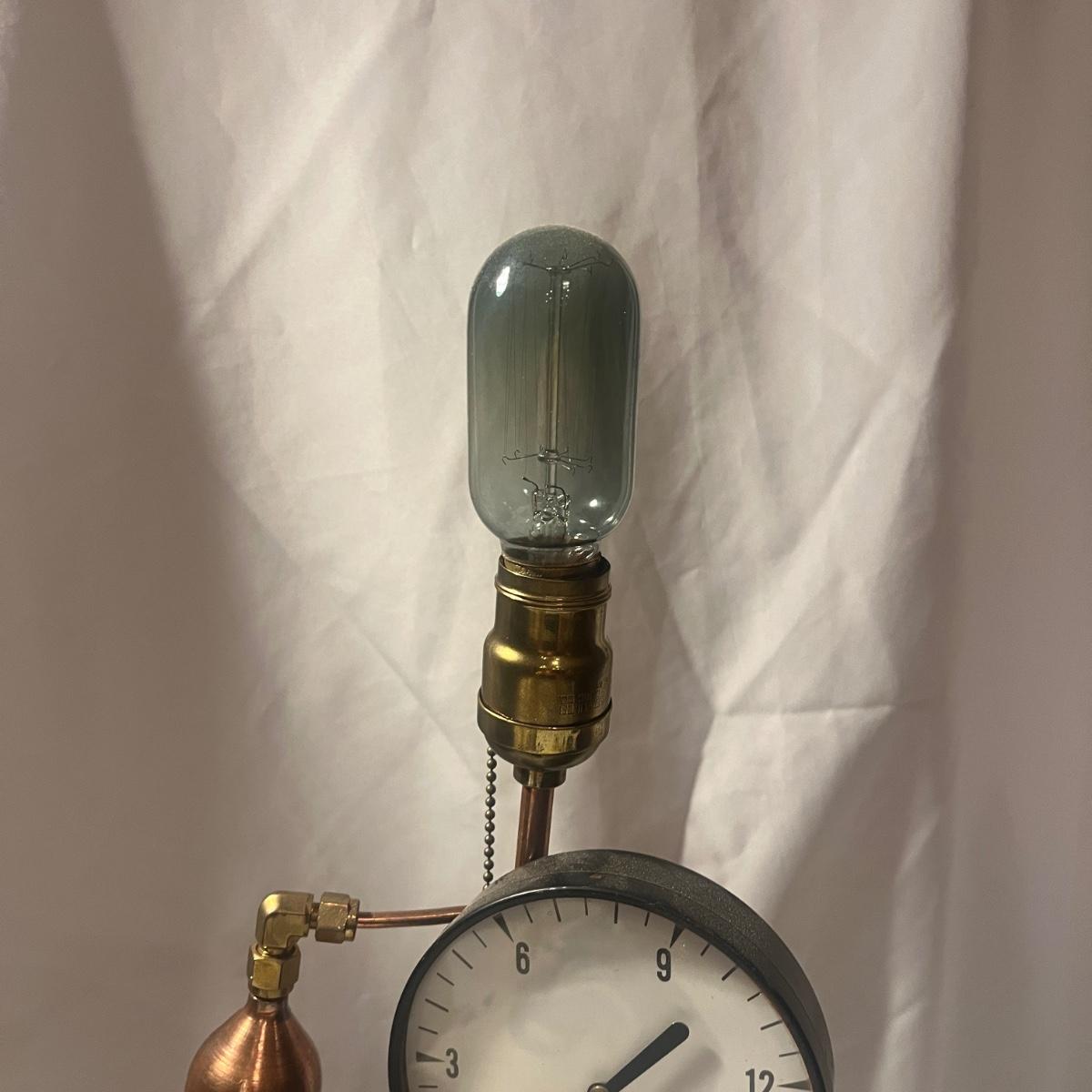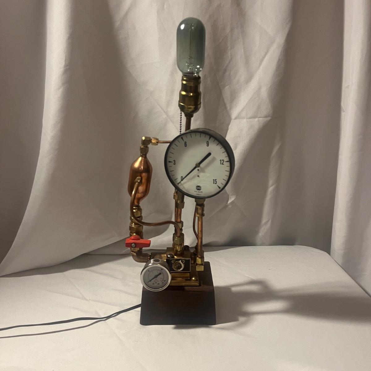 This unique steampunk style table lamp by artist Graeme Priddle is titled “Under Pressure” and measures 6.5” x 5” x 22”H. Lamp powered on when plugged in, single on-off pull chain.Also includes one extra Edison bulb.