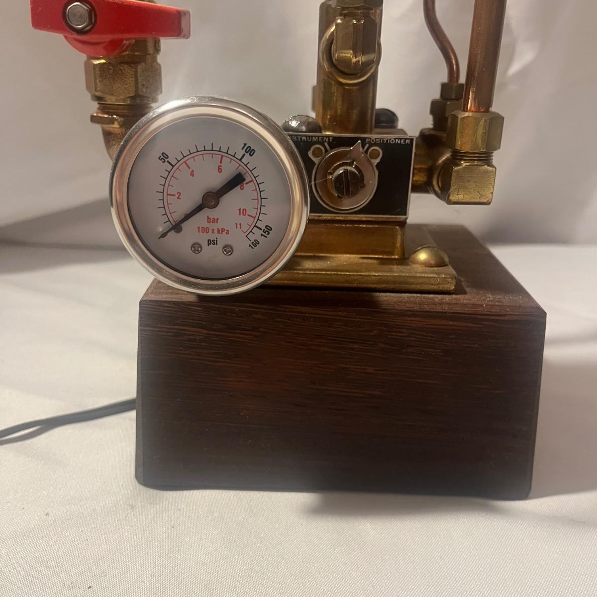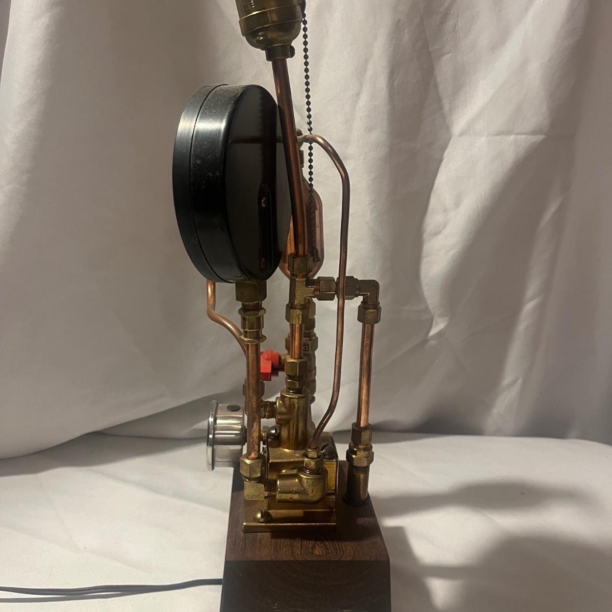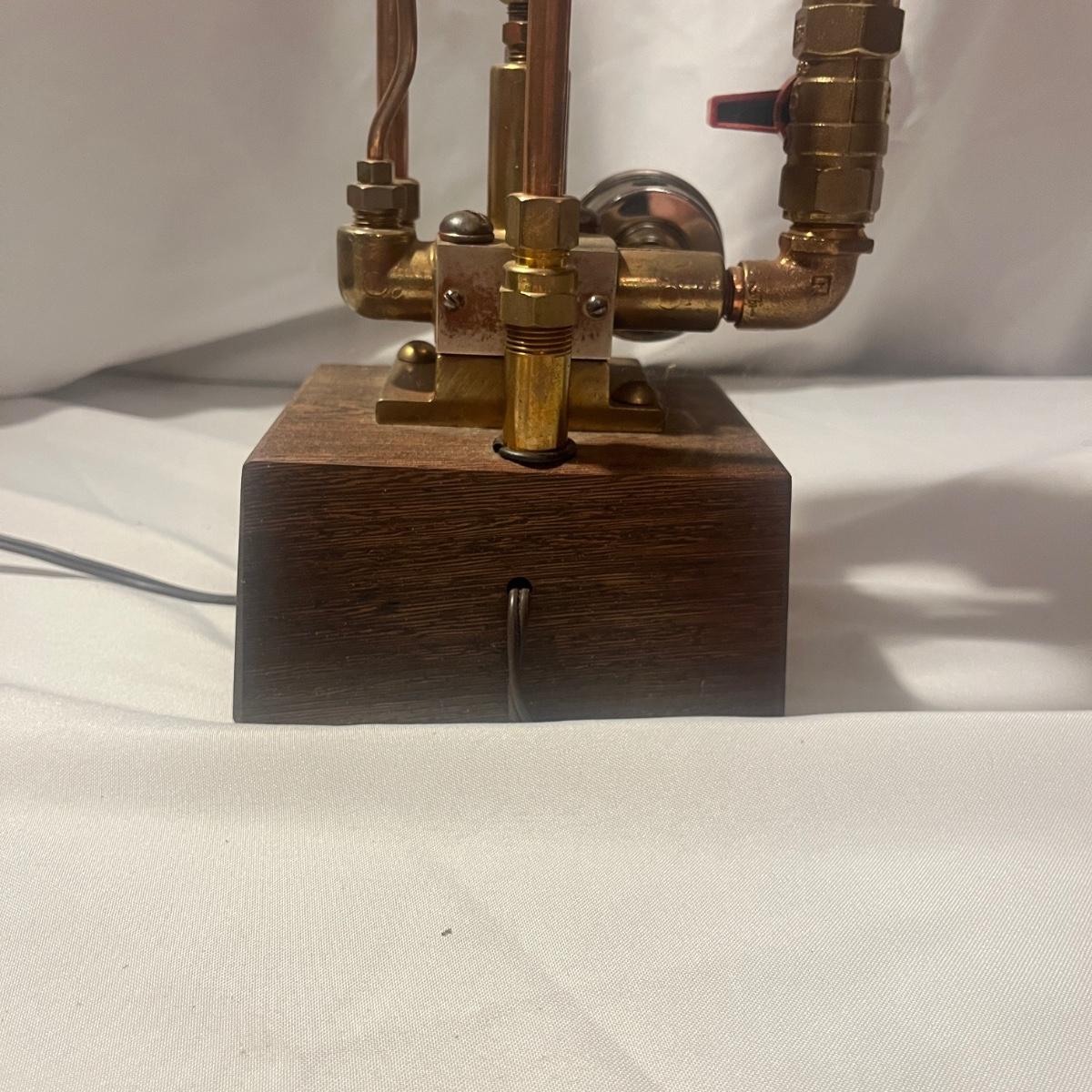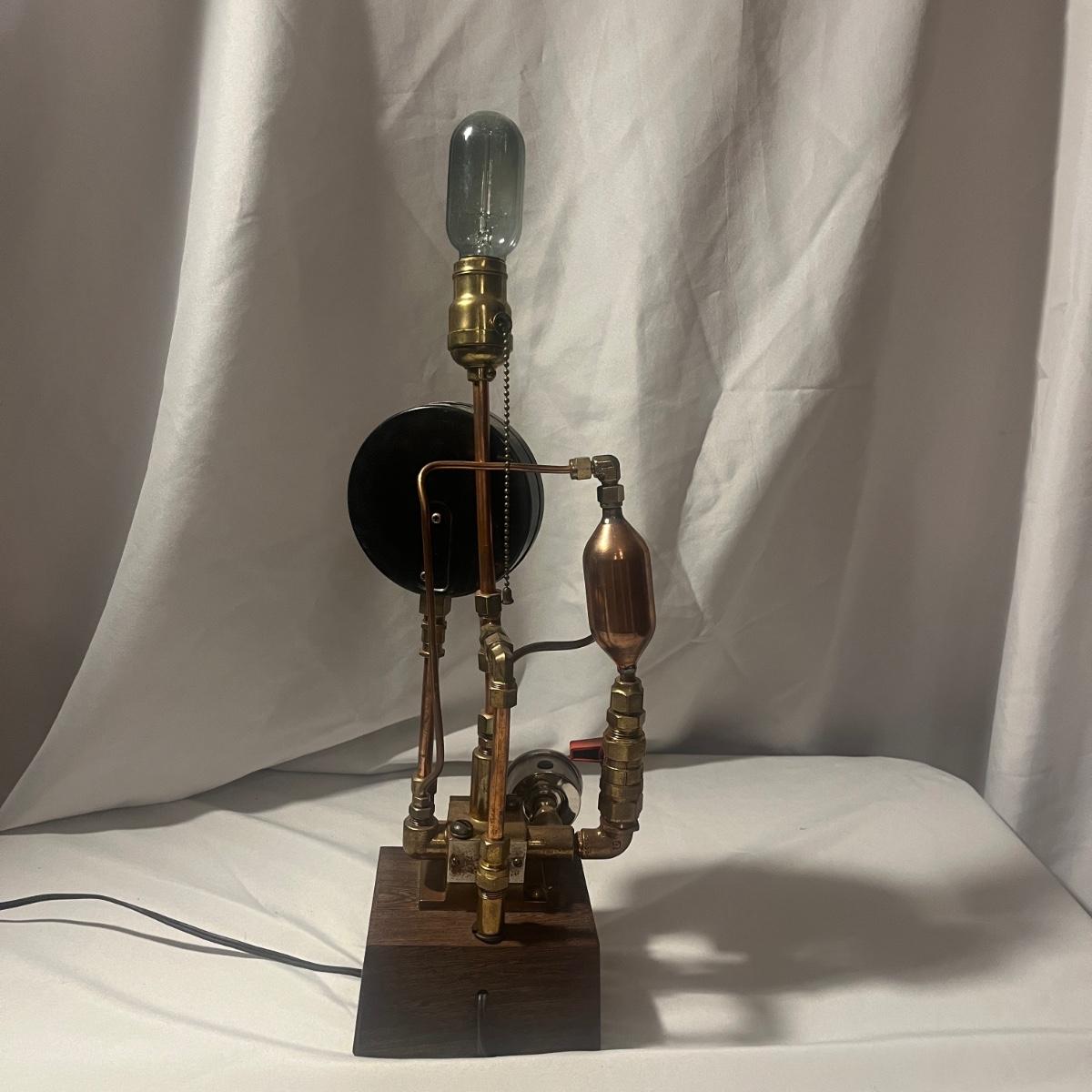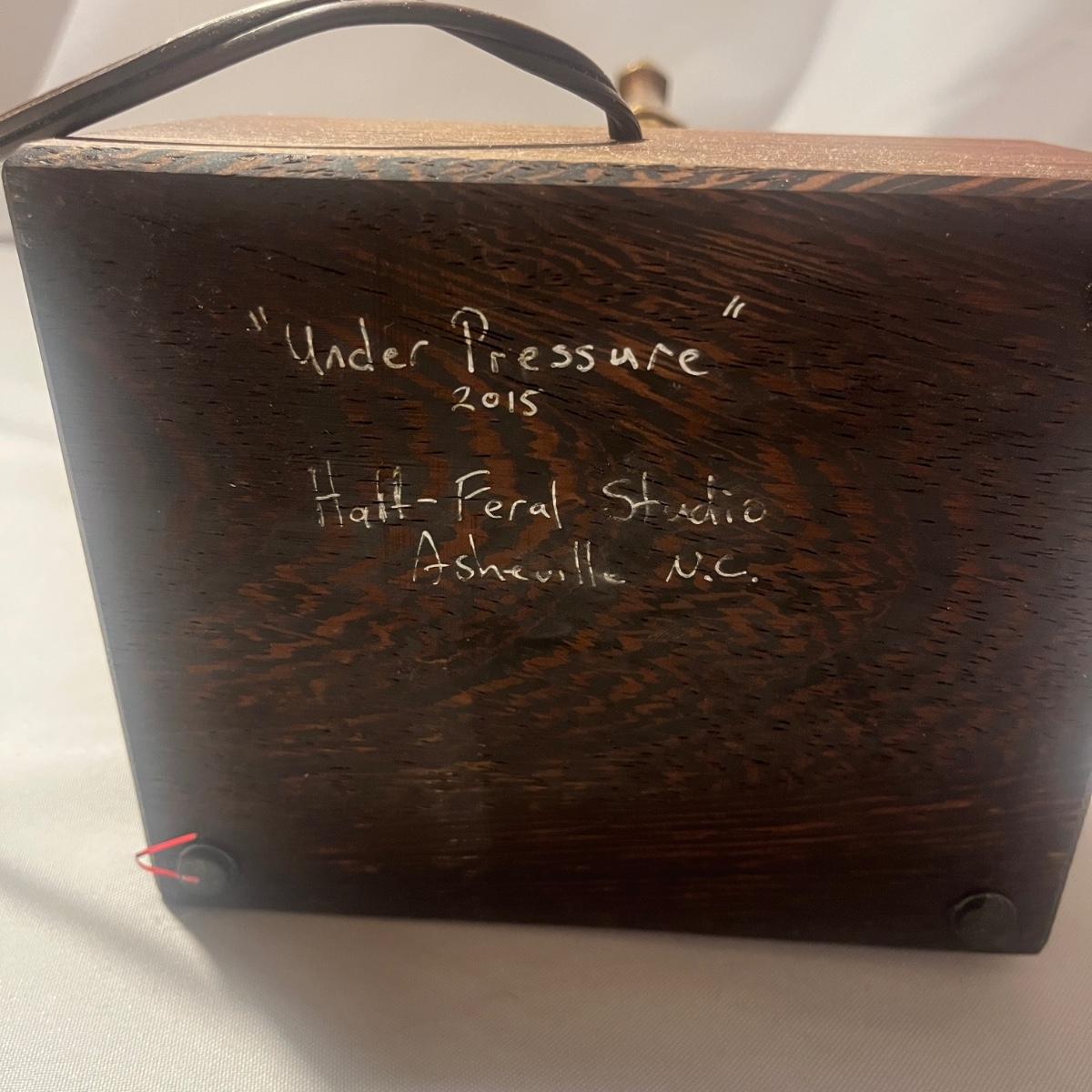 This unique steampunk style table lamp by artist Graeme Priddle is titled “Under Pressure” and measures 6.5” x 5” x 22”H. Lamp powered on when plugged in, single on-off pull chain.Also includes one extra Edison bulb.