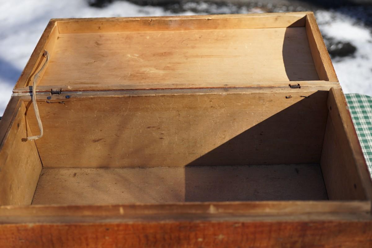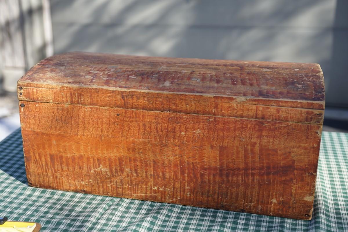 this is simple smaller style dome top chest. It does not have any hardware . needs slight cleaning restoration/polish. there is some paint missing from wear. the interior is natural wood.