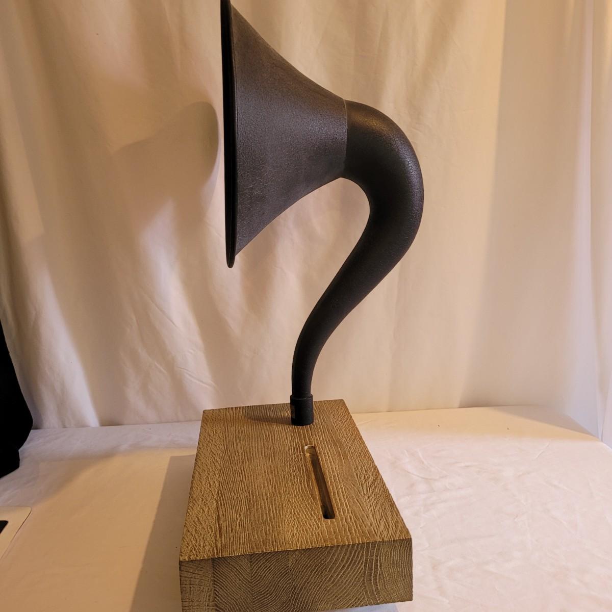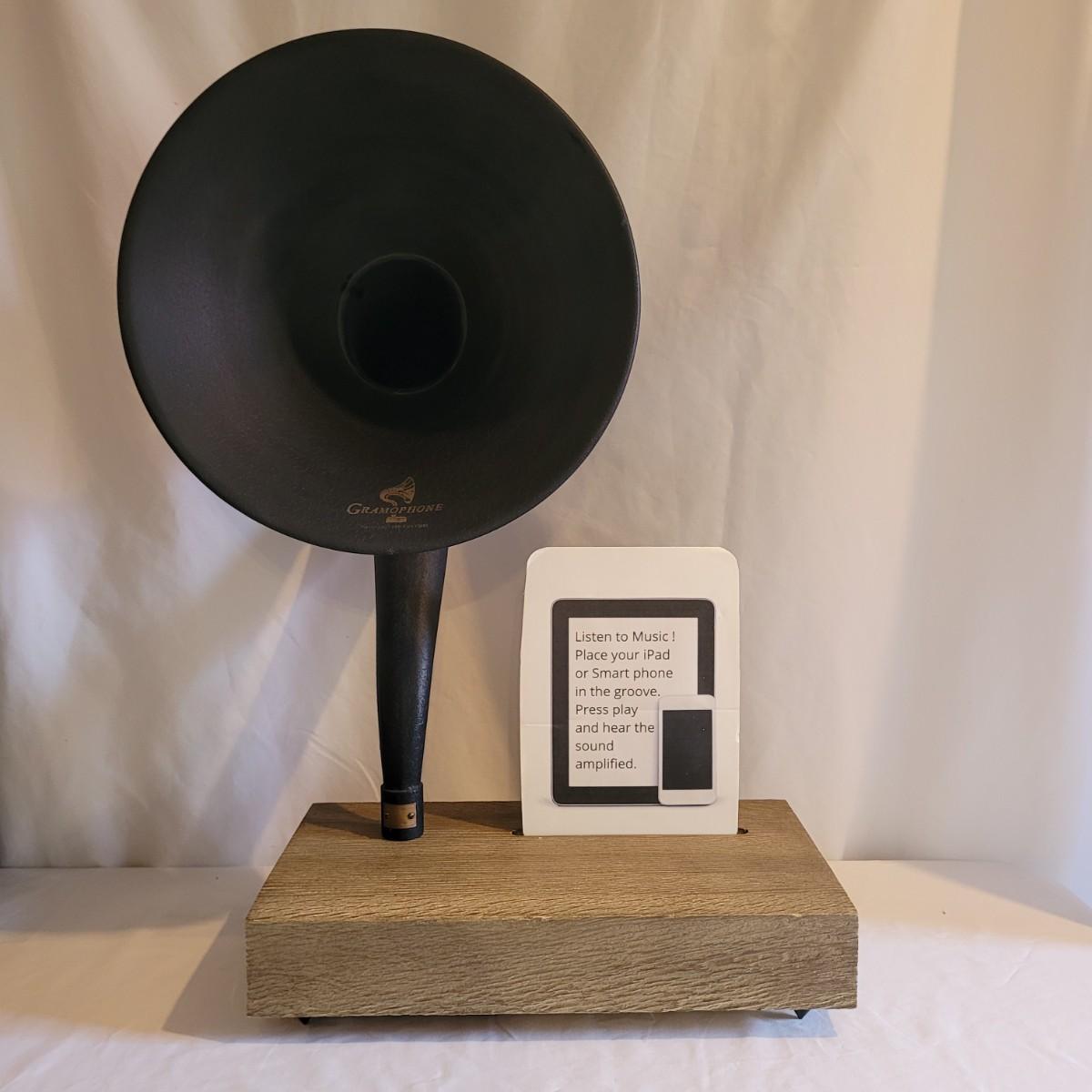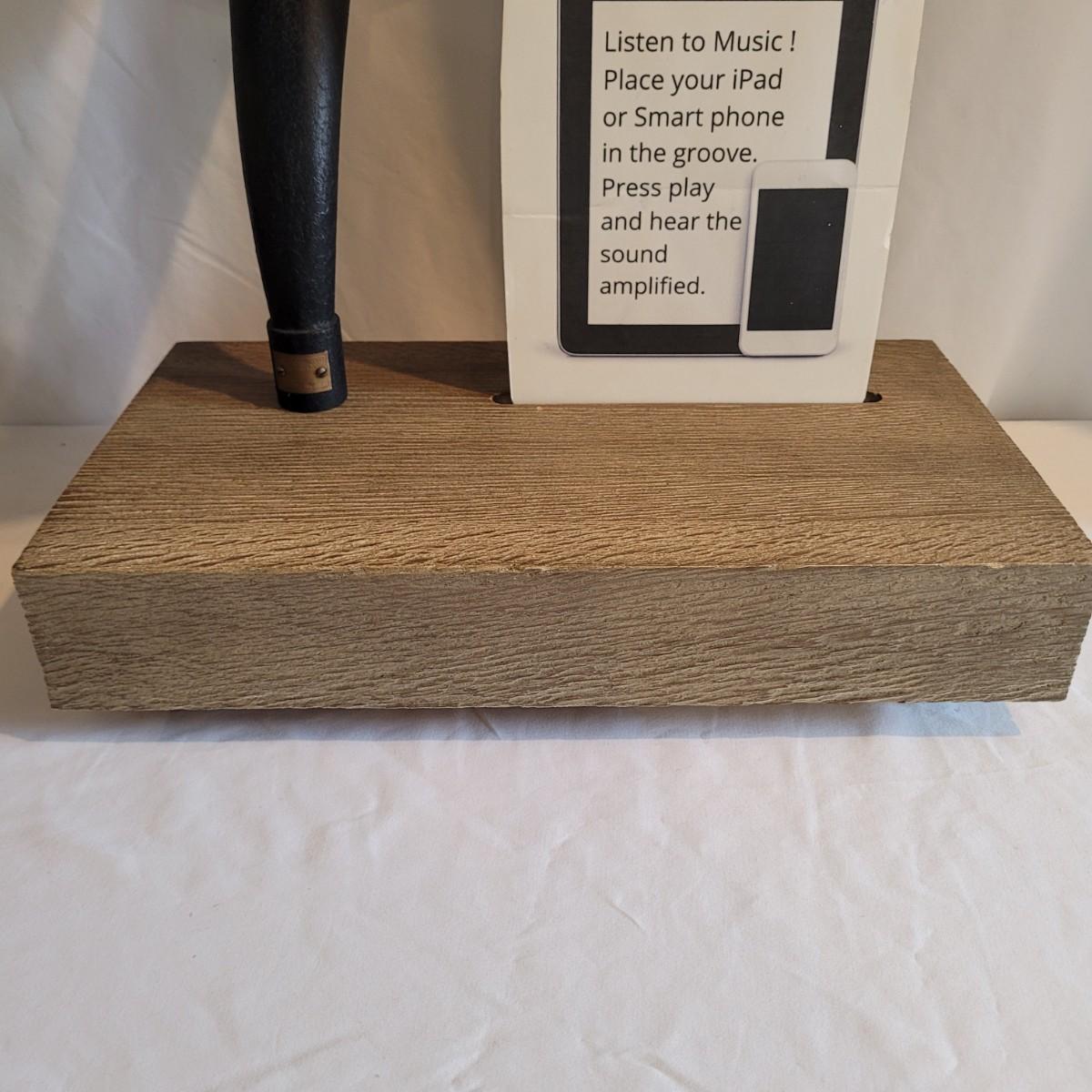 This auction is for a restoration hardware Gramophone speaker for a phone or MP3 player. It is designed to amplify sound acoustically, without electricity. The design is based on early 20th century gramophones. The base is made of solid wood, and the horn is made of metal. It increases the volume of the device by placing it in the slot. item measures 16.5" x 9" x 27"H.