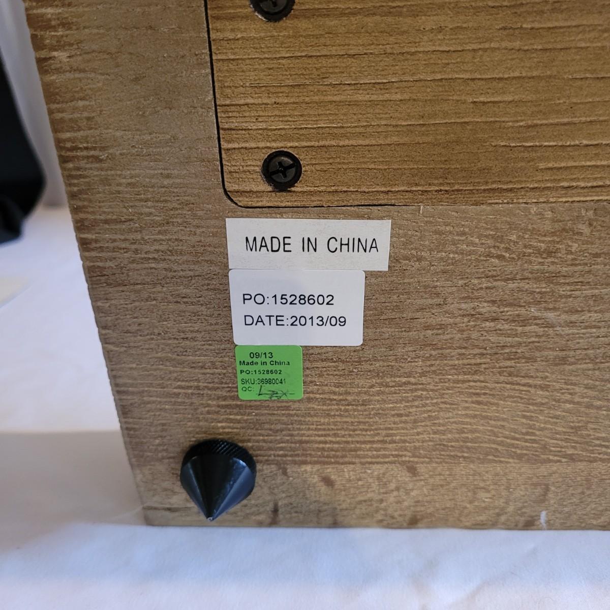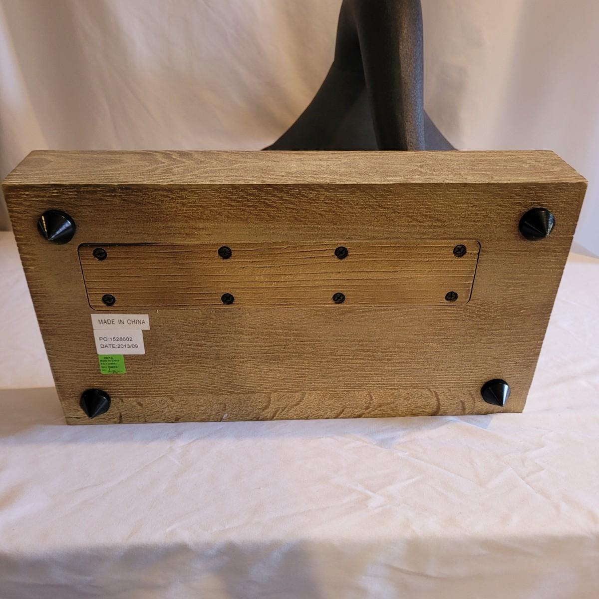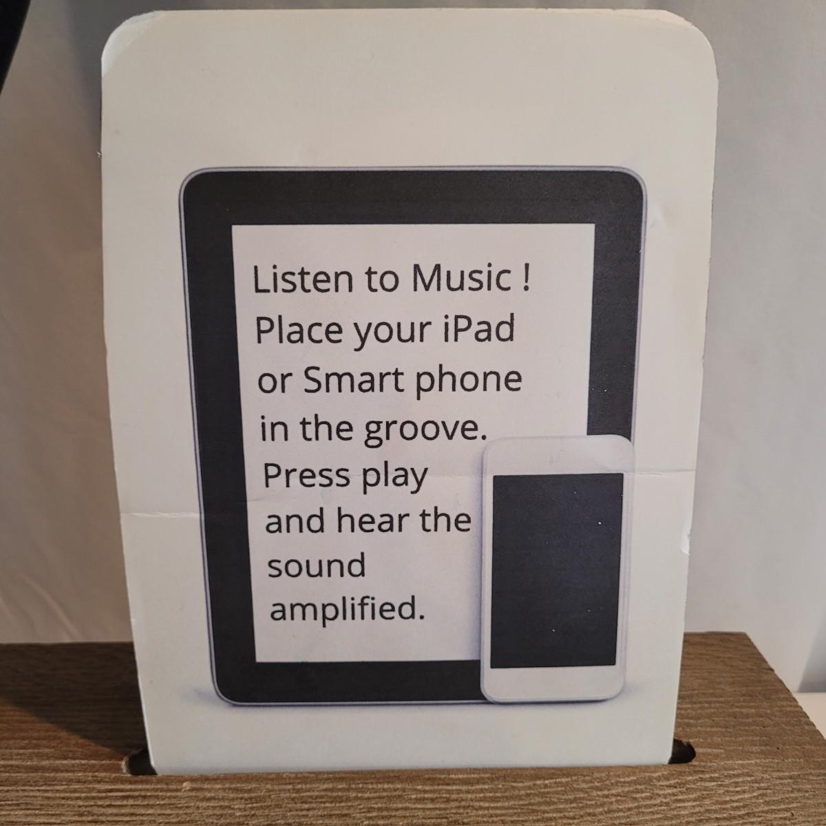 This auction is for a restoration hardware Gramophone speaker for a phone or MP3 player. It is designed to amplify sound acoustically, without electricity. The design is based on early 20th century gramophones. The base is made of solid wood, and the horn is made of metal. It increases the volume of the device by placing it in the slot. item measures 16.5" x 9" x 27"H.