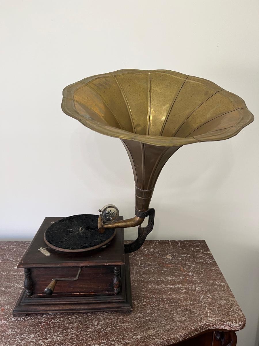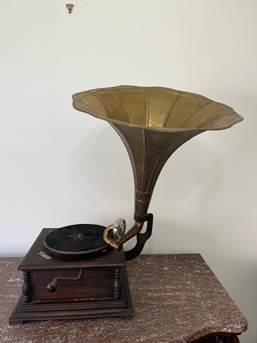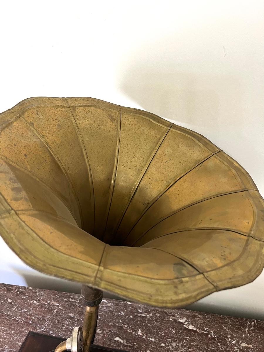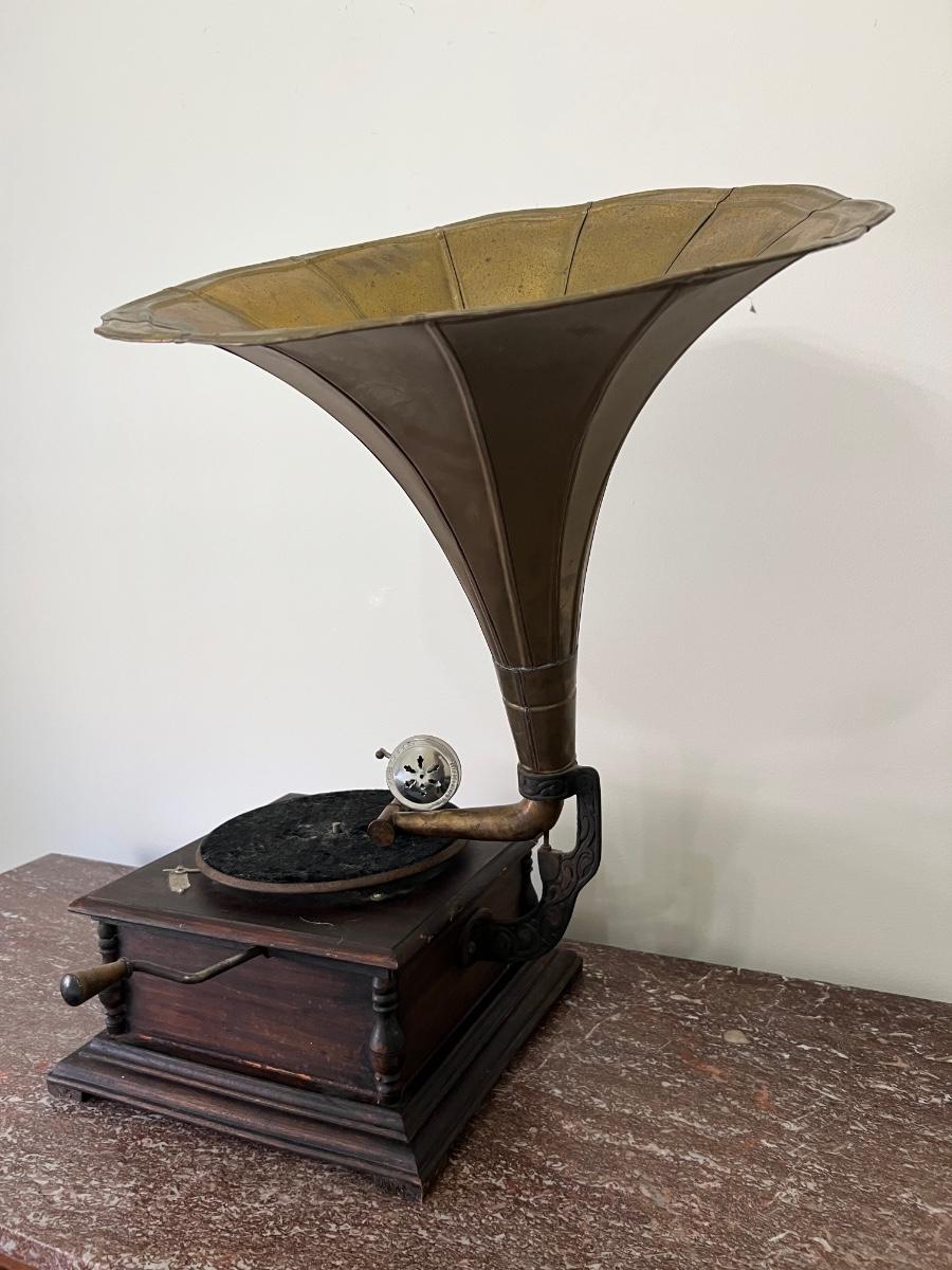 Gramophone Antique His masters voice with brass top. Measures 28 1/2 inches tall proximately approximately 18 inches wide, approximately 27 inches deep. This has not been tested and is being sold as a home decor piece.