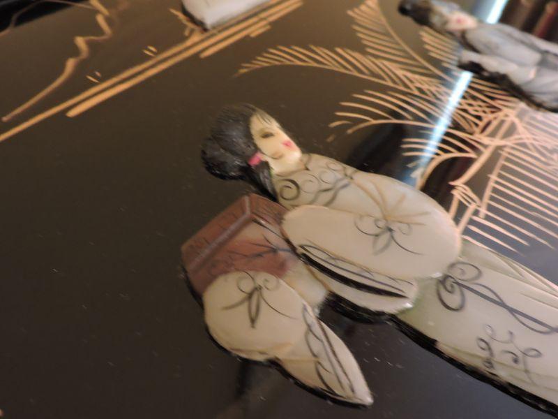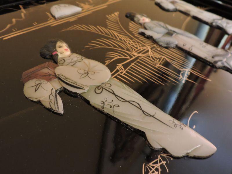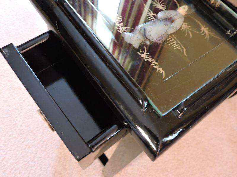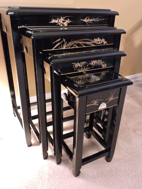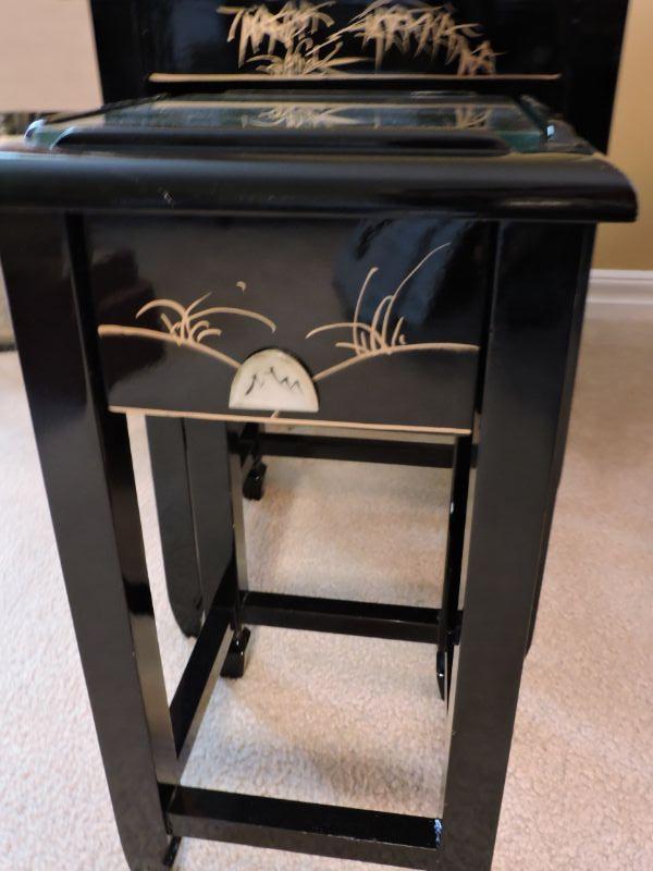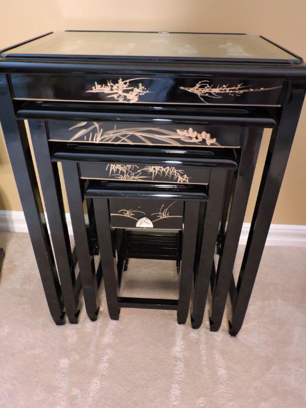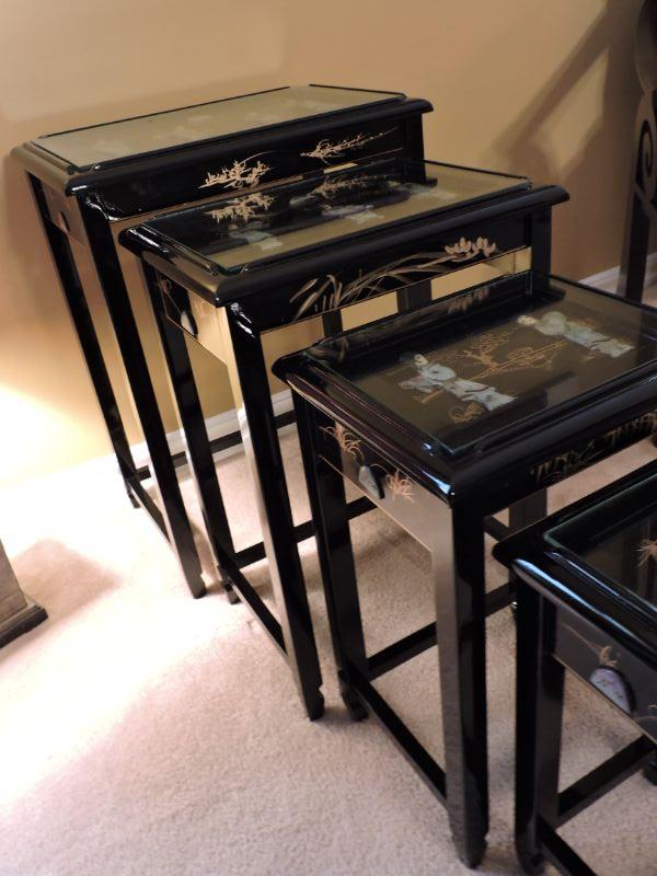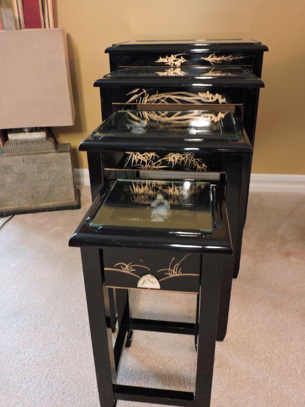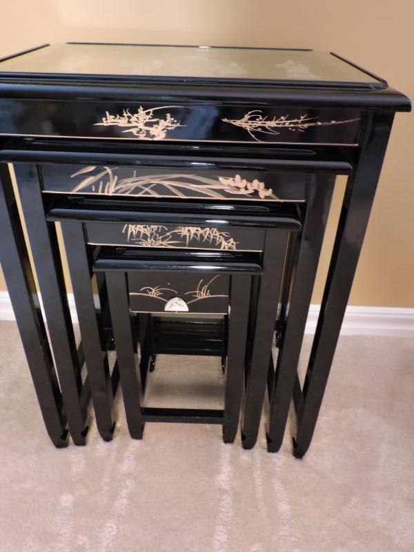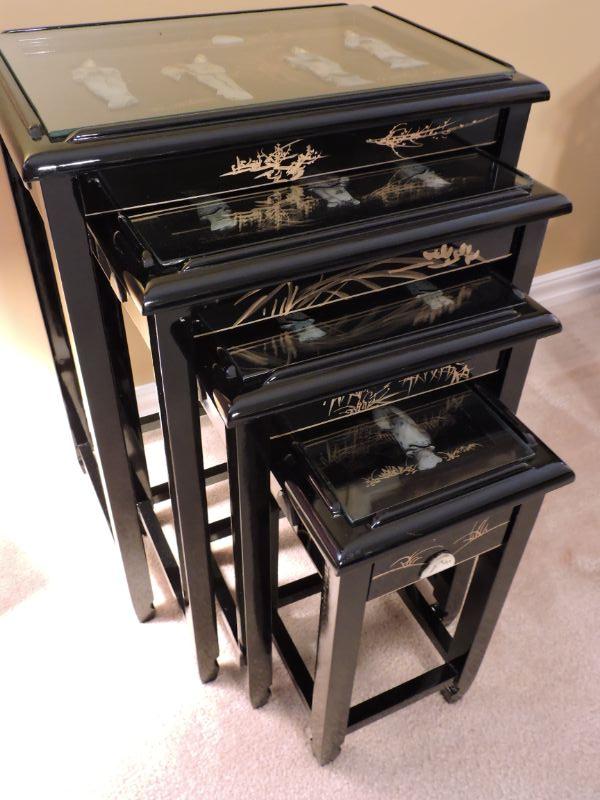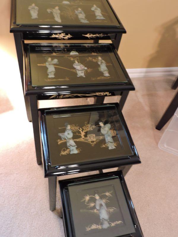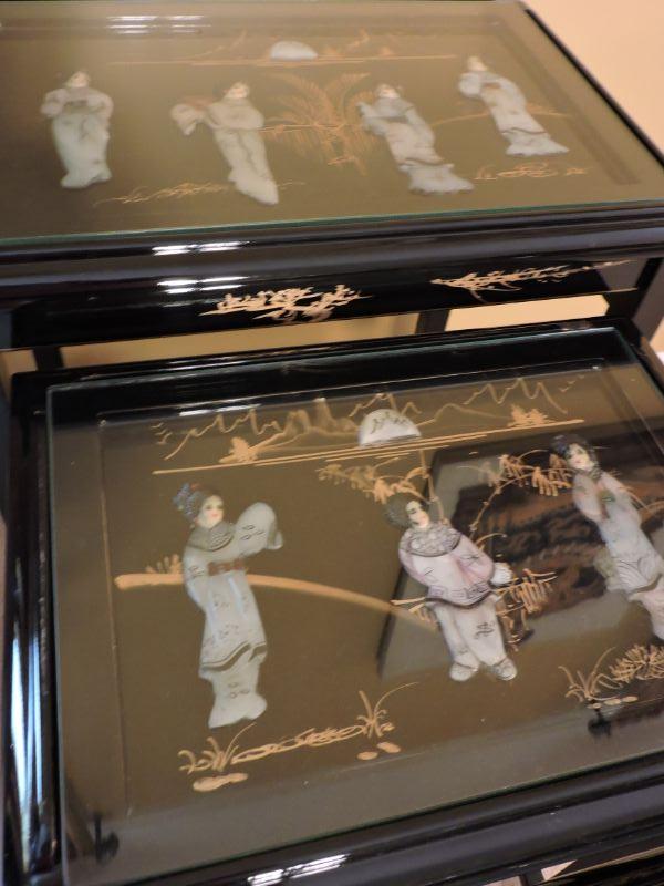 Grand International Nesting Table Set with Mother of Pearl and with Glass Top. Tables range in height from 17"-26" **Please read Terms and Conditions before placing a bid. Pick up is Wednesday, September 25 from 4pm to 7pm and Saturday, September 28 from 9am to 1pm in Williamstown, NJ. All sales are final. All sales are as is, where is. Please review all photos. Any props included in photos are not included in listing. All measurements are approximate.