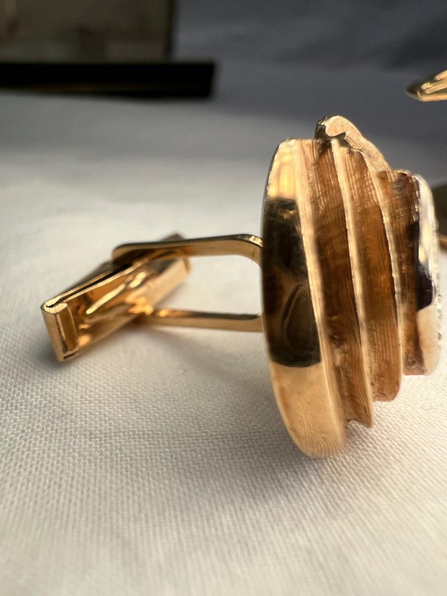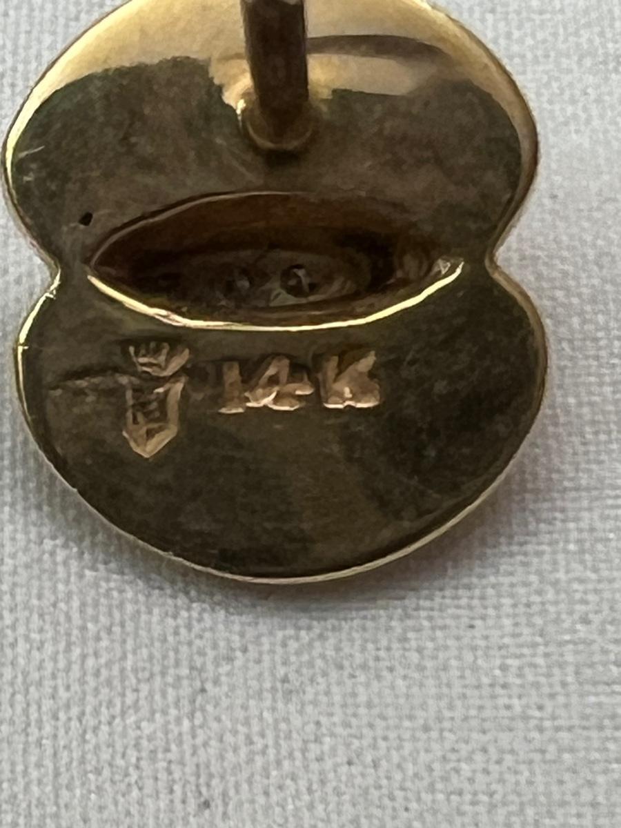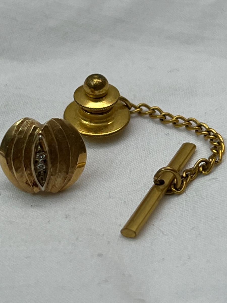 This three piece set includes a pair of cufflinks and tie tack. All pieces are marked 14K (stamps on cufflinks are a little worn) and have diamonds that tested positive on our tester. Green velvet like case is included.