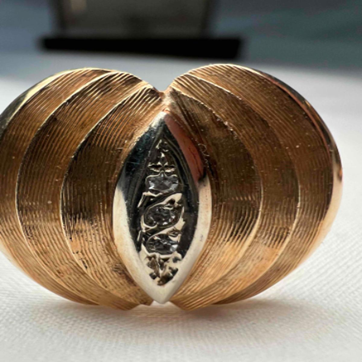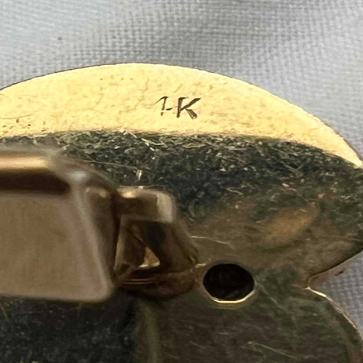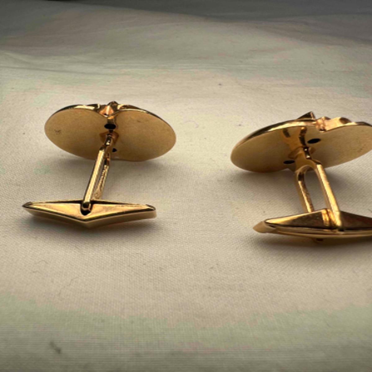 This three piece set includes a pair of cufflinks and tie tack. All pieces are marked 14K (stamps on cufflinks are a little worn) and have diamonds that tested positive on our tester. Green velvet like case is included.