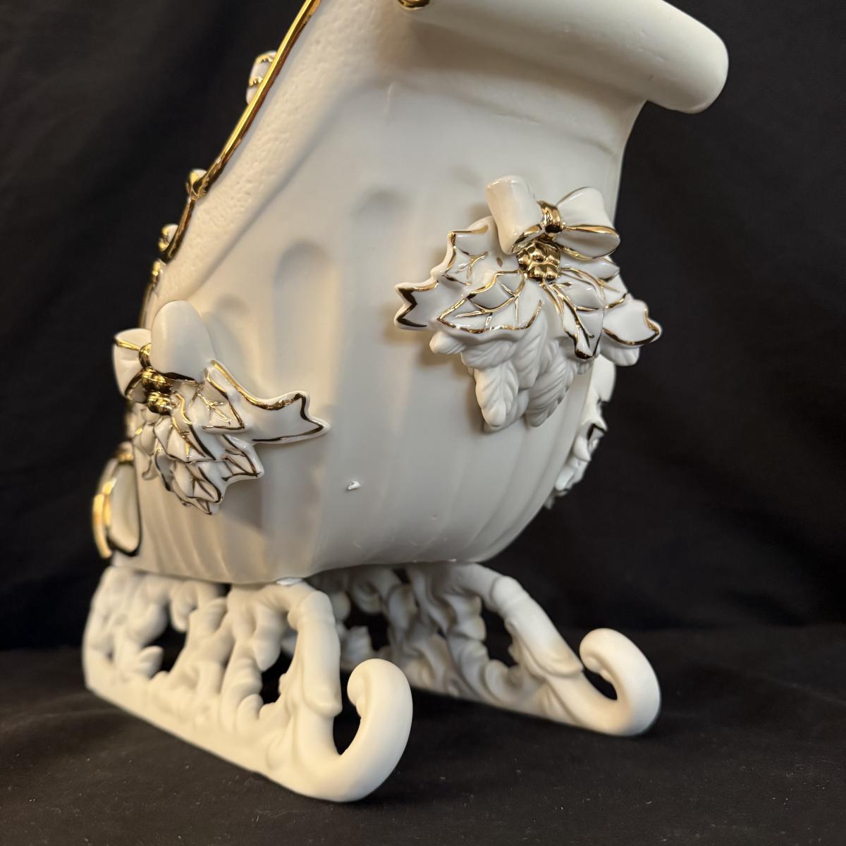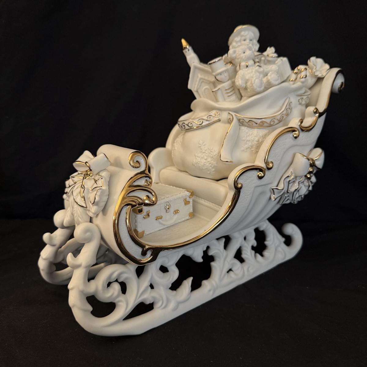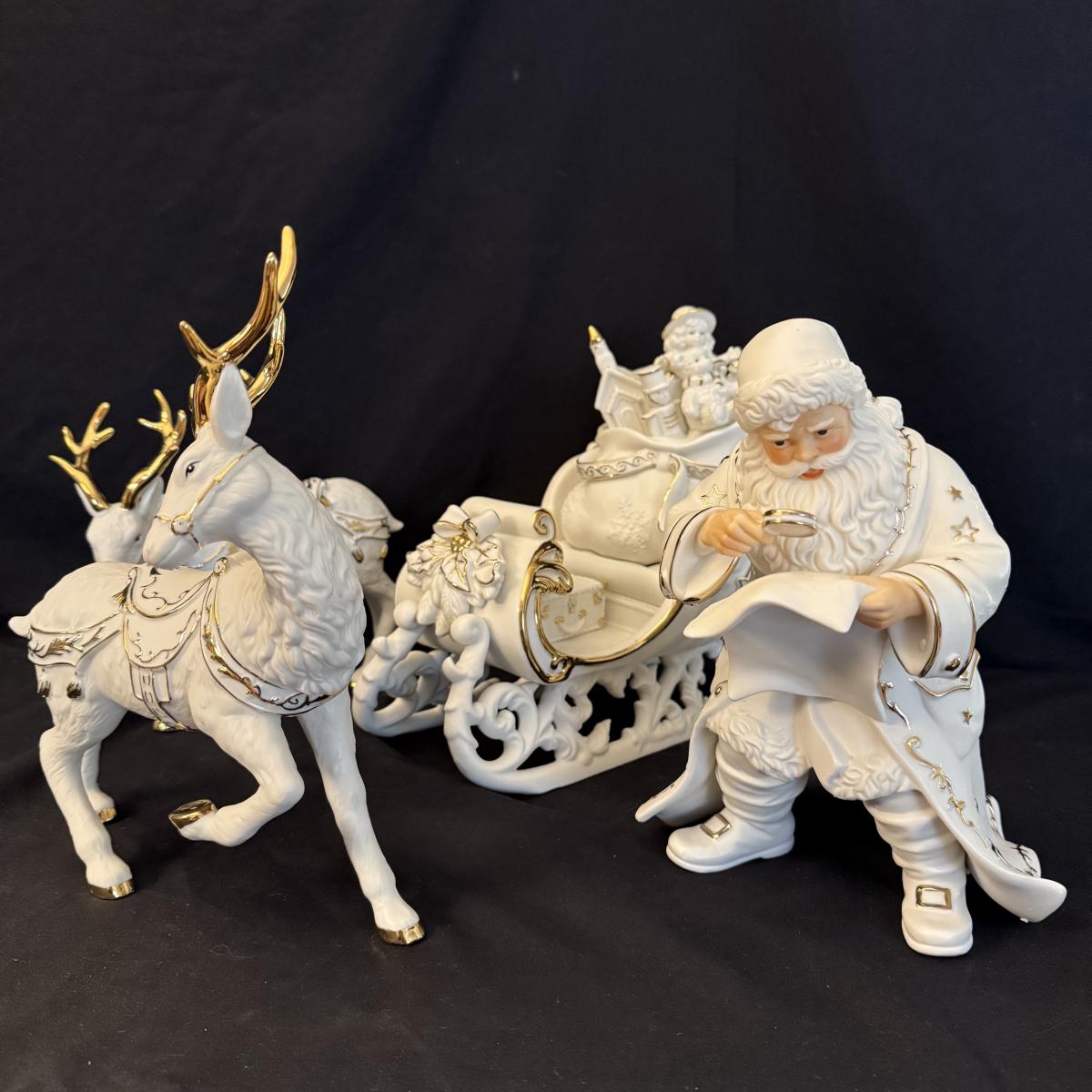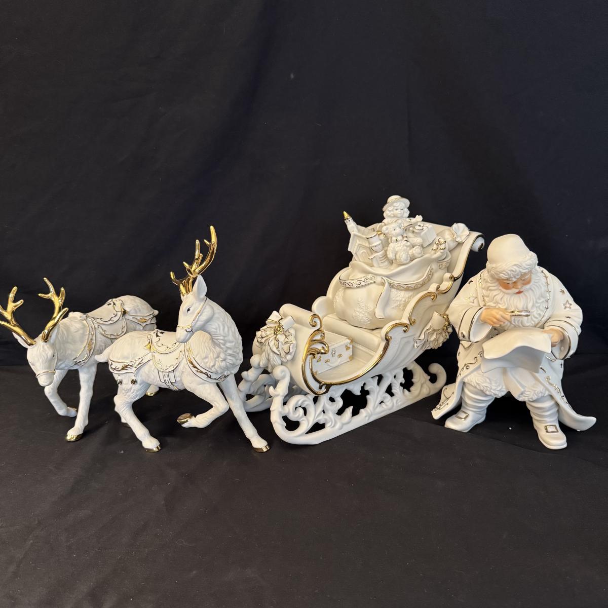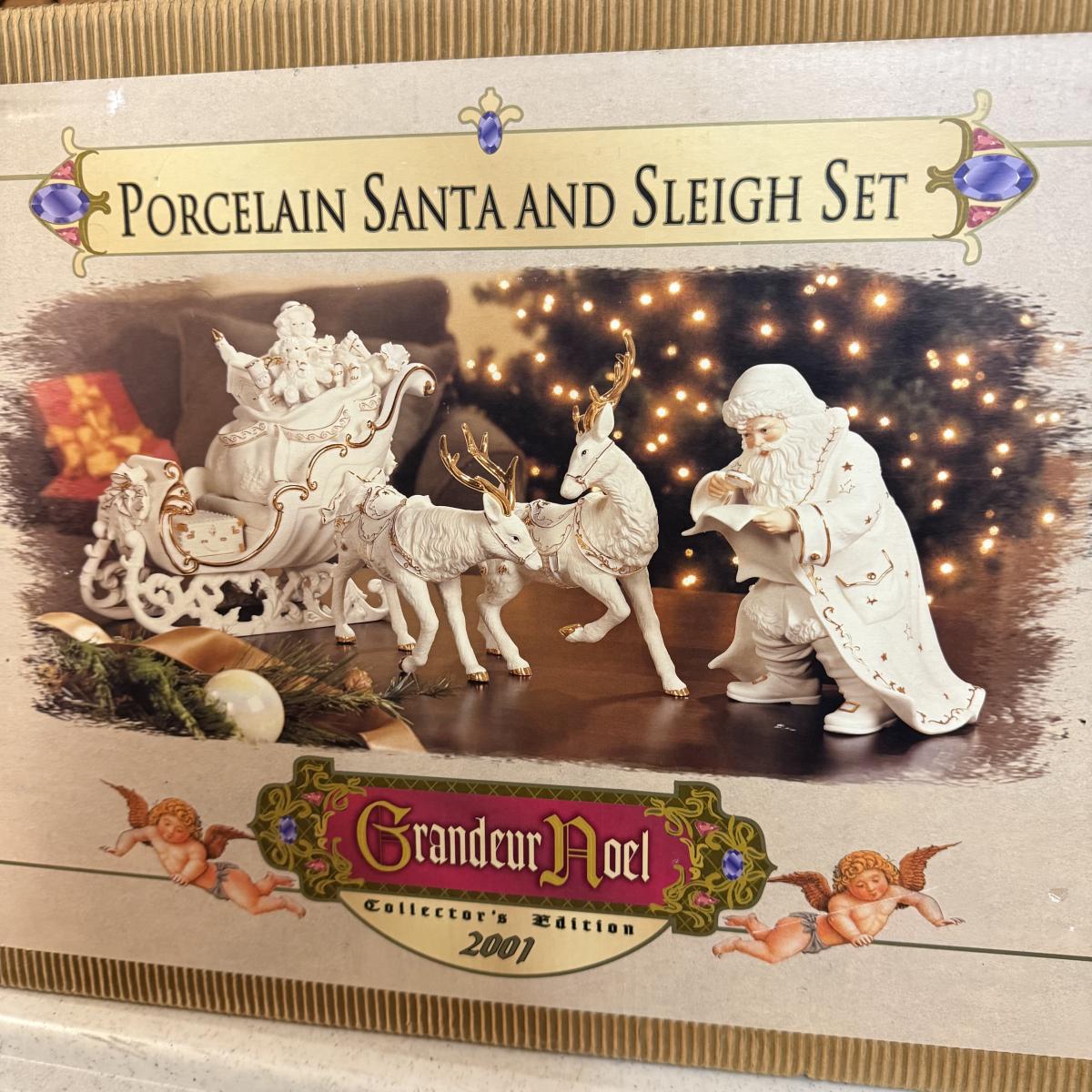 Grandeur Noel Porcelain Santa and Sleigh set comes in its original box encased in styrofoam. Set includes Santa, a sleigh full of toys, and two reindeer. The porcelain figurines are accented in metallic gold. The sleigh measures approximately 14” x 7.5” x 11”H. Two of the toys have broken off; their pieces are included and can be glued back on.