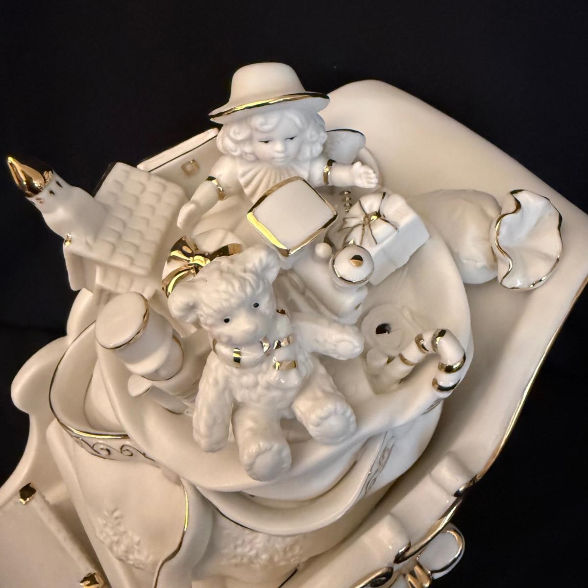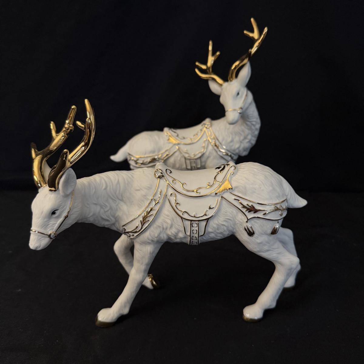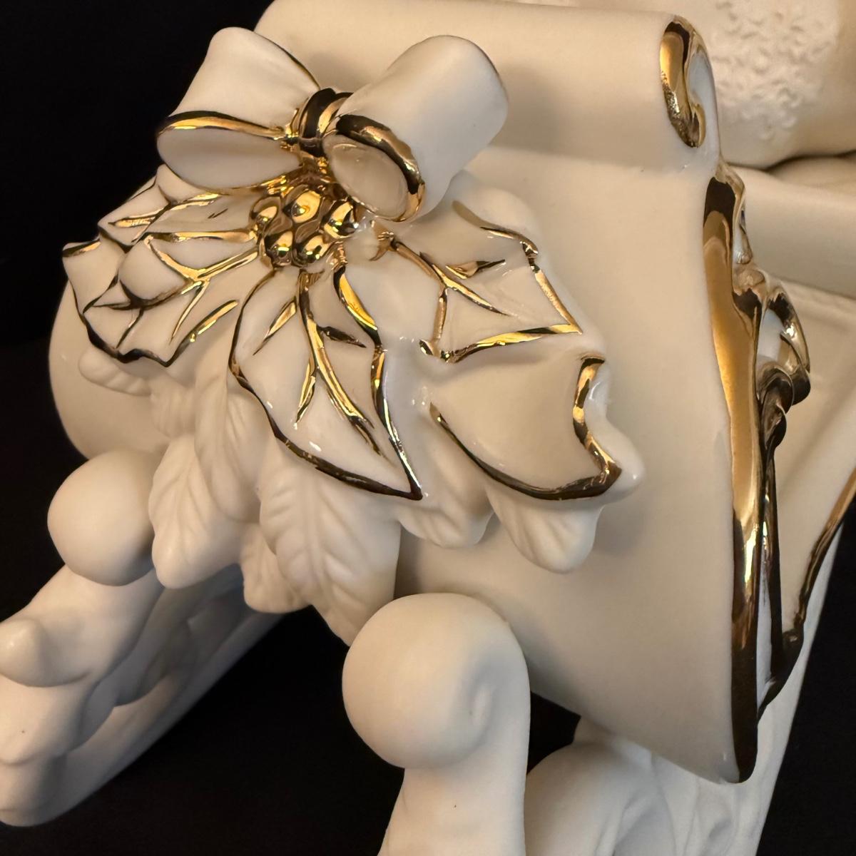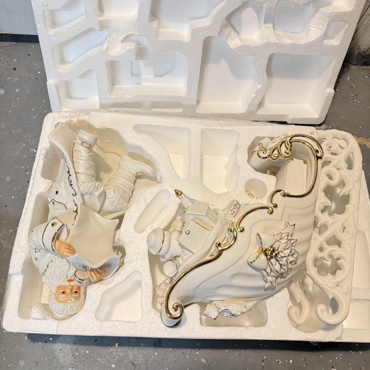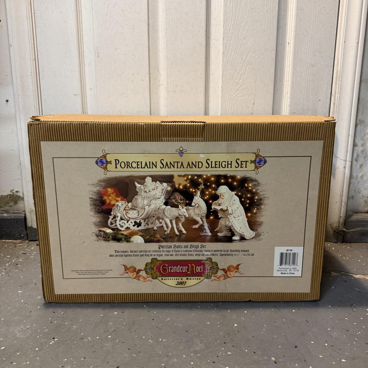 Grandeur Noel Porcelain Santa and Sleigh set comes in its original box encased in styrofoam. Set includes Santa, a sleigh full of toys, and two reindeer. The porcelain figurines are accented in metallic gold. The sleigh measures approximately 14” x 7.5” x 11”H. Two of the toys have broken off; their pieces are included and can be glued back on.